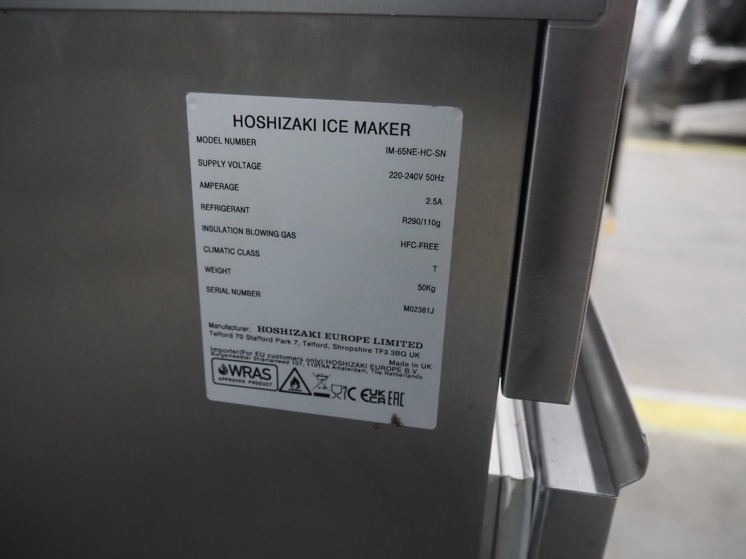 Hoshizaki ice cube machine, model number: IM-65NE-HC-SN, serial number: M0238IJ, 220-240 V, 50 Hz, 2.5 A, refrigerant: R290/110 gram, weight: 50 kg, dimensions: 630 mm x 500 mm x 970 mm.