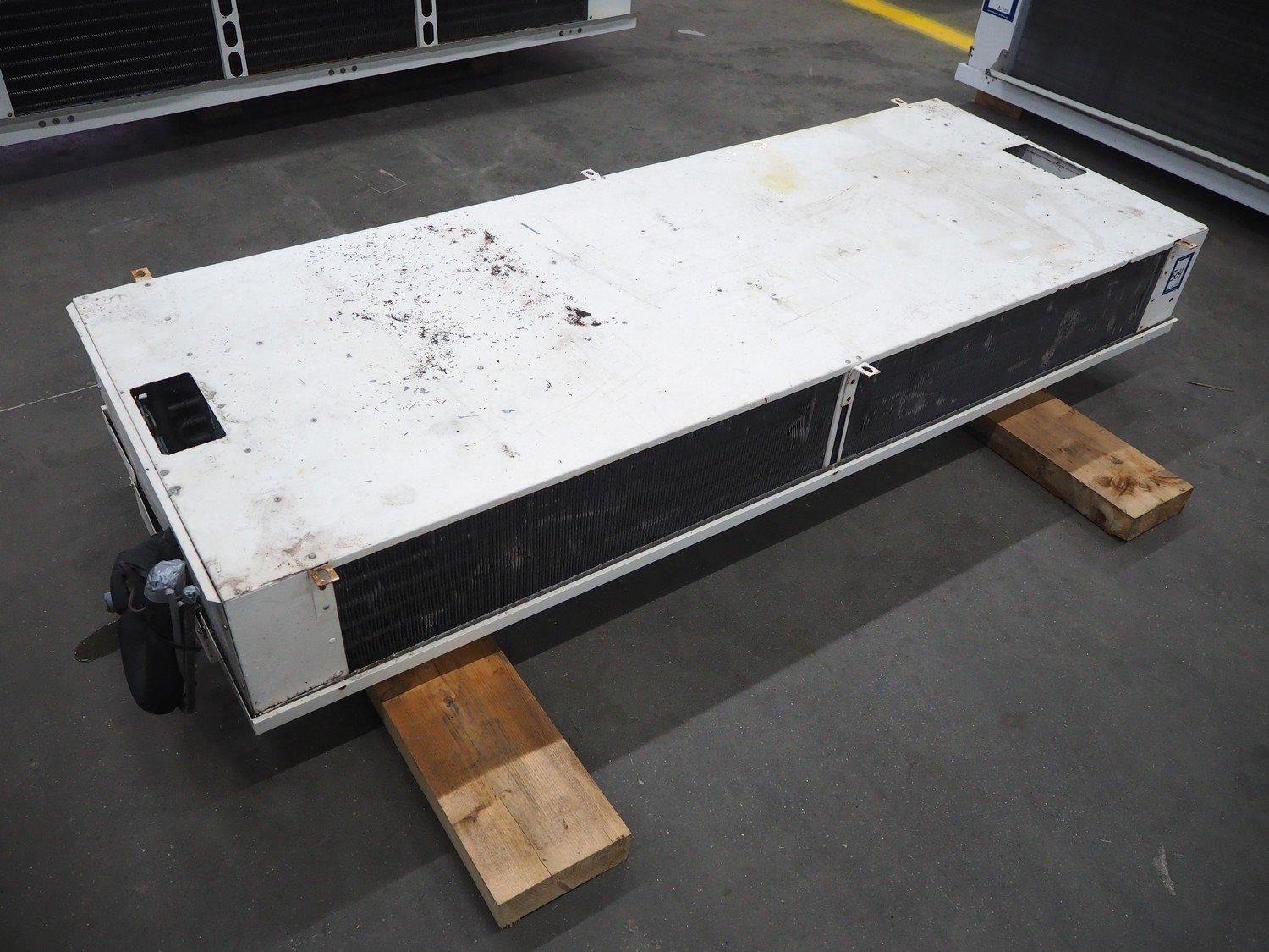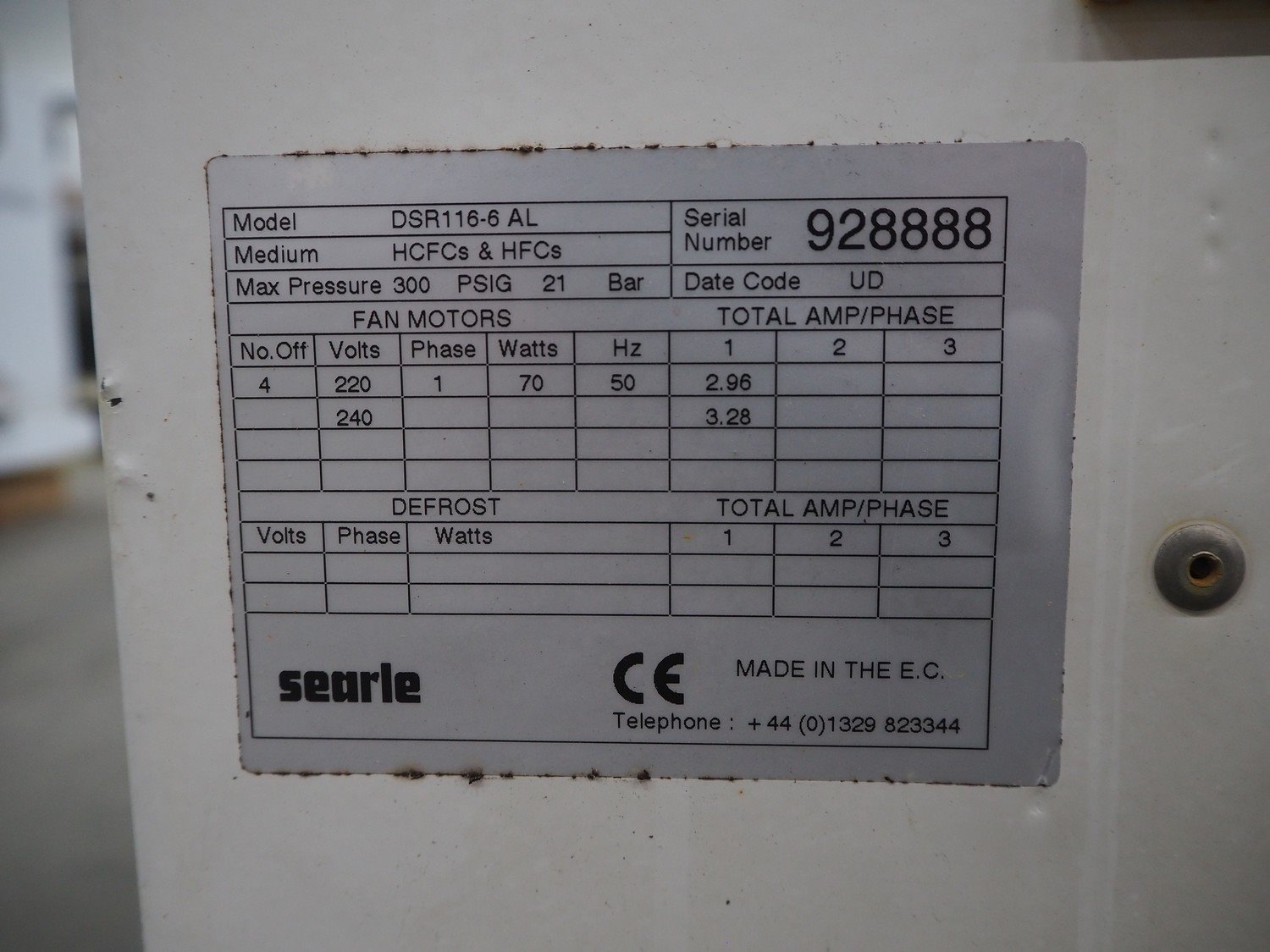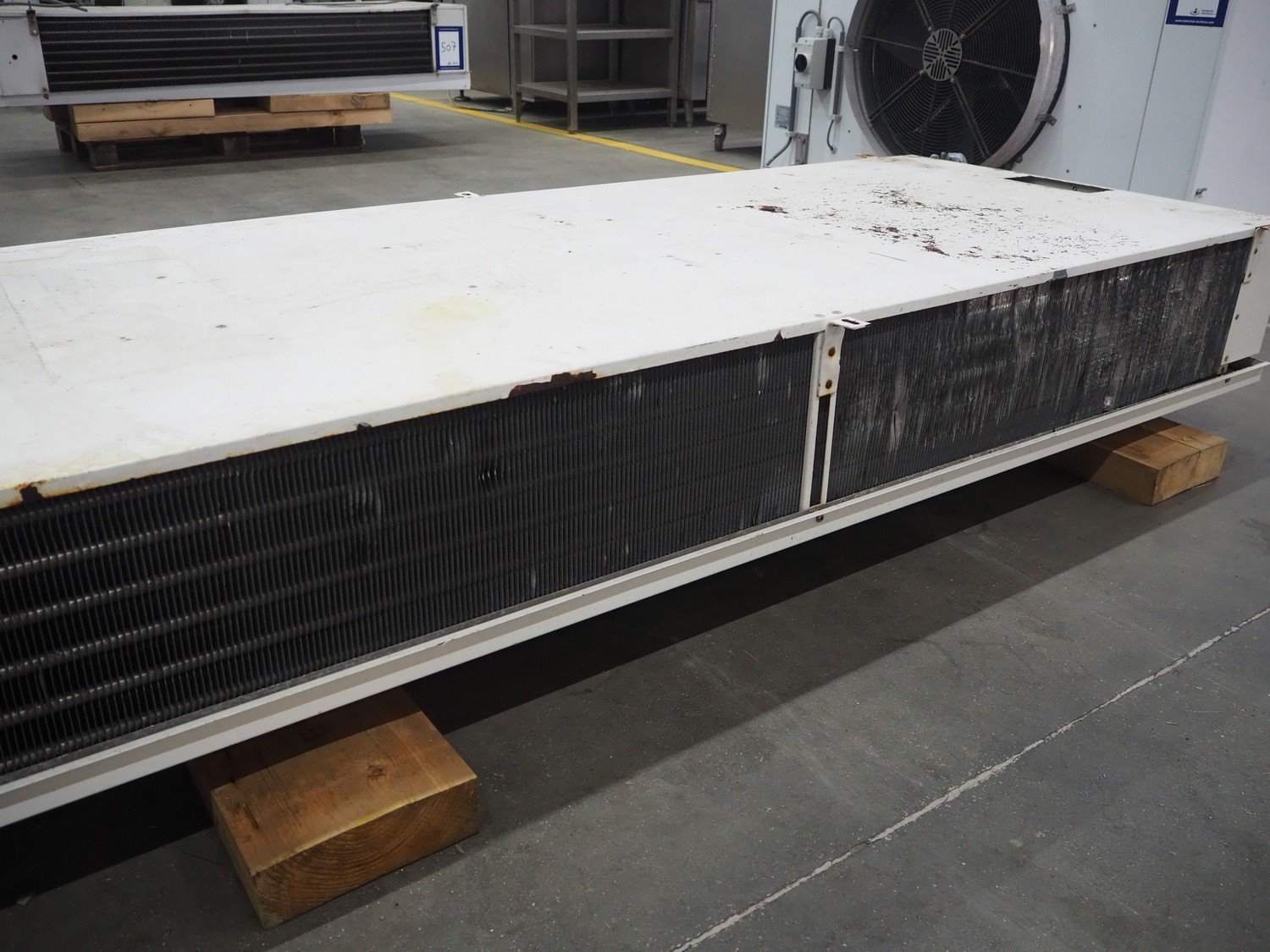 Searle evaporator, 2 fans, model: DSR116-6 AL, serial number: 928888, maximum work pressure: 21 bar, 220/240 V, 1 Ph, 50 Hz, 70 W, dimensions: 2530 mm x 950 mm x 450 mm.