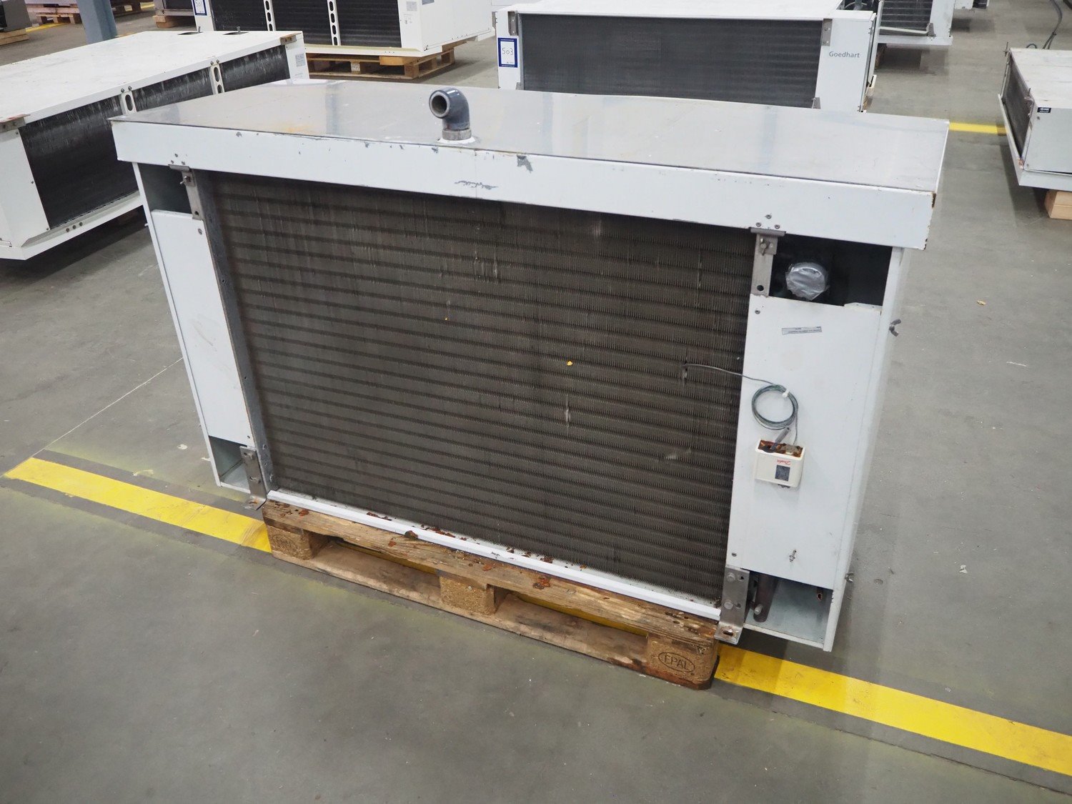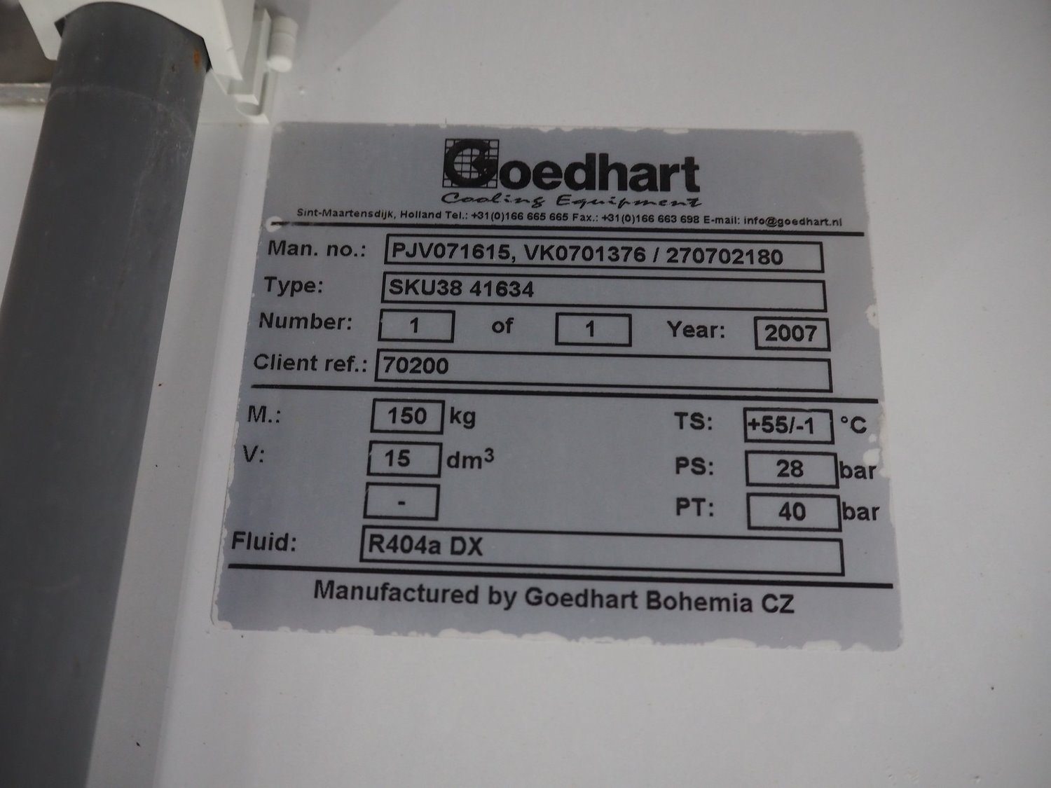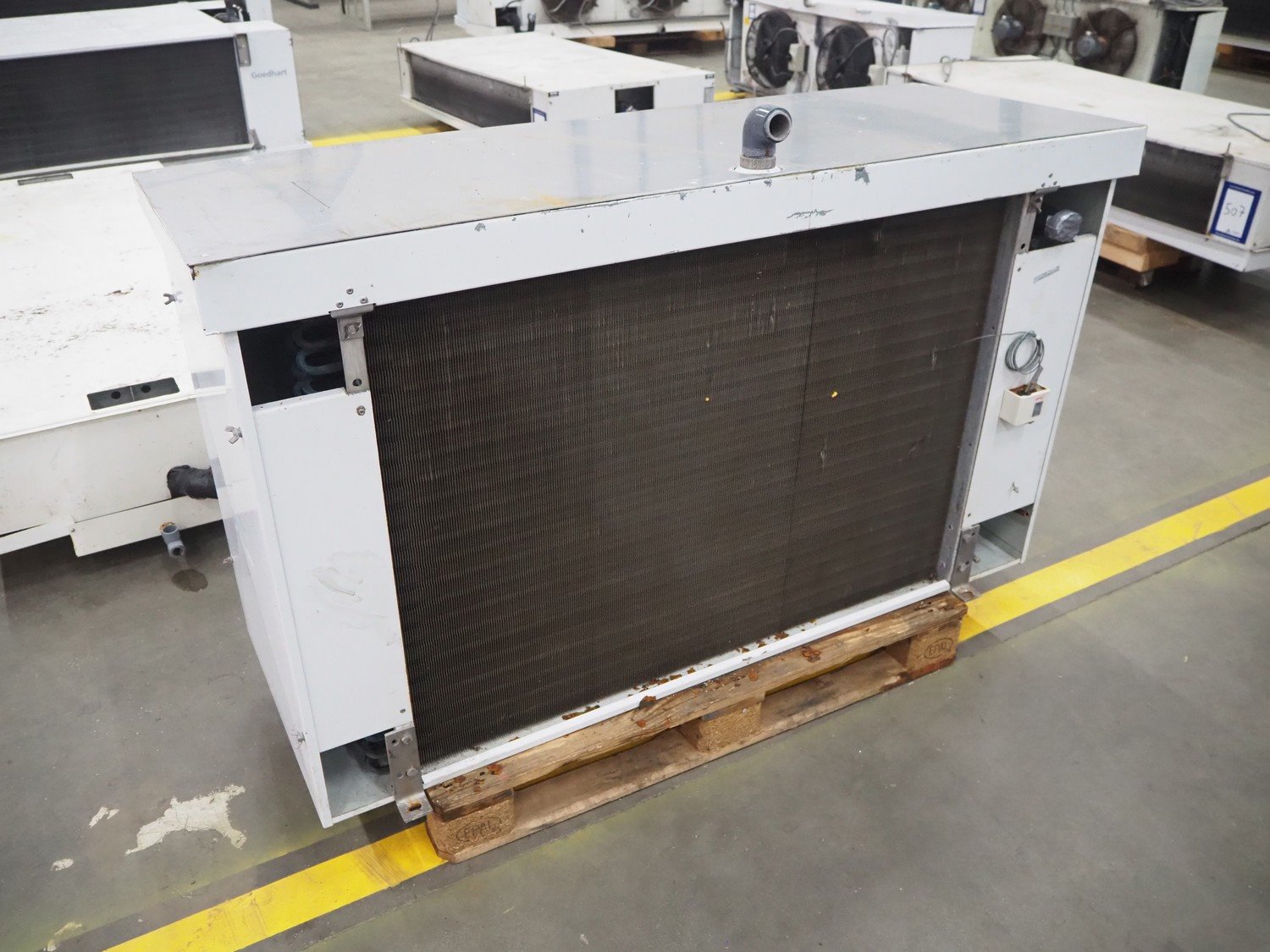 Goedhart evaporator, 1 fan, type: SKU38 41634, manufacturing number: PJV071615. VK0701376/270702180, year of construction: 2007, fluid: R404a, maximum work pressure: 28 bar, working temperature: +55/-1⁰C, volume: 15 dm³, dimensions: 1660 mm x 730 mm x 1080 mm.