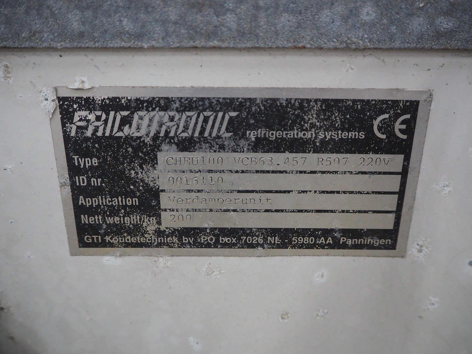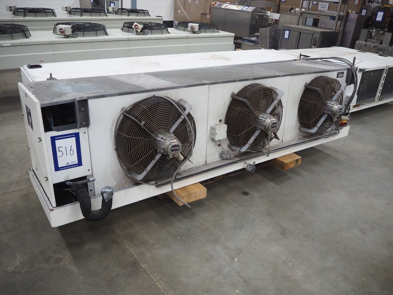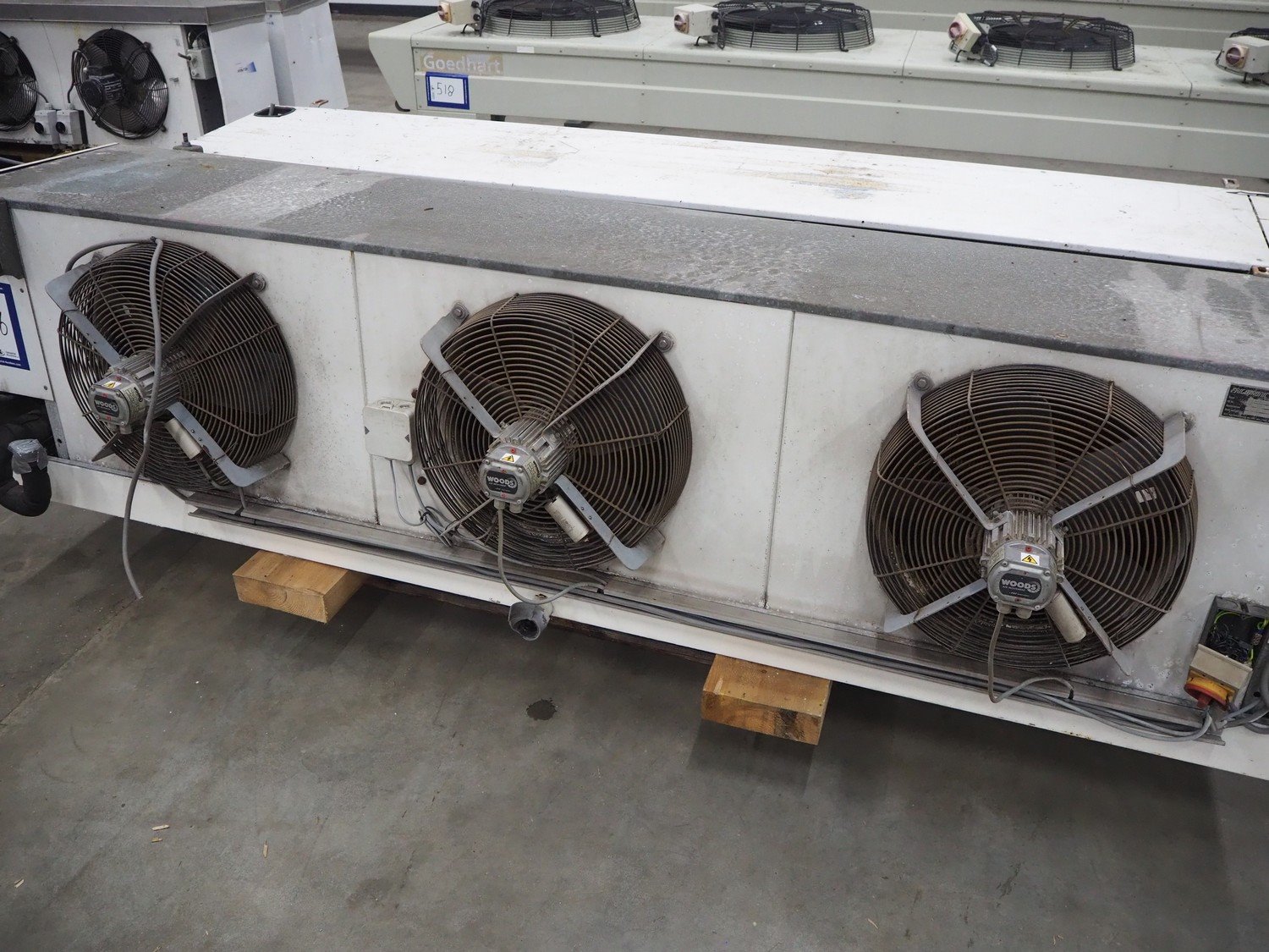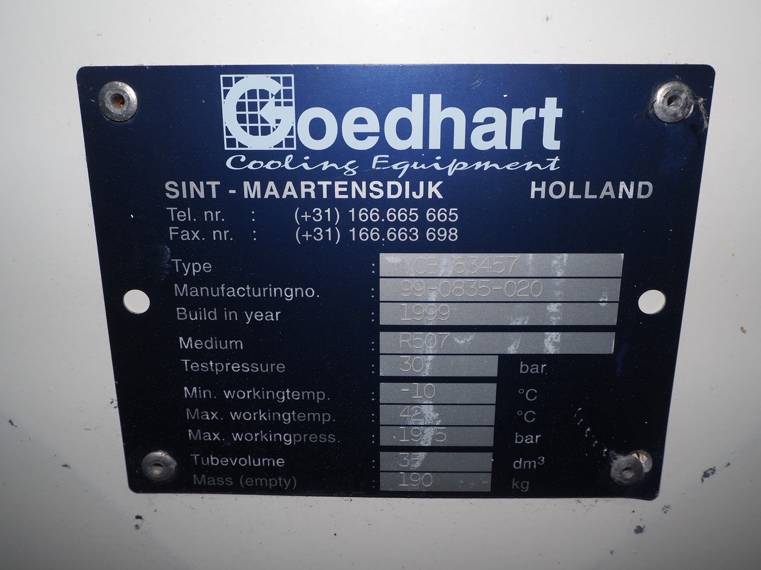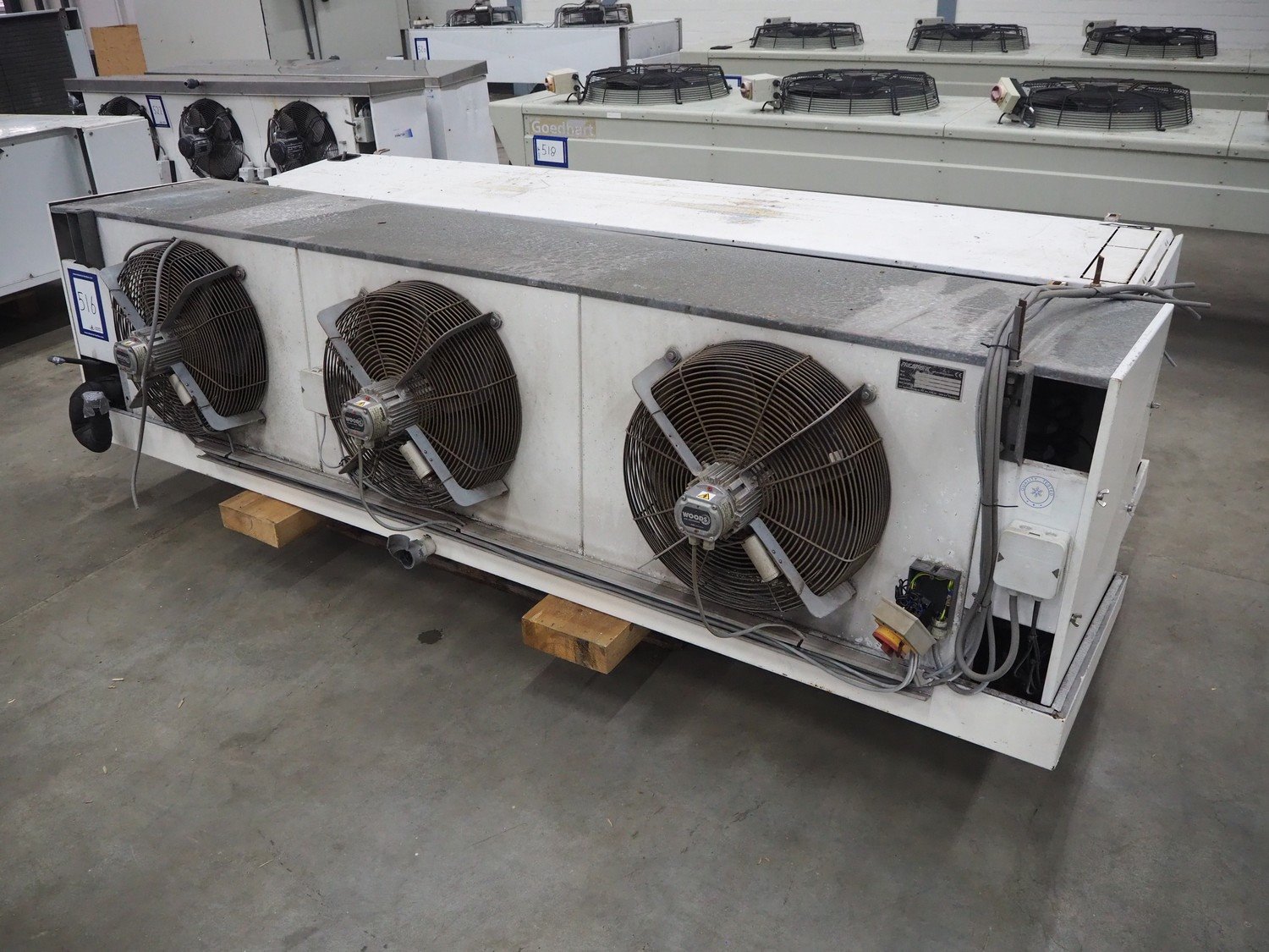 Goedhart evaporator, 3 fans, type: VCB 63457, manufacturing number: 99-0835-020, year of construction: 1999, maximum working temperature: -10/42 ⁰C, maximum working pressure: 19.5 bar, volume: 35 dm³, weight: 190 kg, dimensions: 2850 mm x 850 mm x 700 mm.