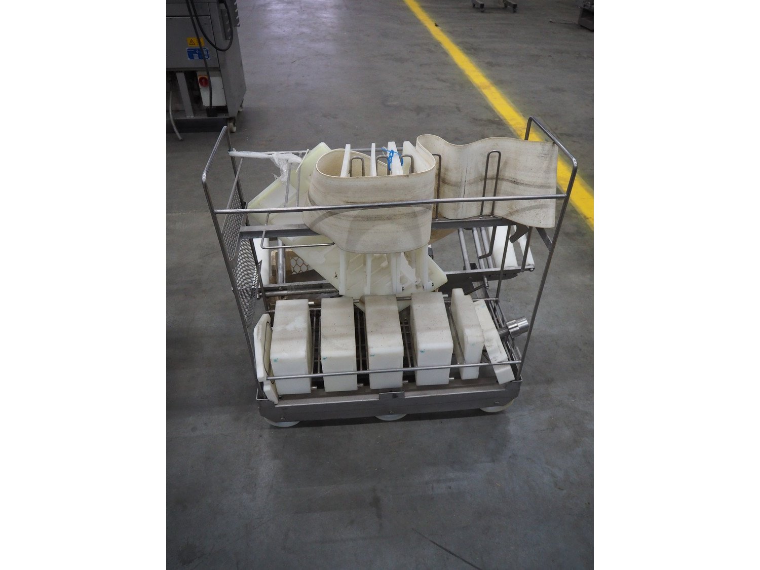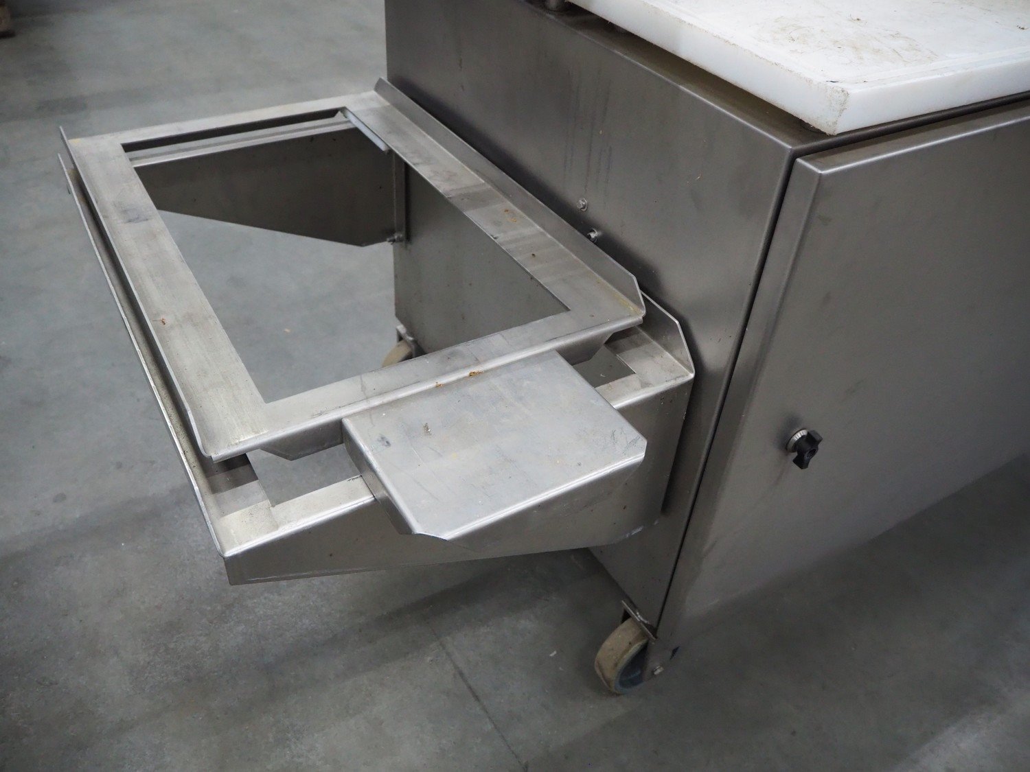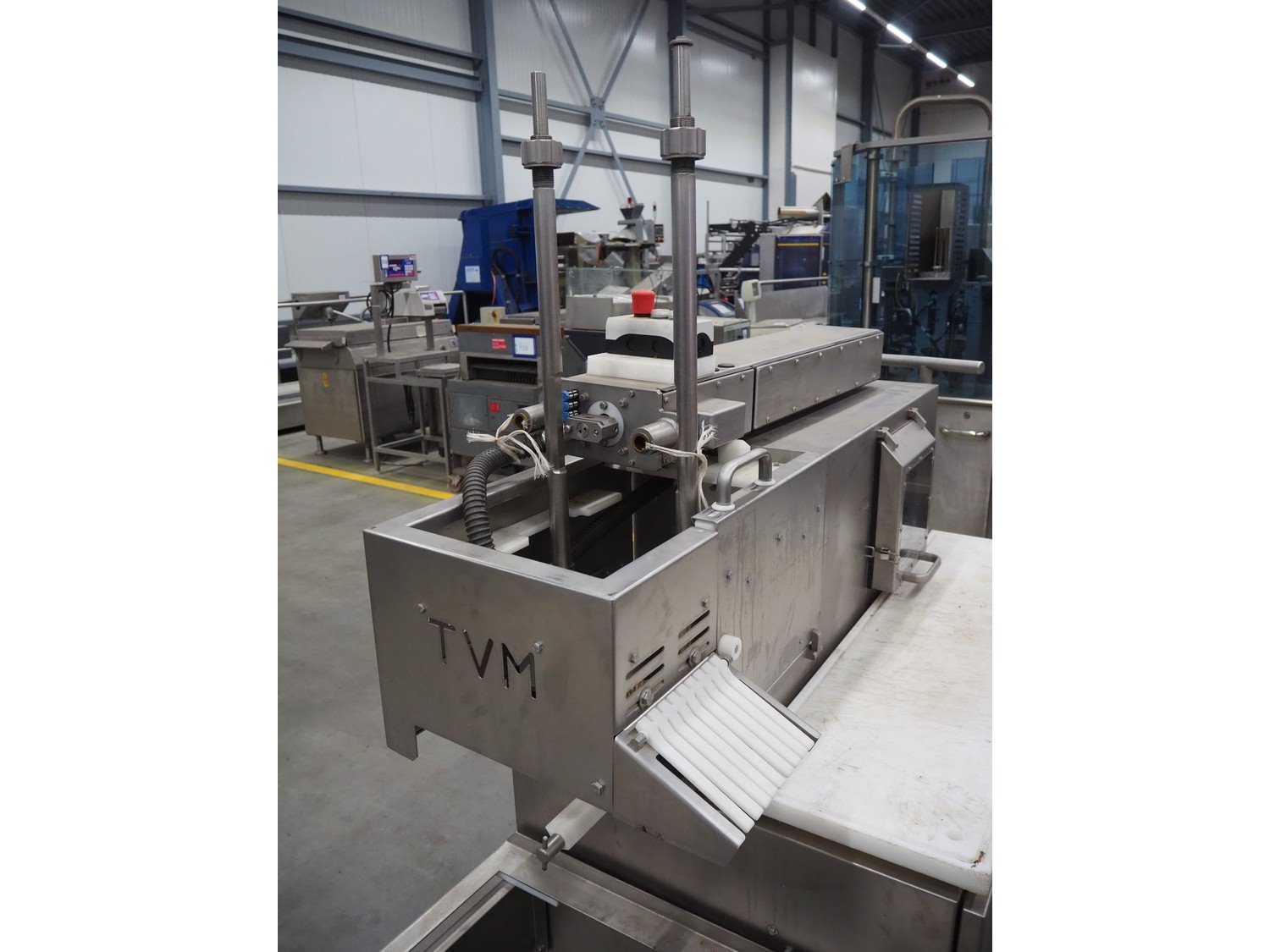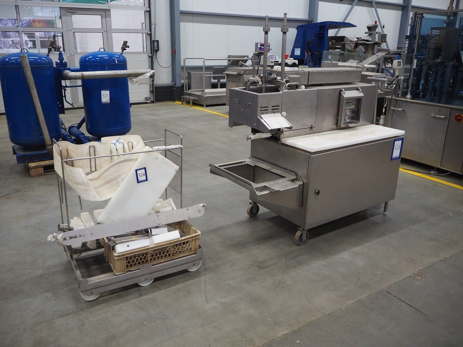 TVM GmbH & Co KG mobile portioning machine, type: Portio 4000, serial number: 05-00.26725215, year of construction: 2000, machine weight: 380 kg, plastic belt width: 200 mm, total dimensions: 1800 mm x 800 mm x 1750 mm. Including trolley with parts.