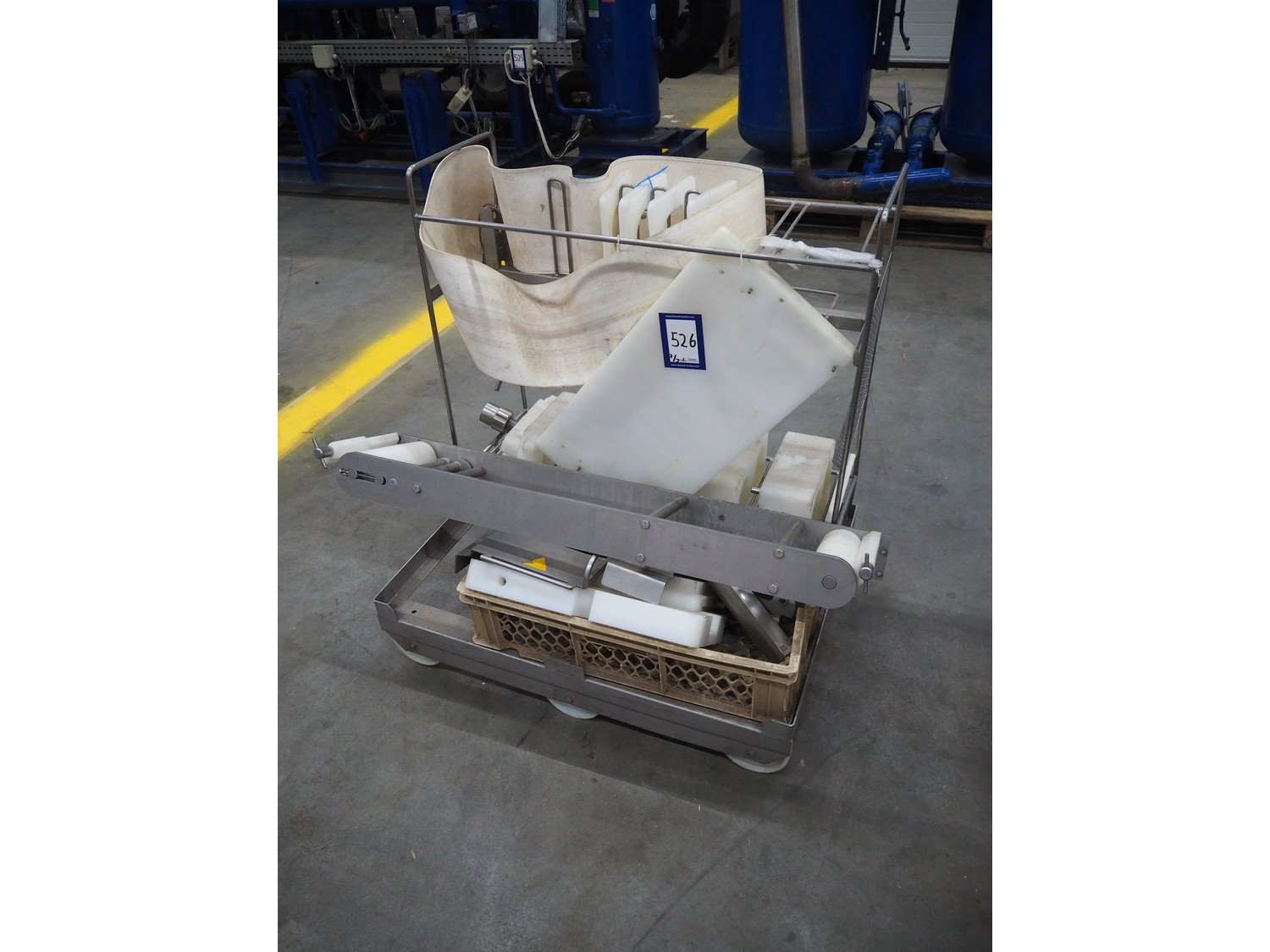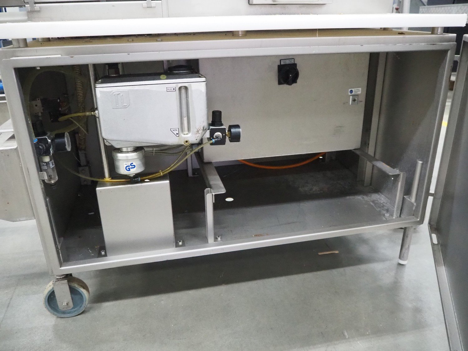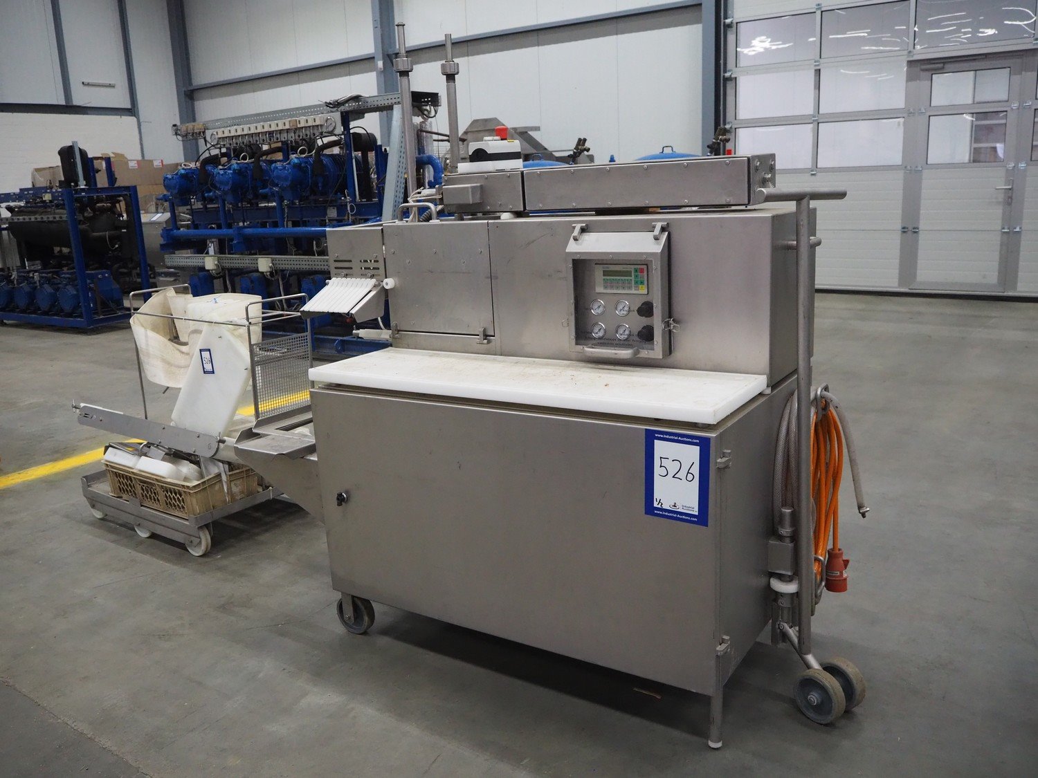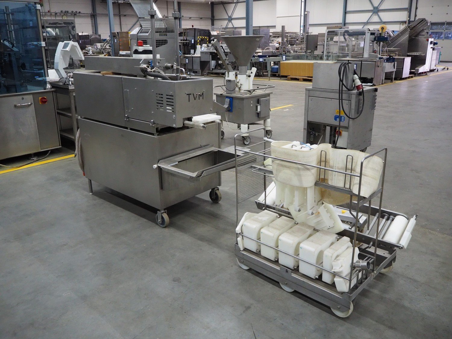 TVM GmbH & Co KG mobile portioning machine, type: Portio 4000, serial number: 05-00.26725215, year of construction: 2000, machine weight: 380 kg, plastic belt width: 200 mm, total dimensions: 1800 mm x 800 mm x 1750 mm. Including trolley with parts.