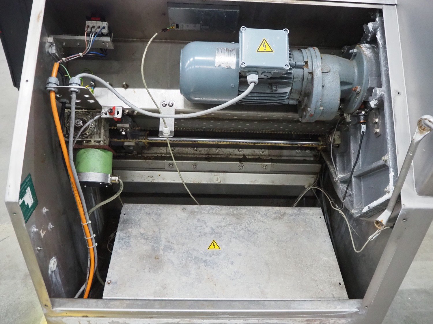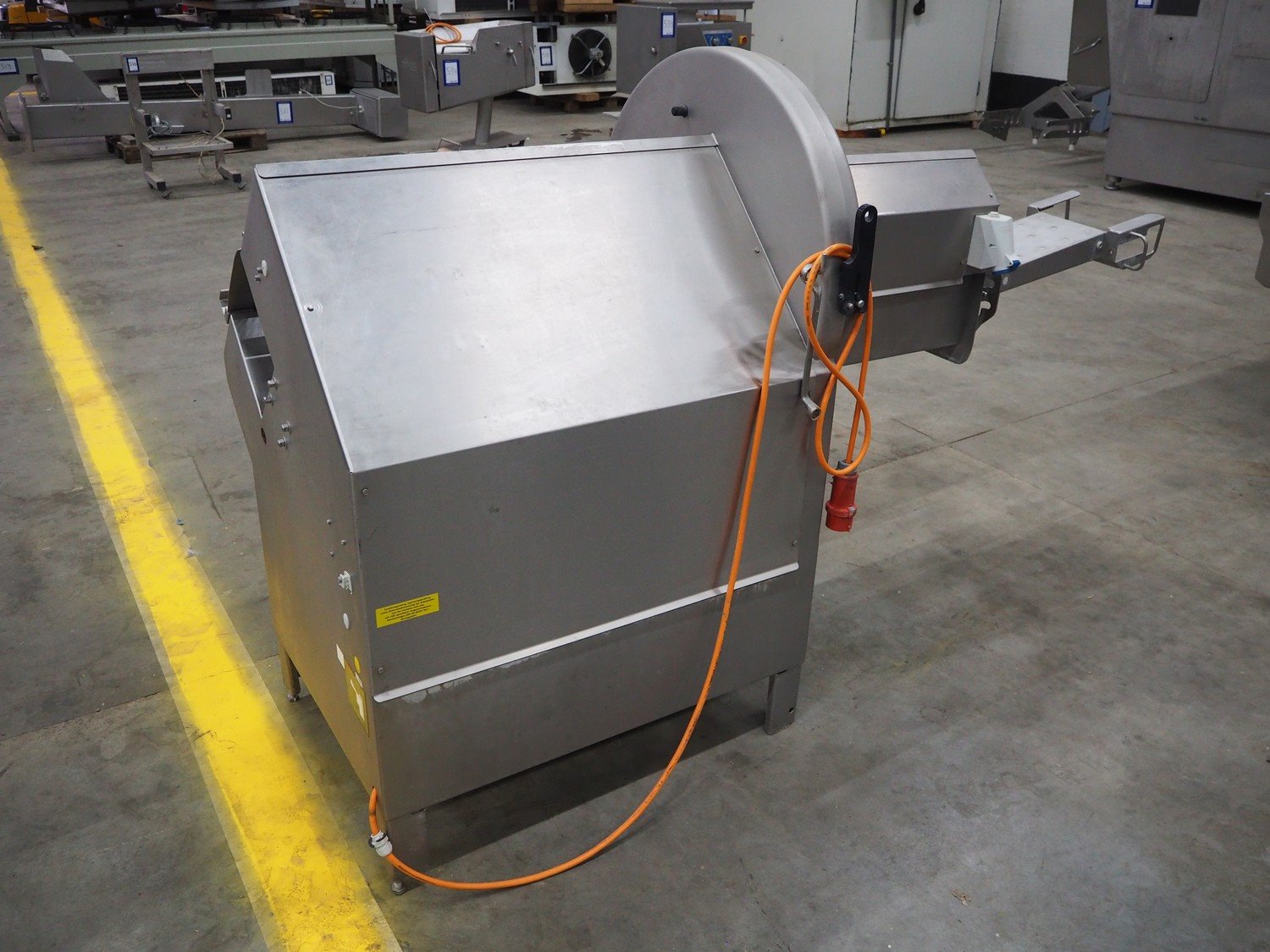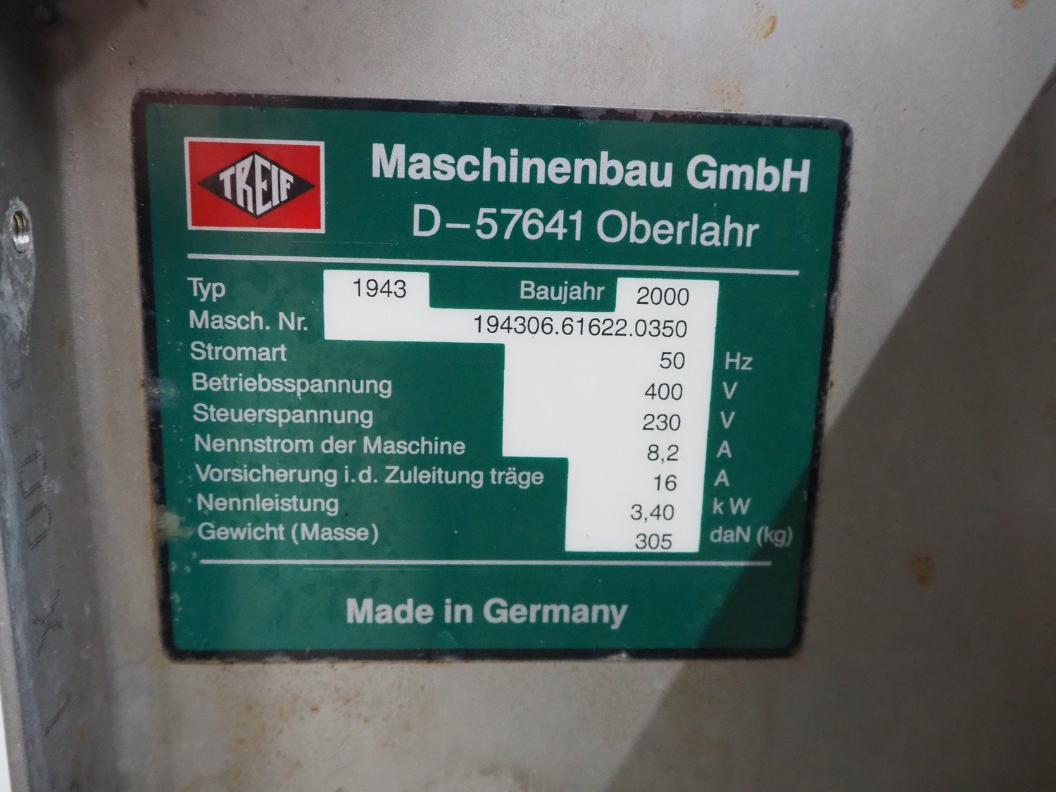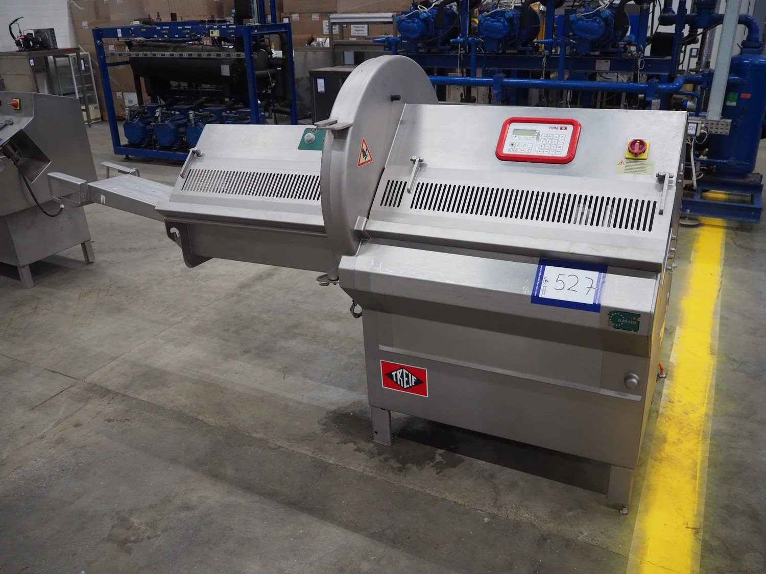 Treif slicer, type: 1943, machine number: 194306.61622.0350, year of construction: 2000, 230/400 V, 50 Hz, 8,2/16 A, 3,40 kW, plastic belt, belt width: 240 mm, machine weight: 305 kg, dimensions chamber: 230 mm x 215 mm, dimensions knife: 530 mm, total dimensions: 1950 mm x 930 mm x 1430 mm.
