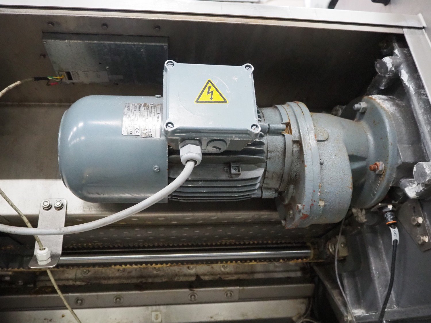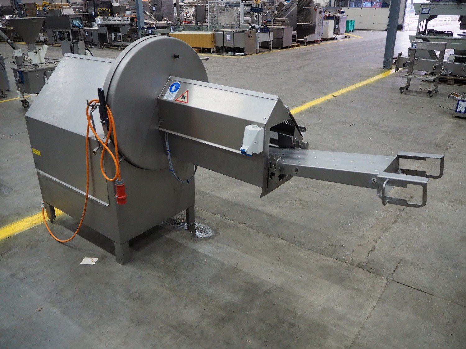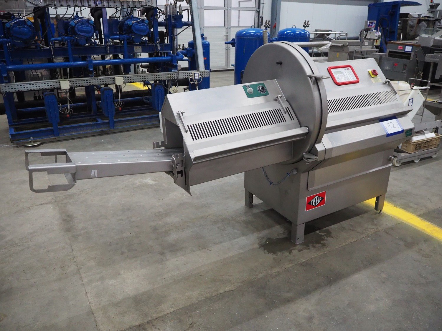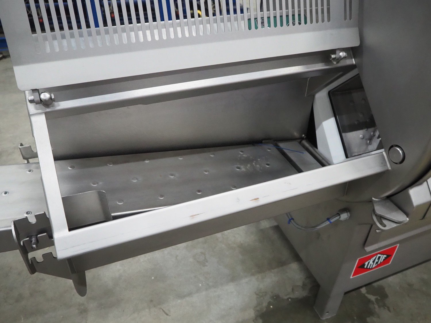 Treif slicer, type: 1943, machine number: 194306.61622.0350, year of construction: 2000, 230/400 V, 50 Hz, 8,2/16 A, 3,40 kW, plastic belt, belt width: 240 mm, machine weight: 305 kg, dimensions chamber: 230 mm x 215 mm, dimensions knife: 530 mm, total dimensions: 1950 mm x 930 mm x 1430 mm.