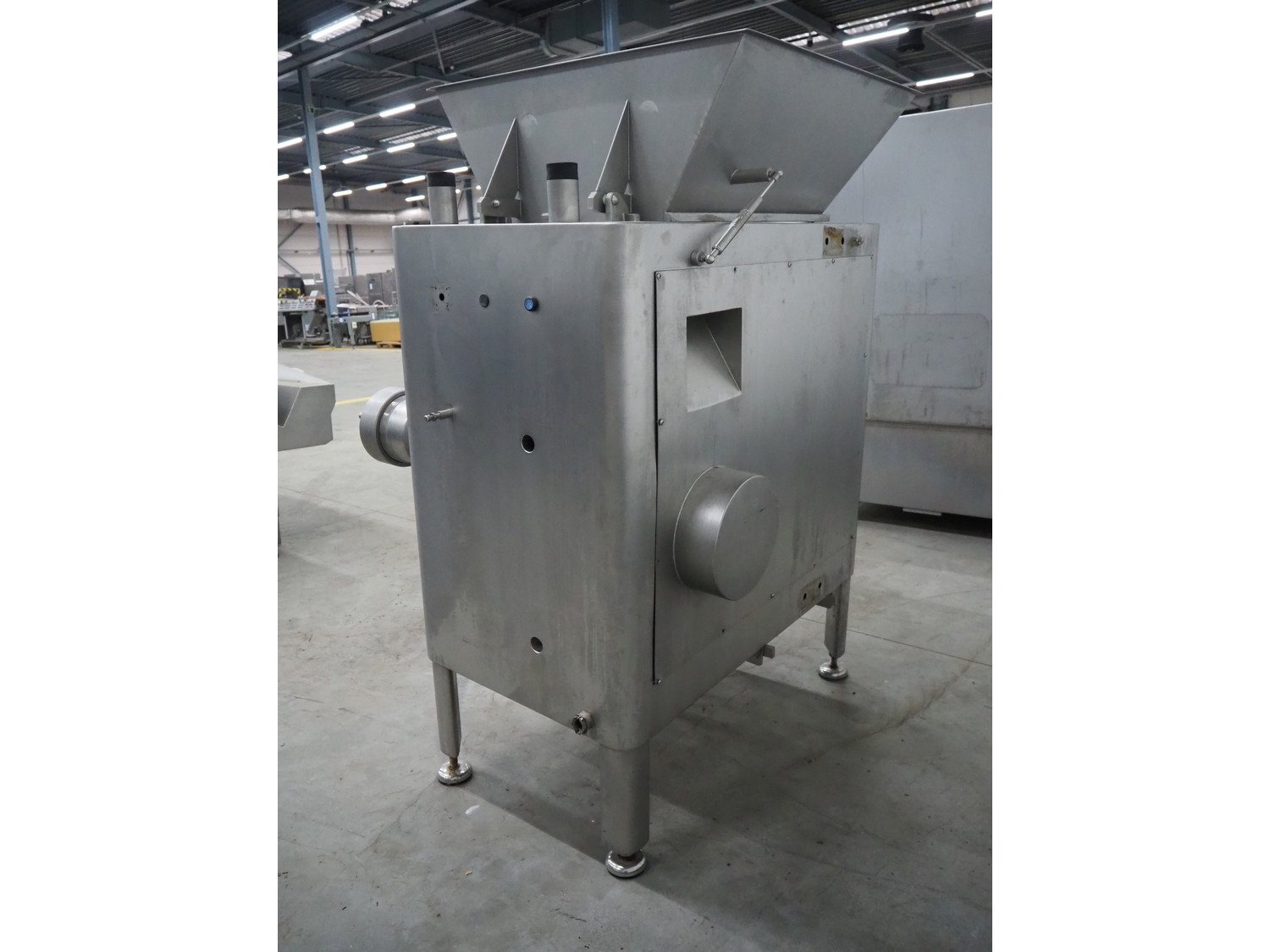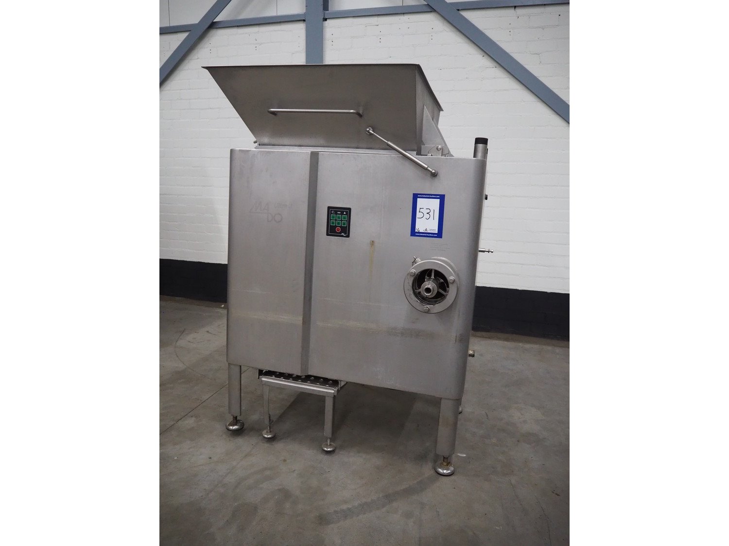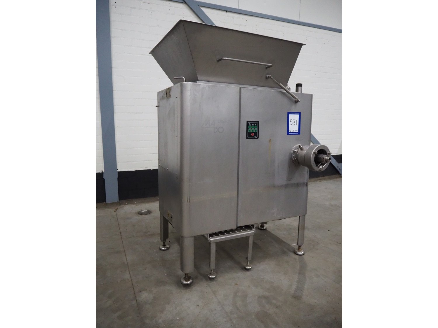 MaDo mixer-grinder with Carsø lifter for 200 liter meat bins, diameter plate: 160 mm, dimensions mixer-ginder: 1320 mm x 1100 mm x 1850 mm, lifter type: HKV200, serial number: 94606, year of construction: 2001, 400 V, 3 Ph, 0.75 kW, lifting height: 2000 mm, dimensions lifter: 3300 mm x 1400 mm x 700 mm.