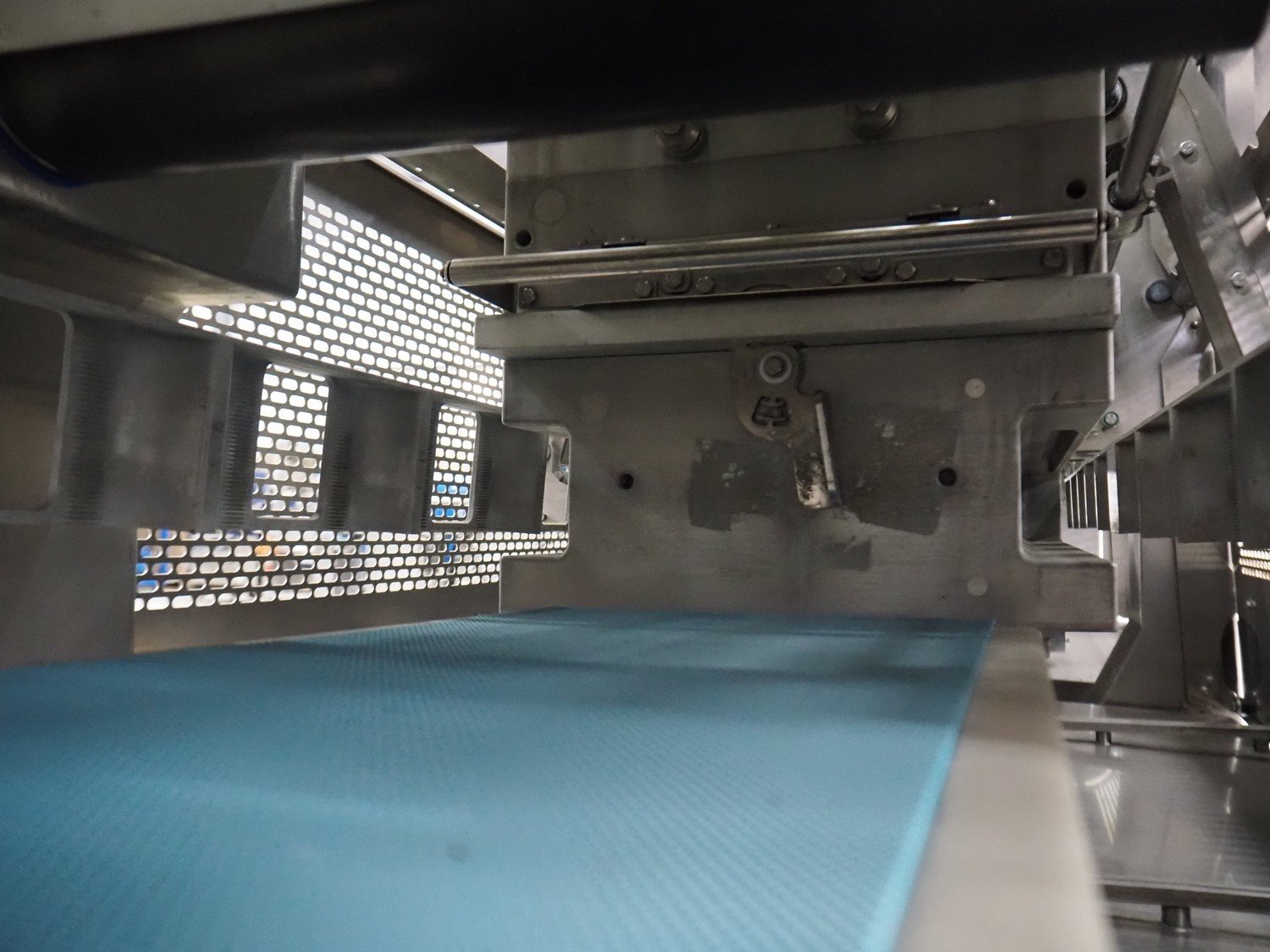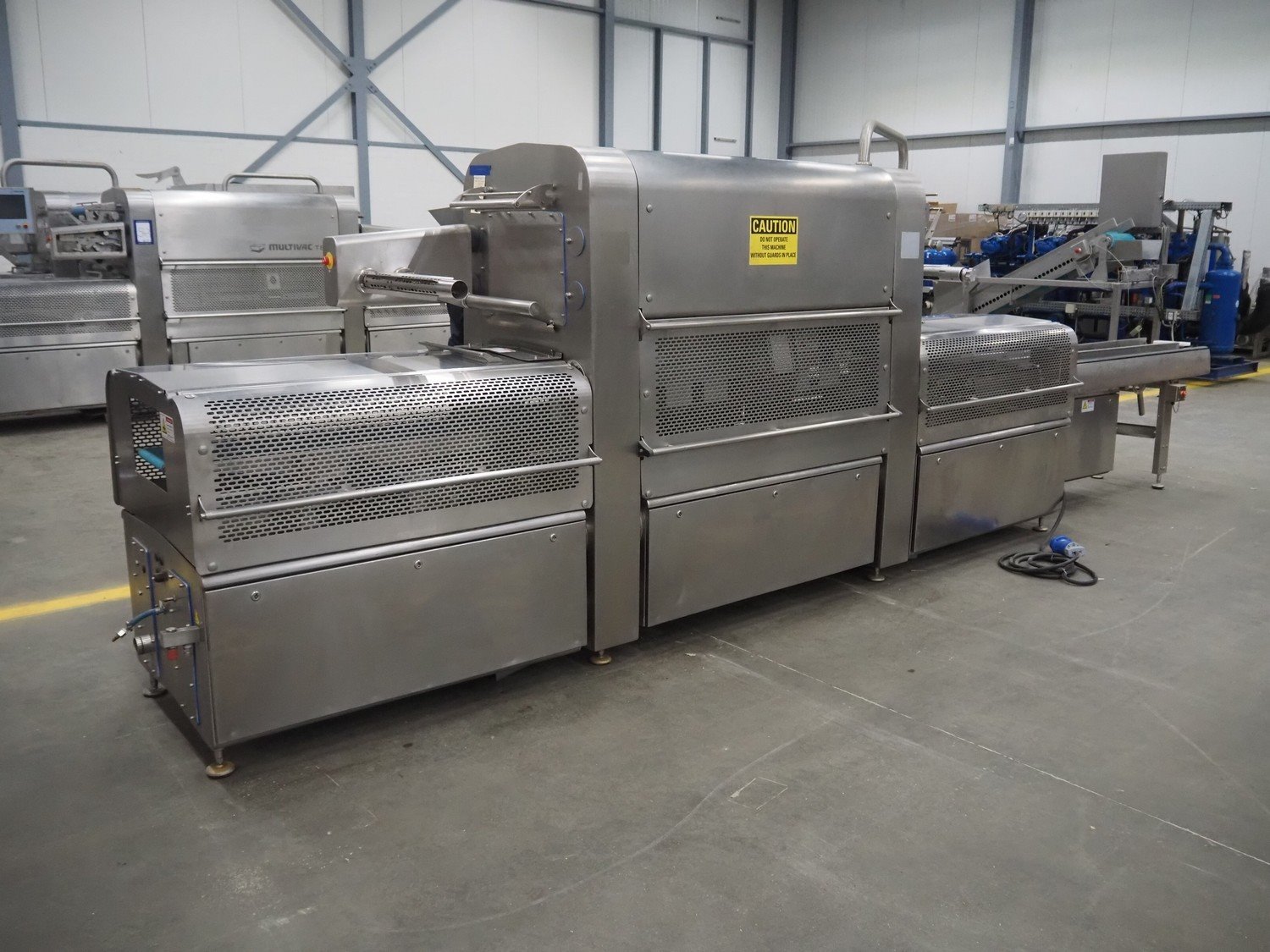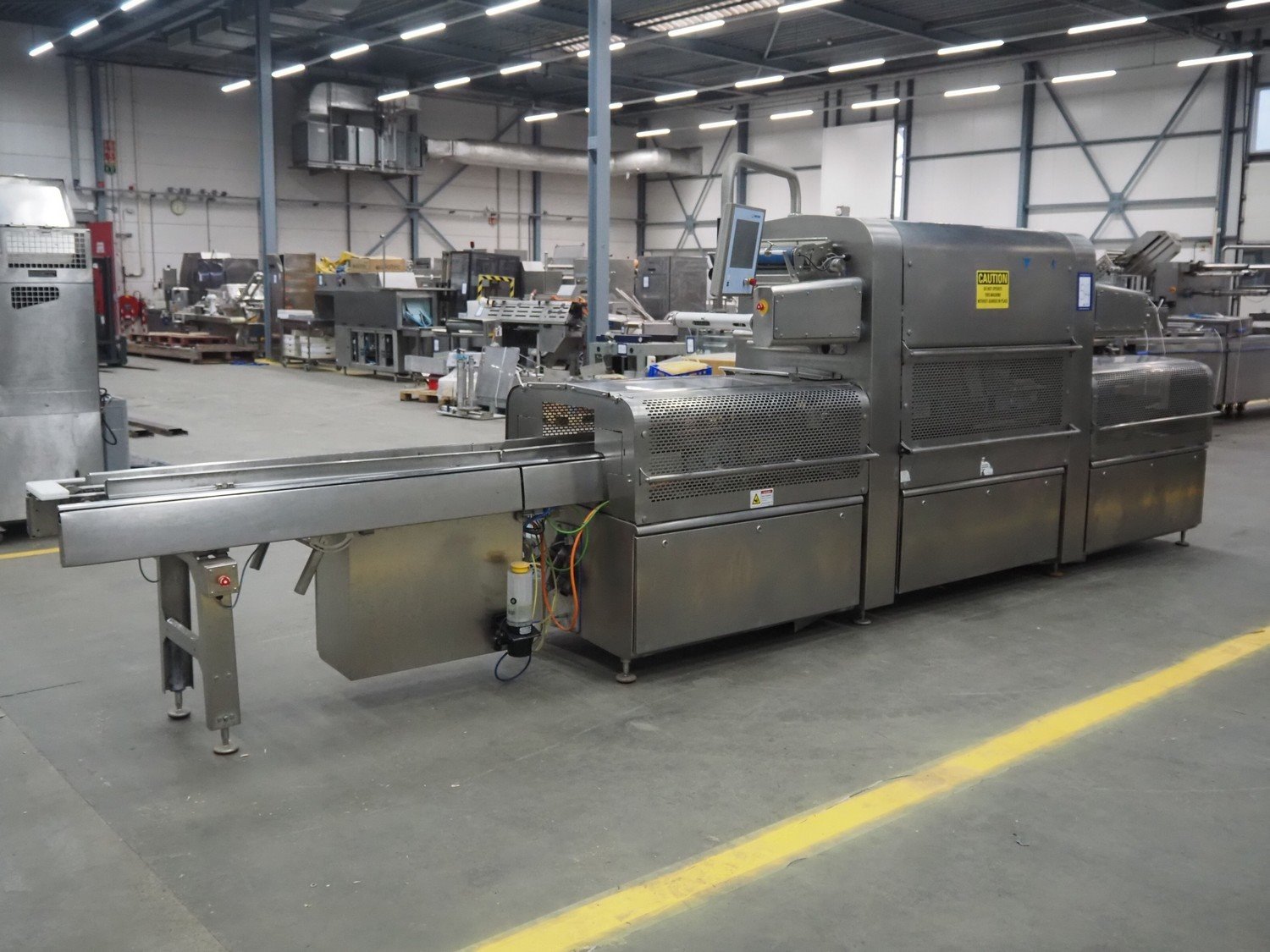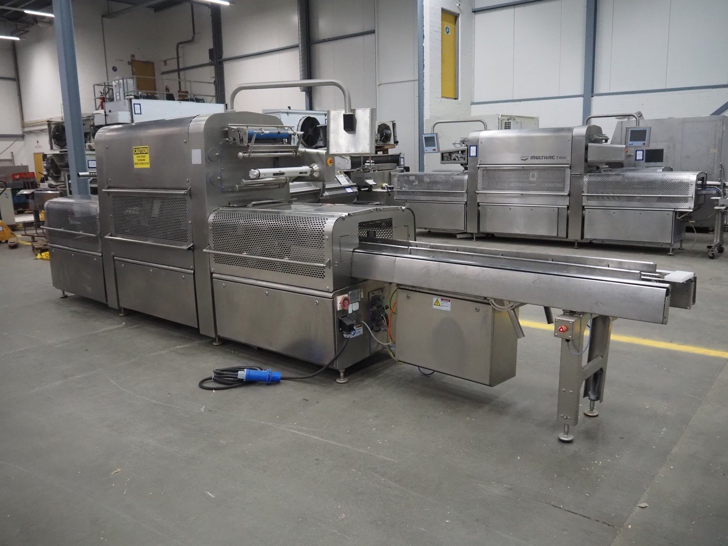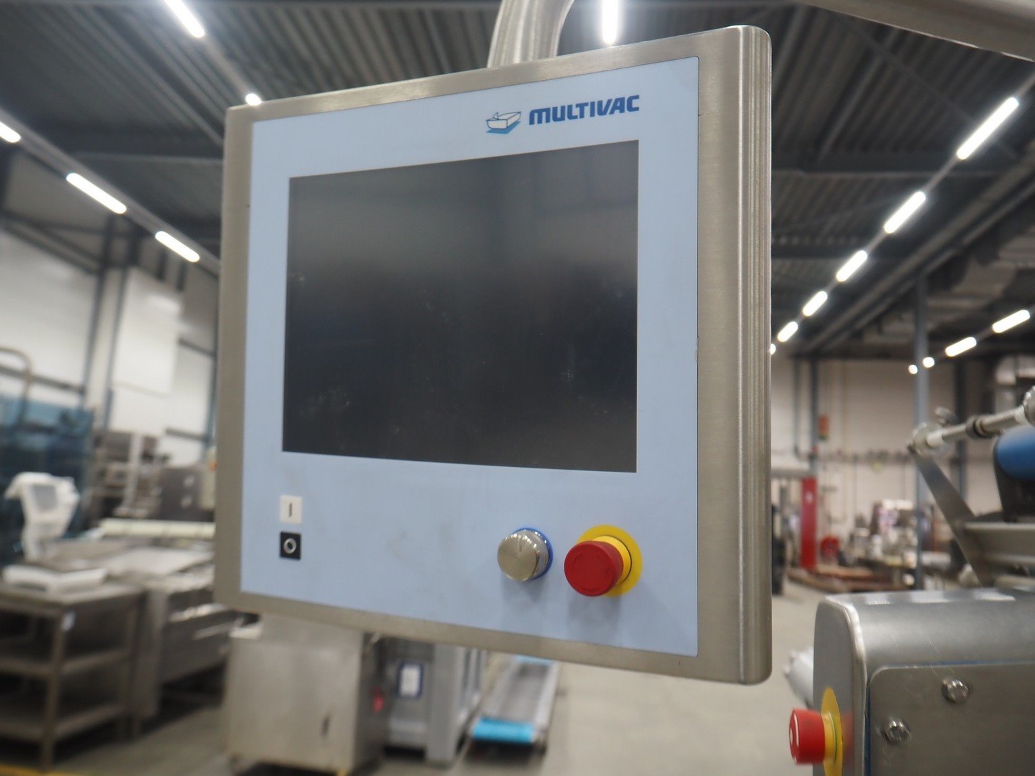 Multivac traysealer, model: T 800, plastic mesh belt, belt width: 250 mm, clearance: 350 mm x 170 mm, film width: 520 mm, infeed belt, belt with dividers, belt width: 205 mm, dividers height: 35 mm, distance between dividers: 290 mm, total dimensions: 6450 mm x 1050 mm x 2060 mm.