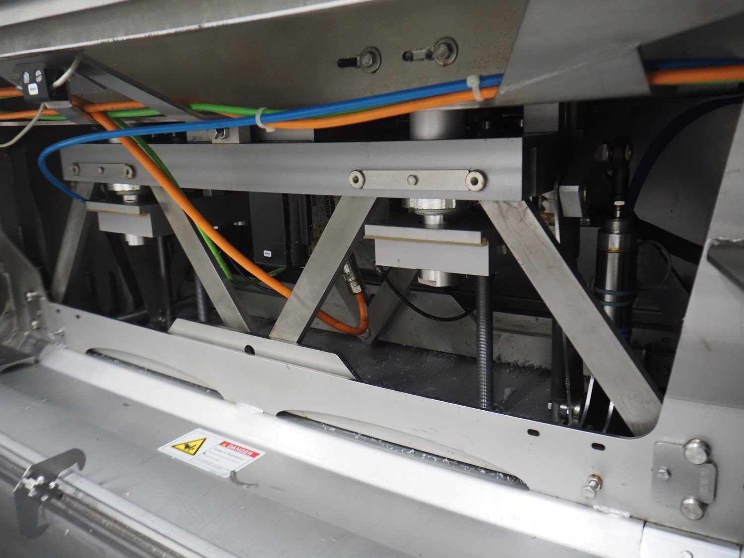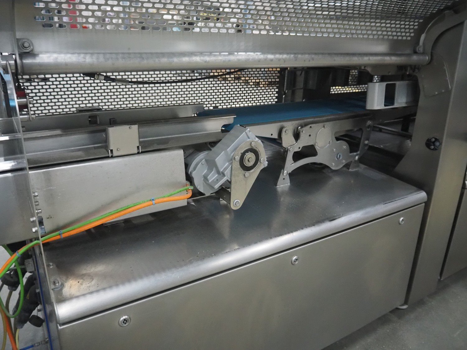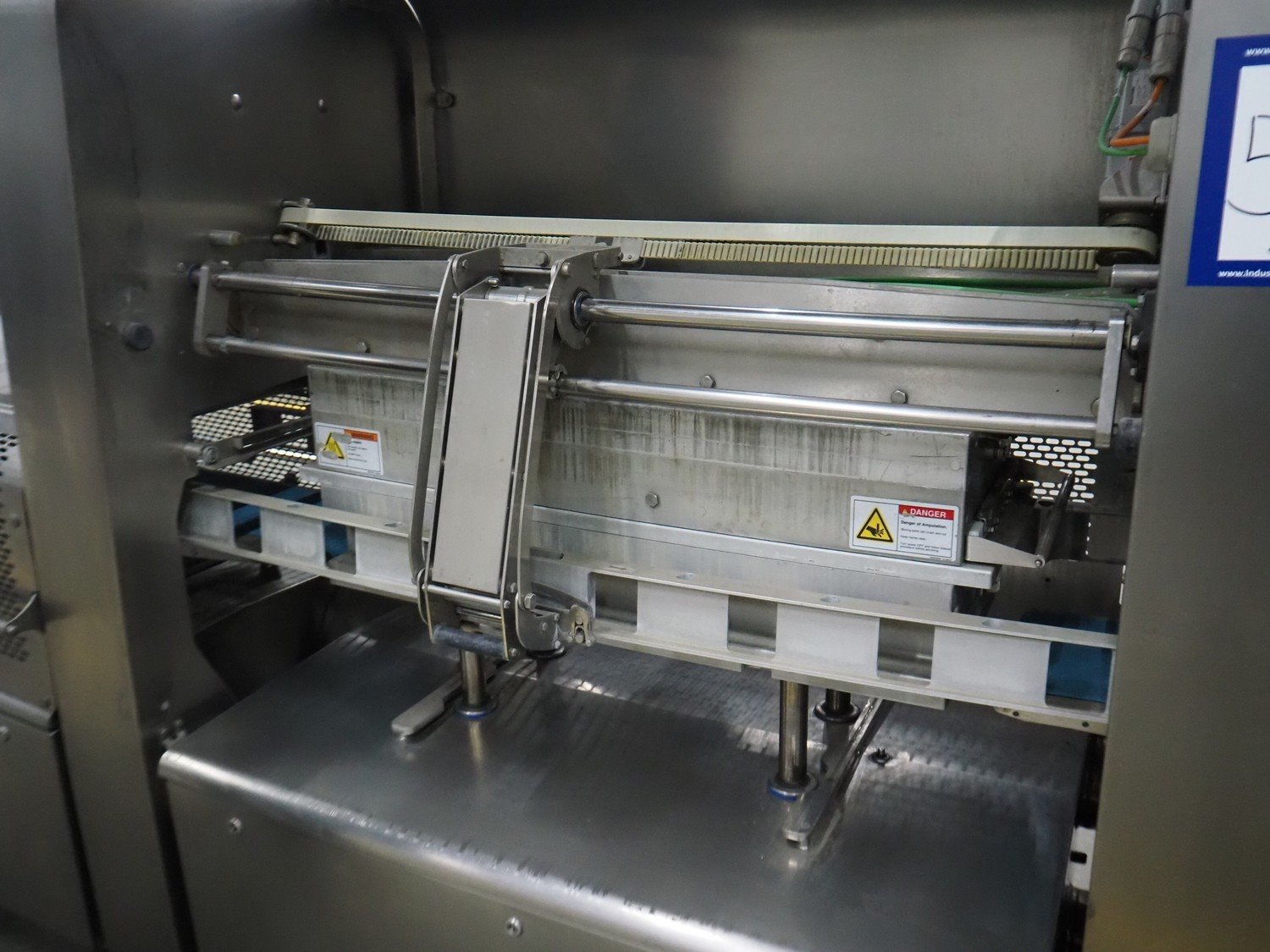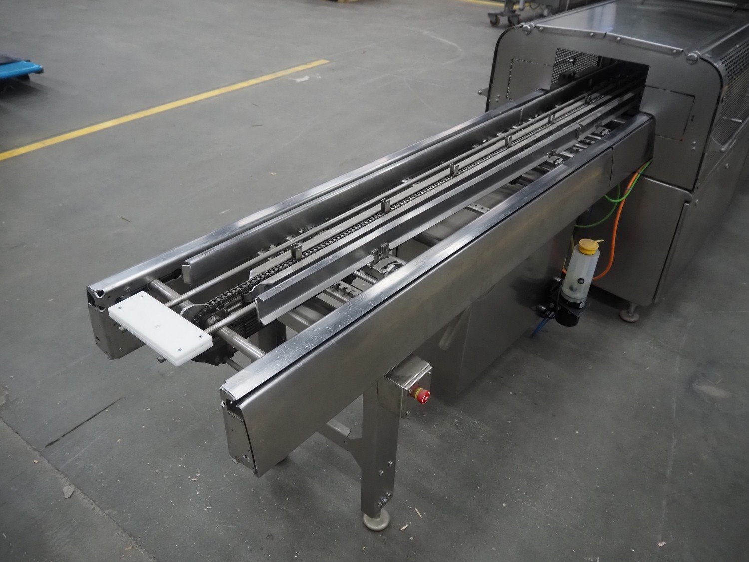 Multivac traysealer, model: T 800, plastic mesh belt, belt width: 250 mm, clearance: 350 mm x 170 mm, film width: 520 mm, infeed belt, belt with dividers, belt width: 205 mm, dividers height: 35 mm, distance between dividers: 290 mm, total dimensions: 6450 mm x 1050 mm x 2060 mm.