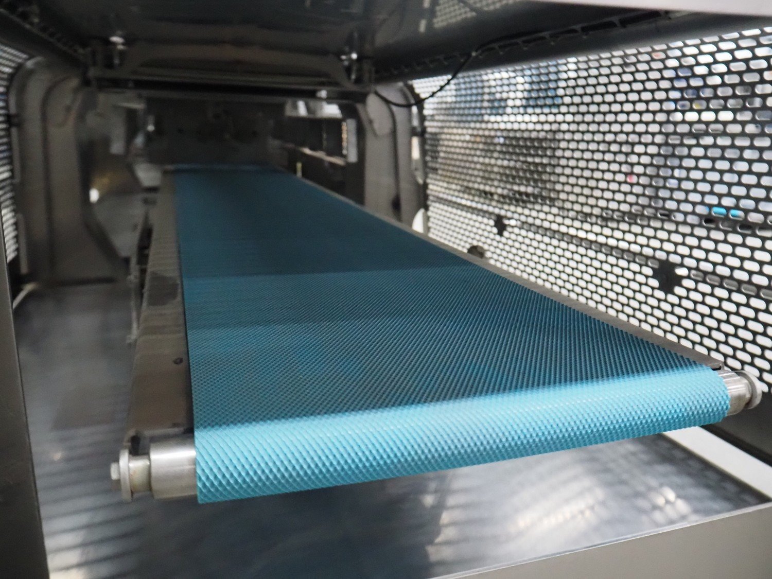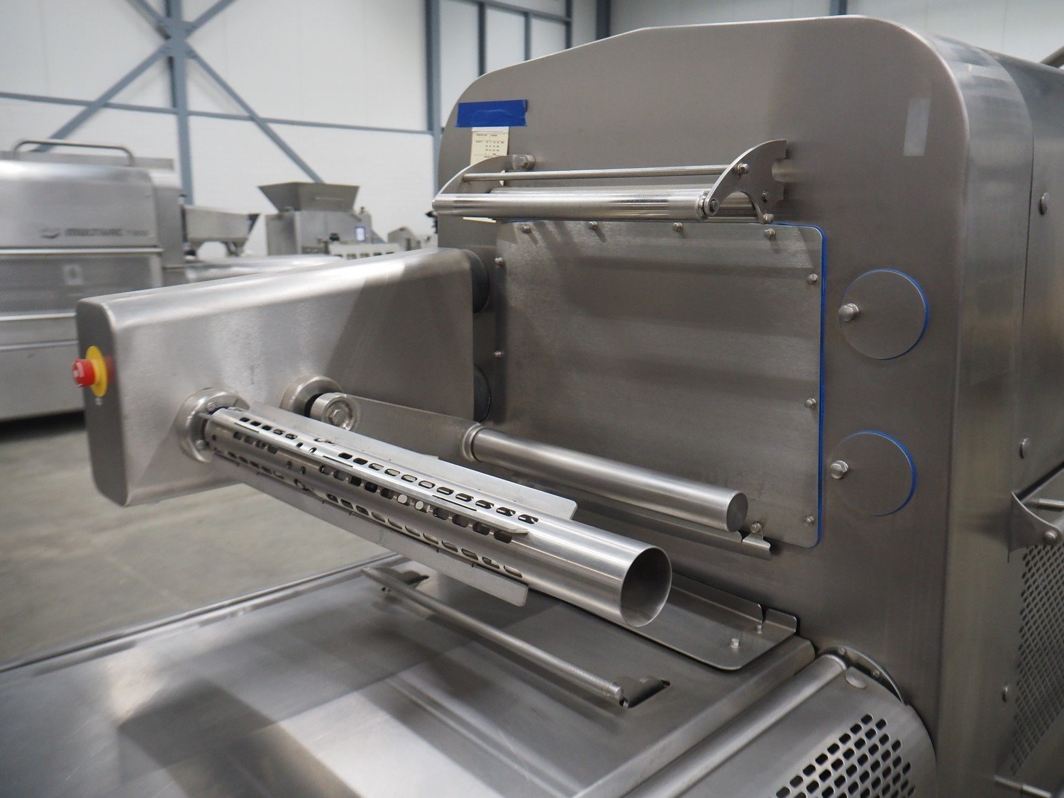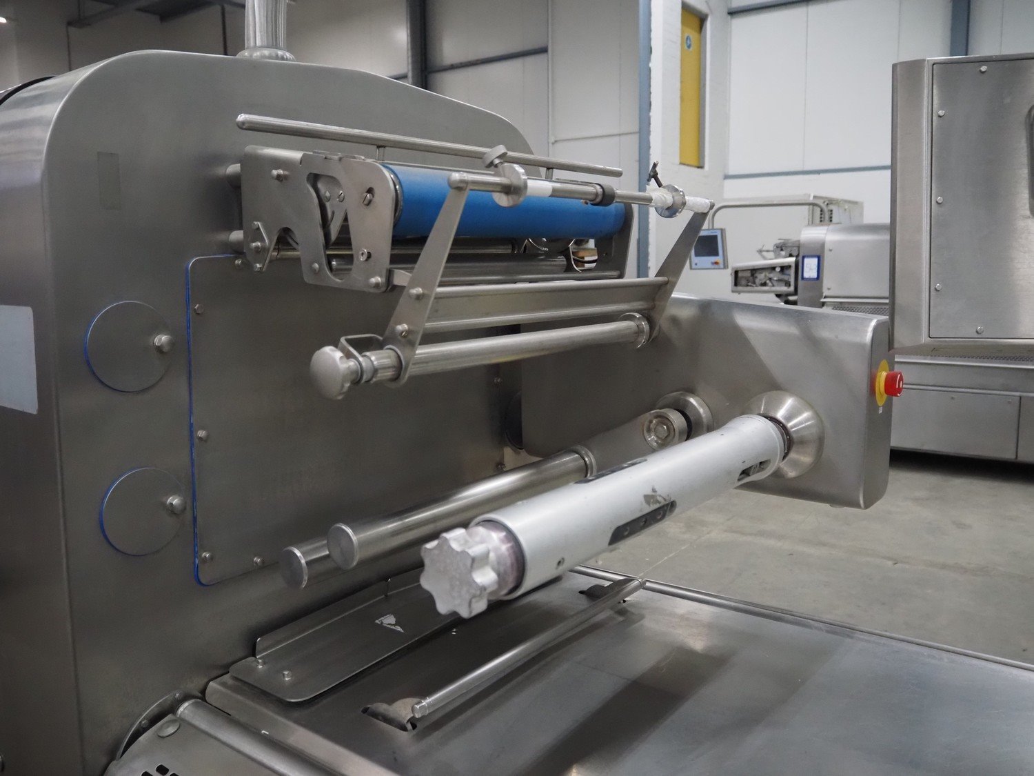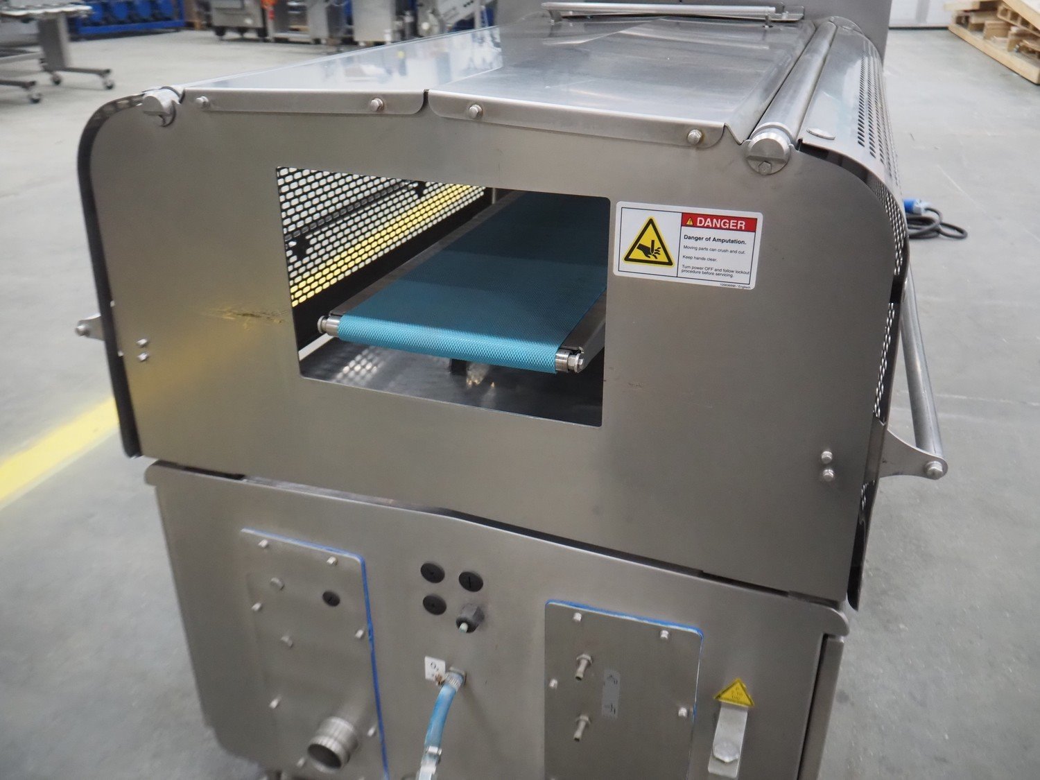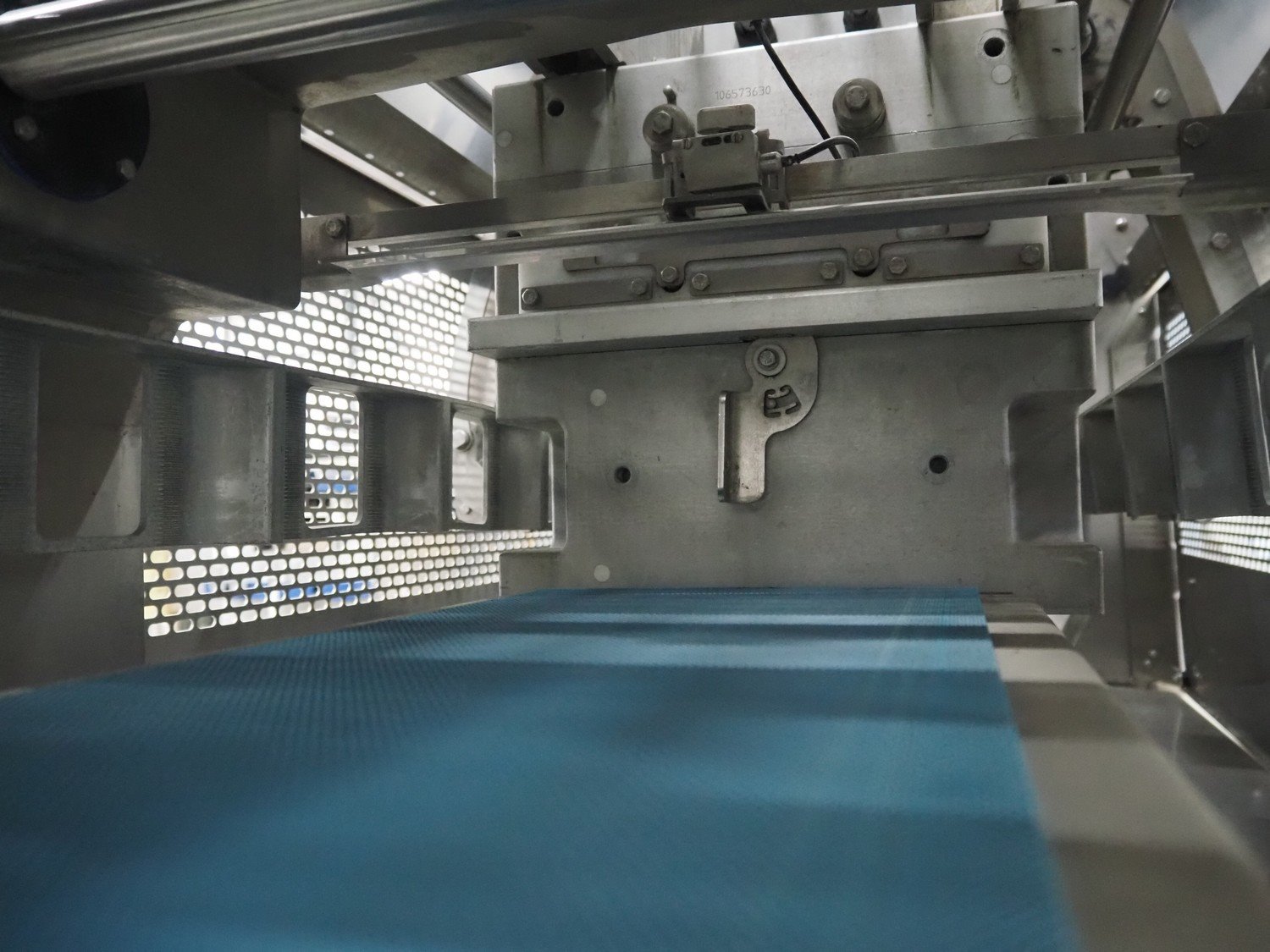 Multivac traysealer, model: T 800, plastic mesh belt, belt width: 250 mm, clearance: 350 mm x 170 mm, film width: 520 mm, infeed belt, belt with dividers, belt width: 205 mm, dividers height: 35 mm, distance between dividers: 290 mm, total dimensions: 6450 mm x 1050 mm x 2060 mm.