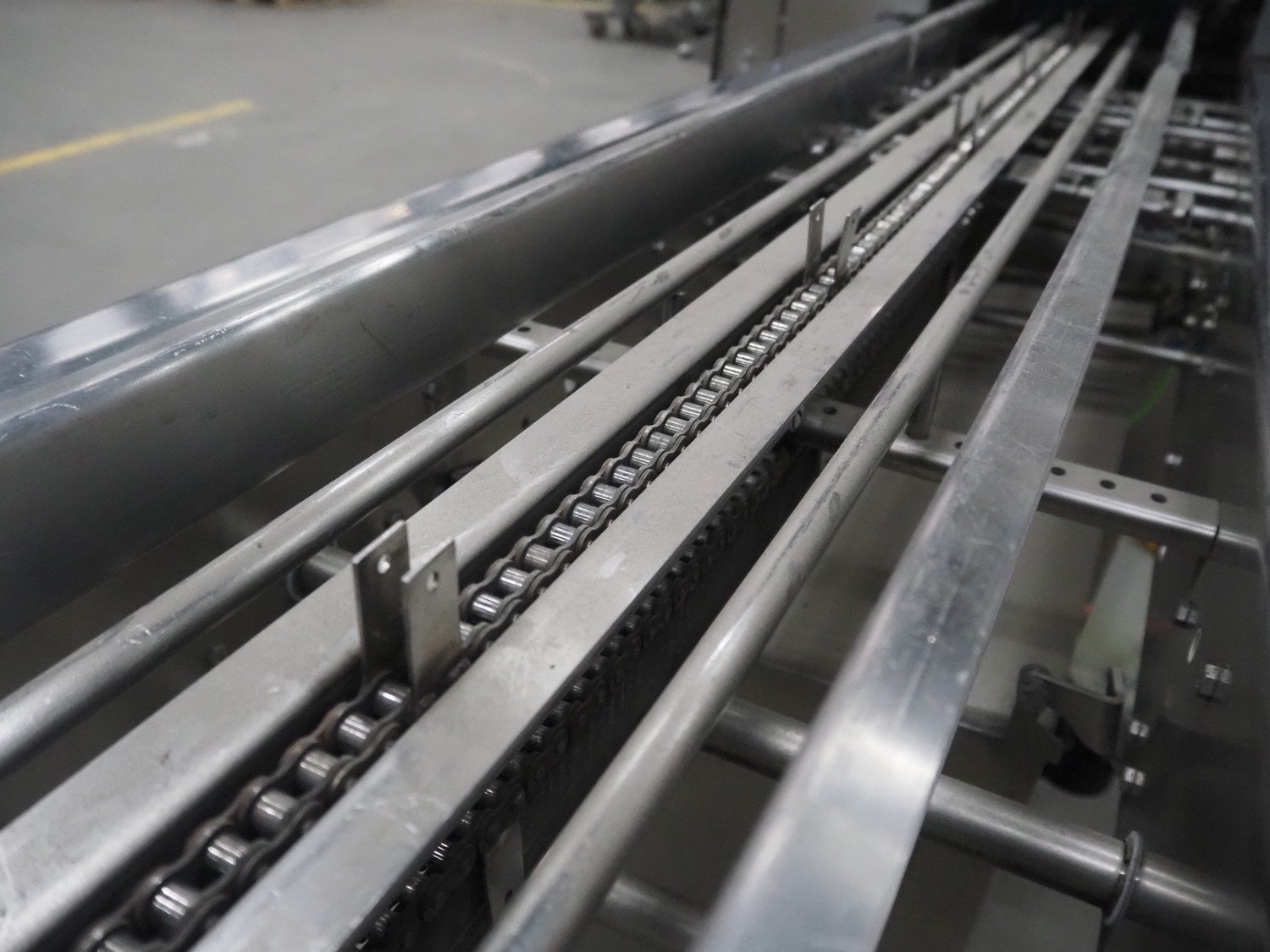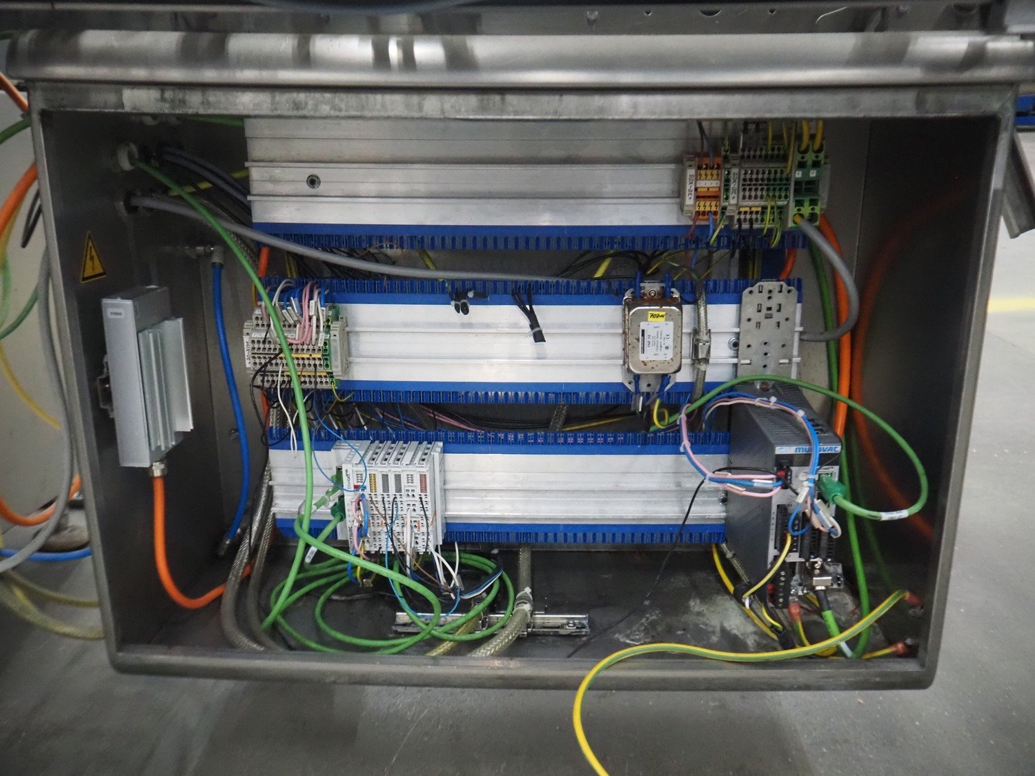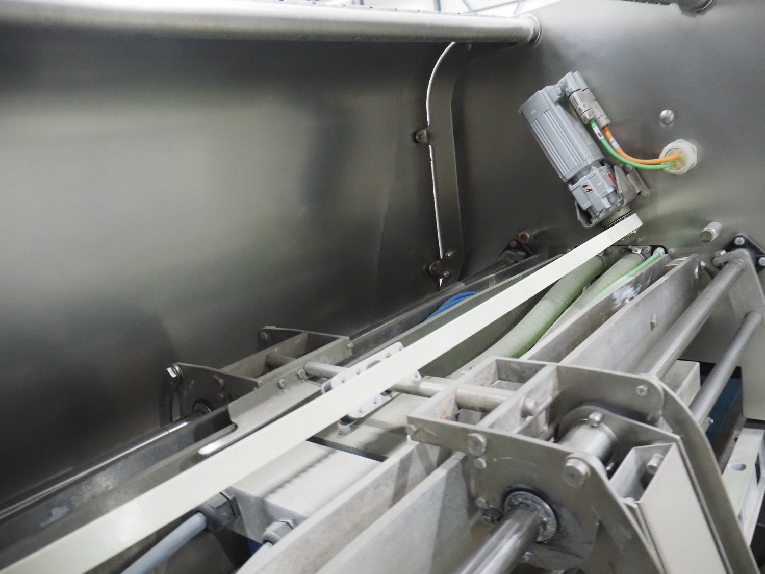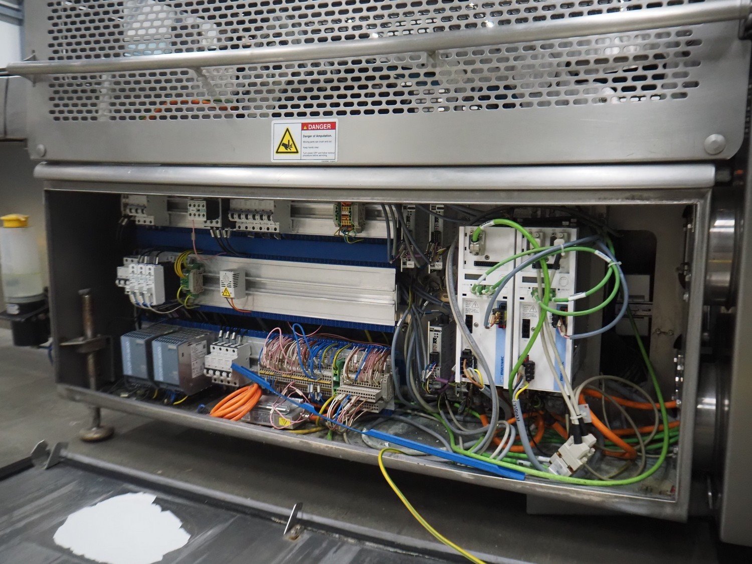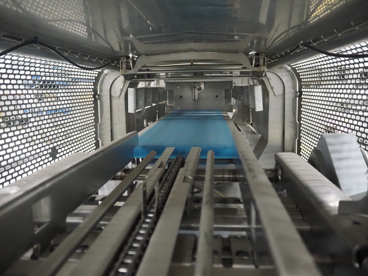 Multivac traysealer, model: T 800, plastic mesh belt, belt width: 250 mm, clearance: 350 mm x 170 mm, film width: 520 mm, infeed belt, belt with dividers, belt width: 205 mm, dividers height: 35 mm, distance between dividers: 290 mm, total dimensions: 6450 mm x 1050 mm x 2060 mm.