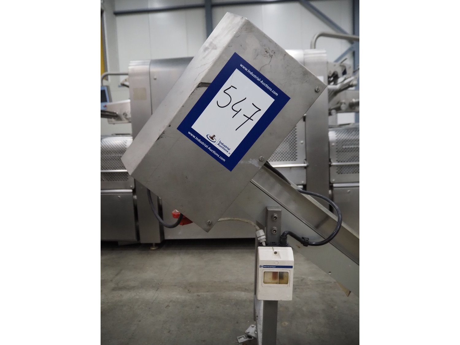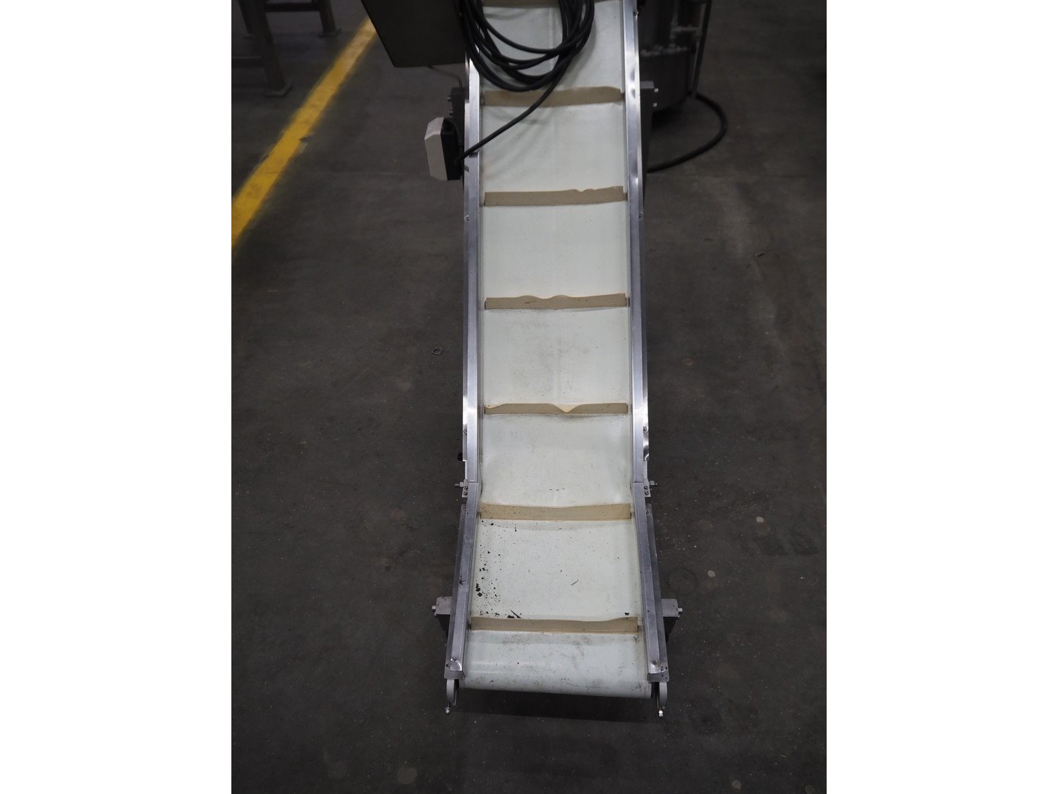 Mobile elevating belt, plastic belt with dividers, belt width: 360 mm, divider height: 40 mm, distance between dividers: 270 mm, elevating height: 1100 mm, total dimensions: 1600 mm x 750 mm x 1400 mm.