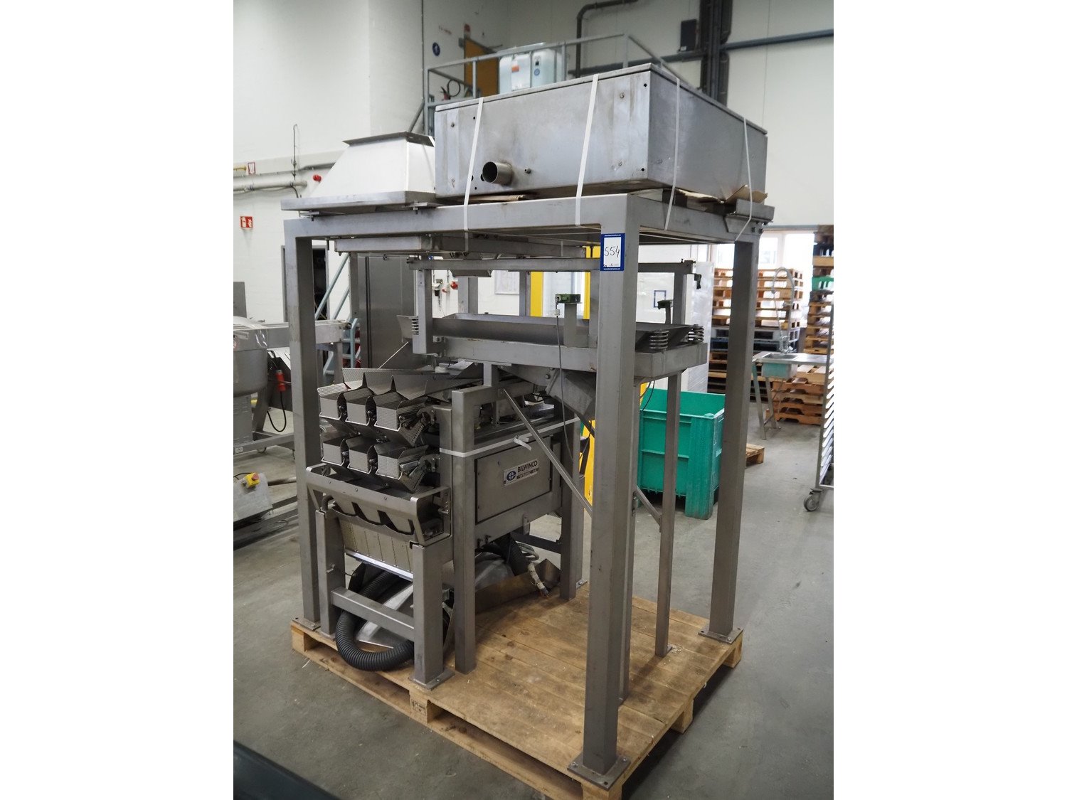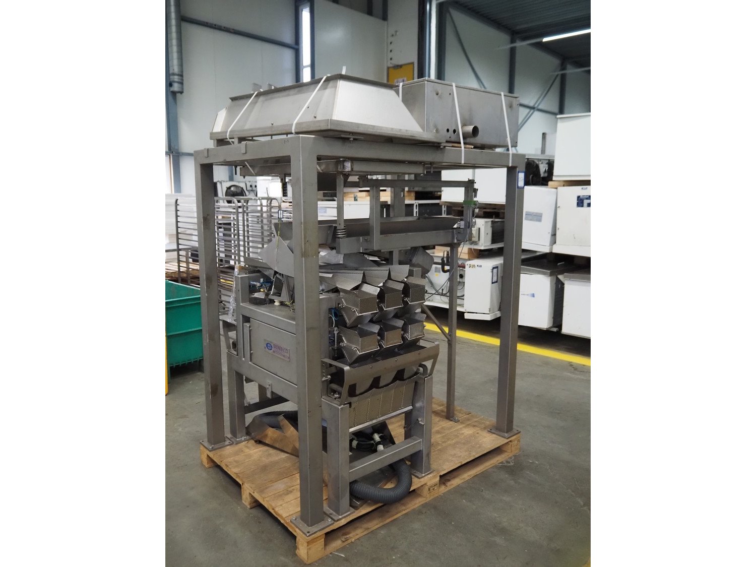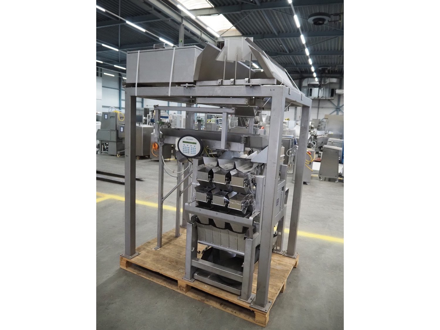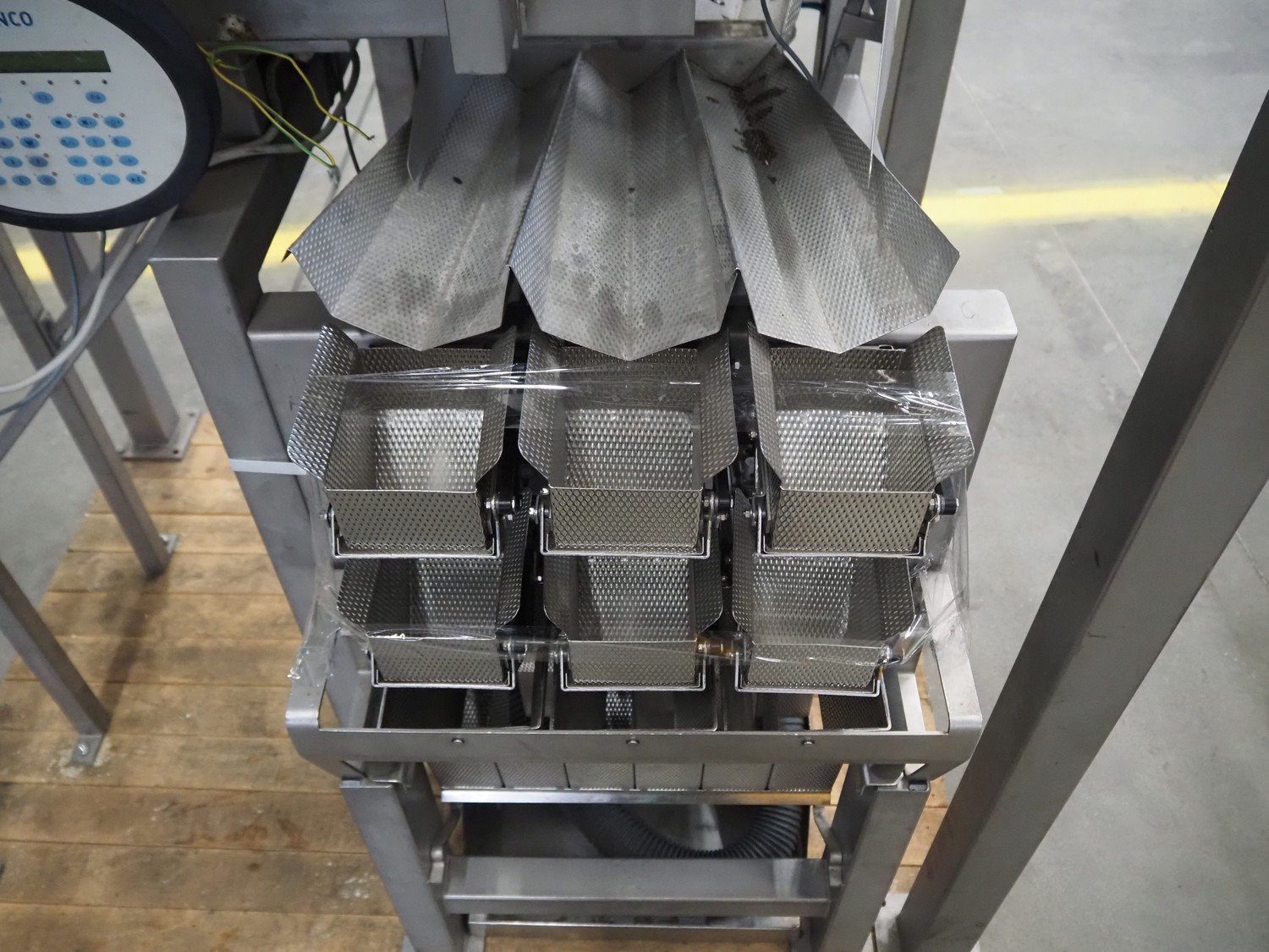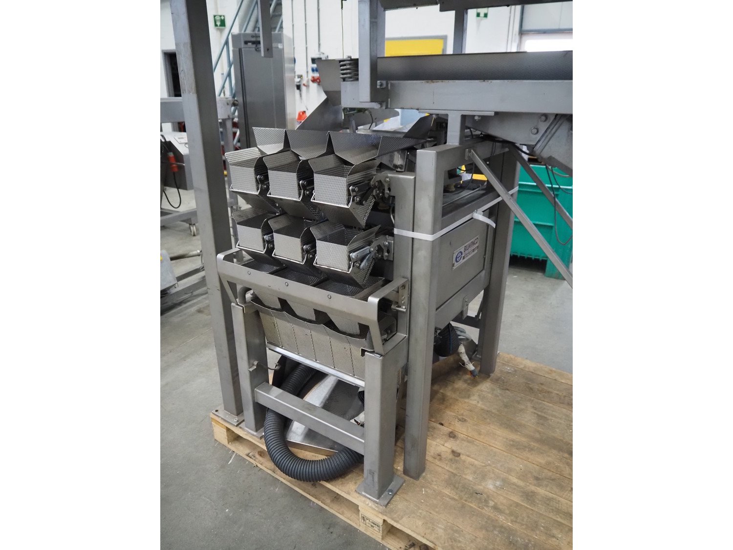 Bilwinco linear weigher consisting of: 2 6-lanes linear weighers, lane width: 120 mm, total dimensions: (2x) 1200 mm x 700 mm x 1300 mm, 2 vibrating gutters, gutter width: 350 mm, total dimensions: (2x) 1300 mm x 700 mm x 1600 mm, s/s frame with infeed hopper and switch cabinet, dimensions: 1600 mm x 1100 mm x 1750 mm. 1 weigher is incomplete.