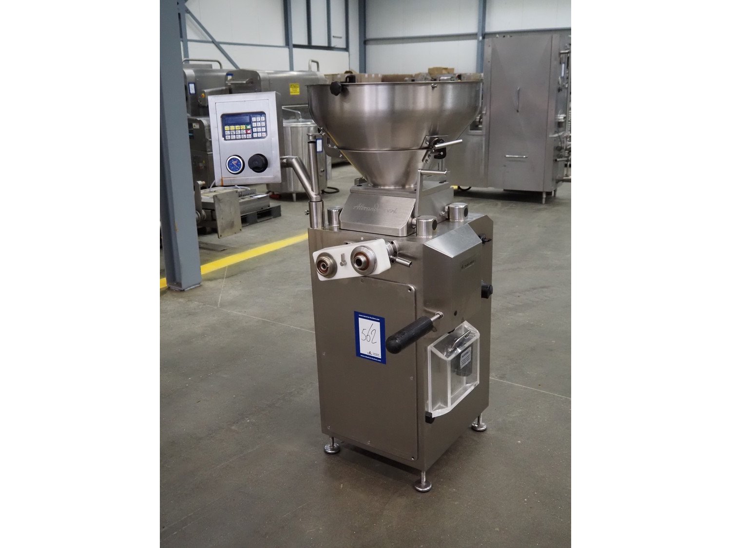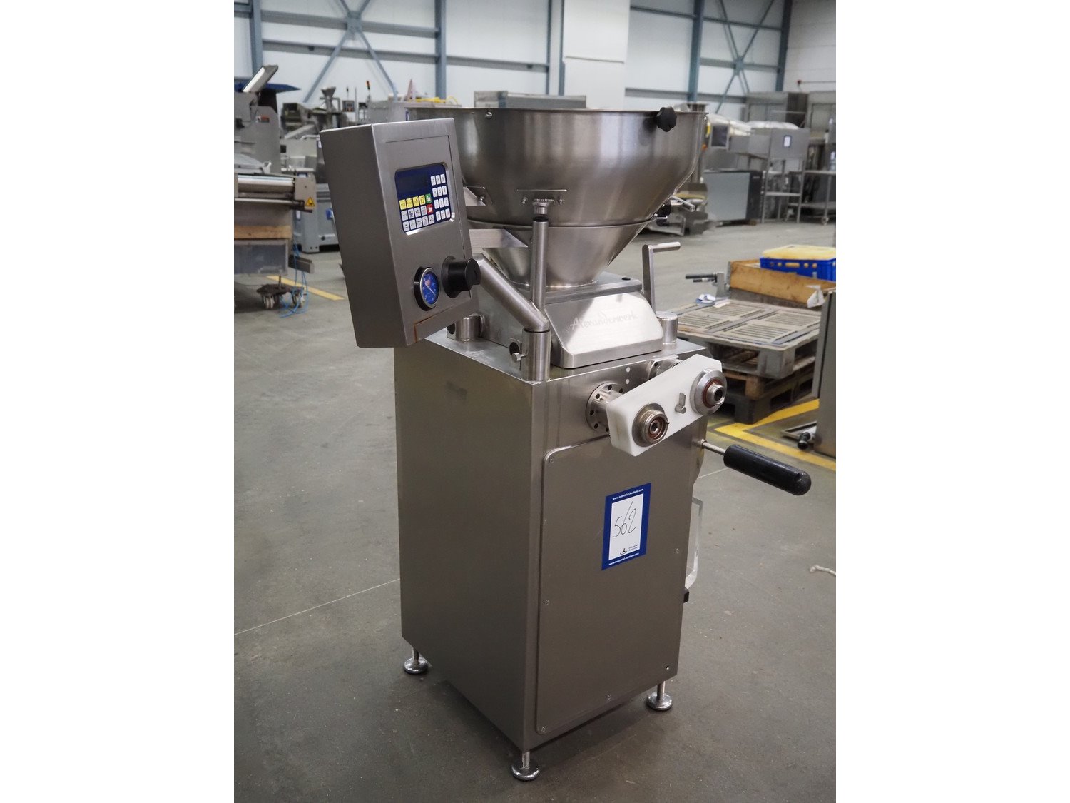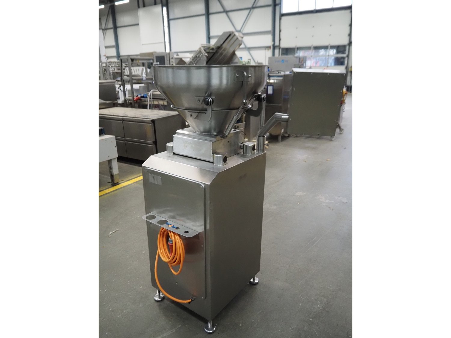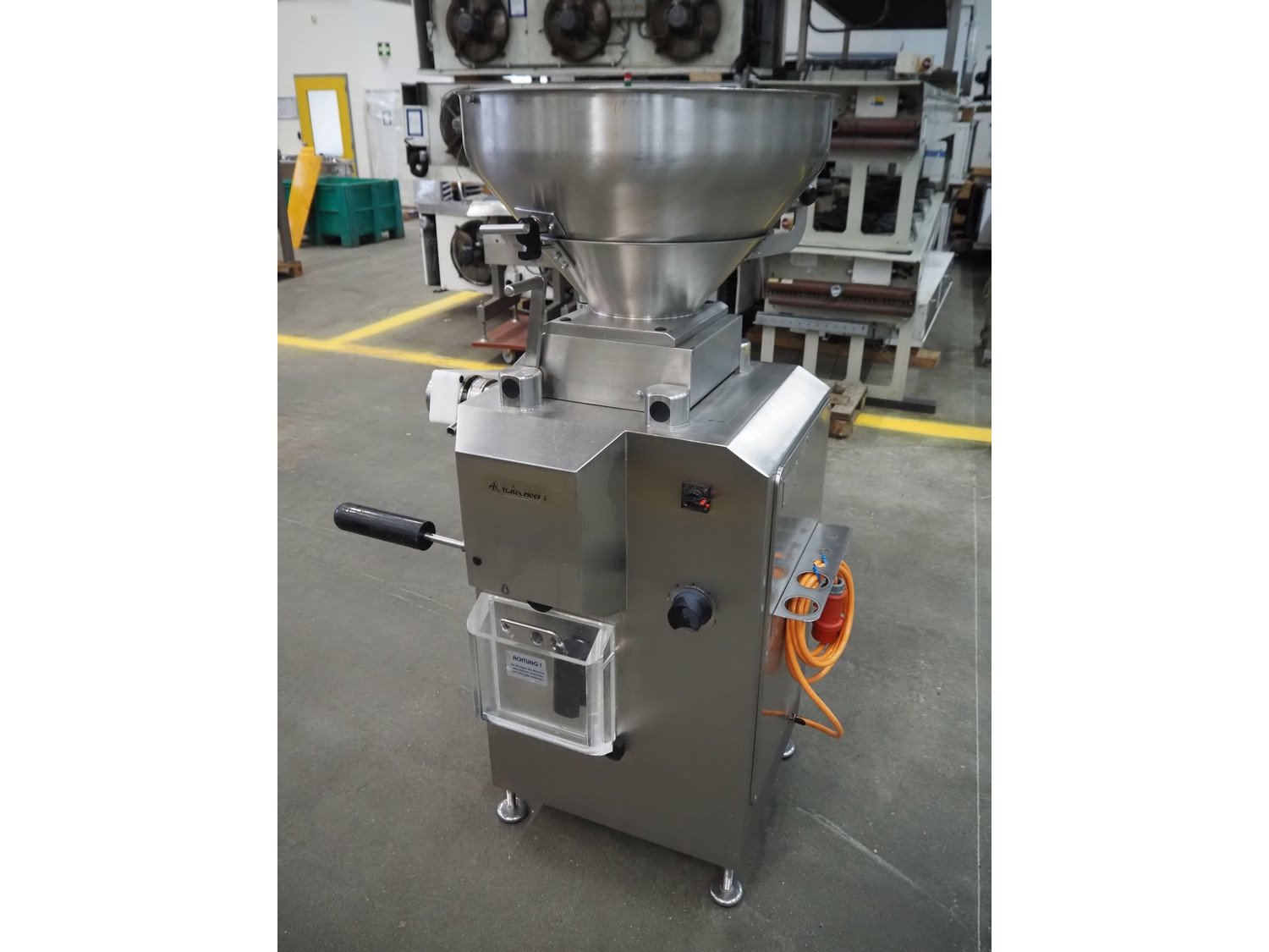 Alexanderwerk vacuum filling machine with linking attachment, type: NFV 50, machine number: 04708664, 230/400 V, 50 Hz, 6.9 A, 3 kW, Rietschle vacuum pump, type: VCB-20, capacity: 20/24 m³ per hour, dimensions: 750 mm x 600 mm x 1600 mm.