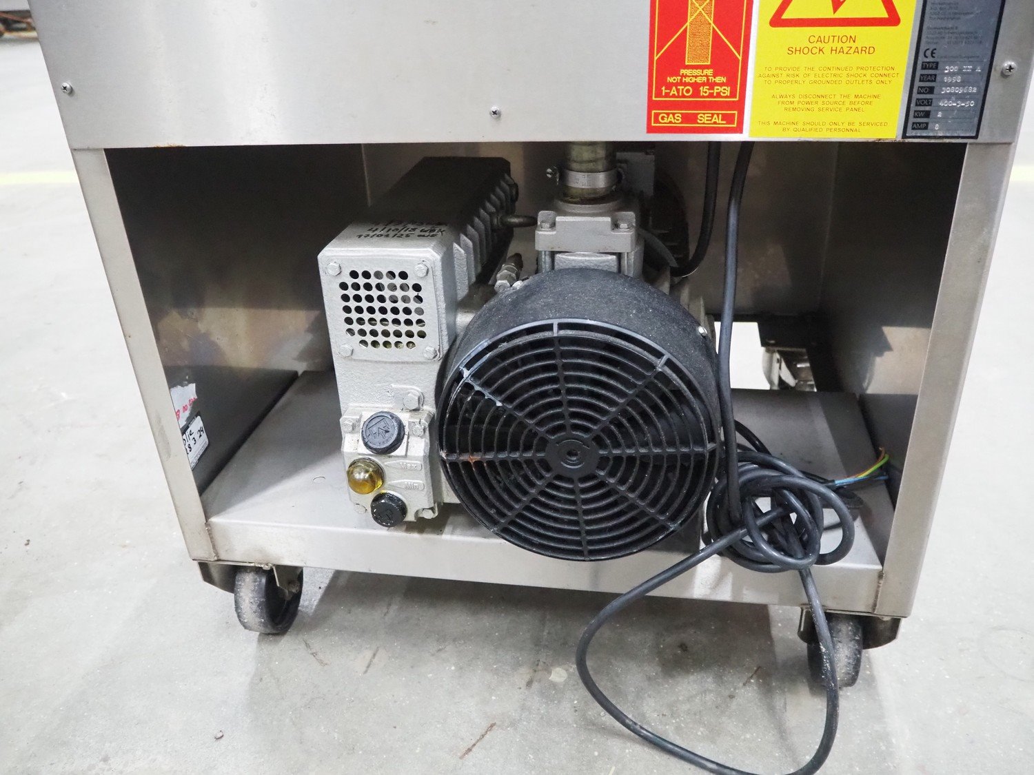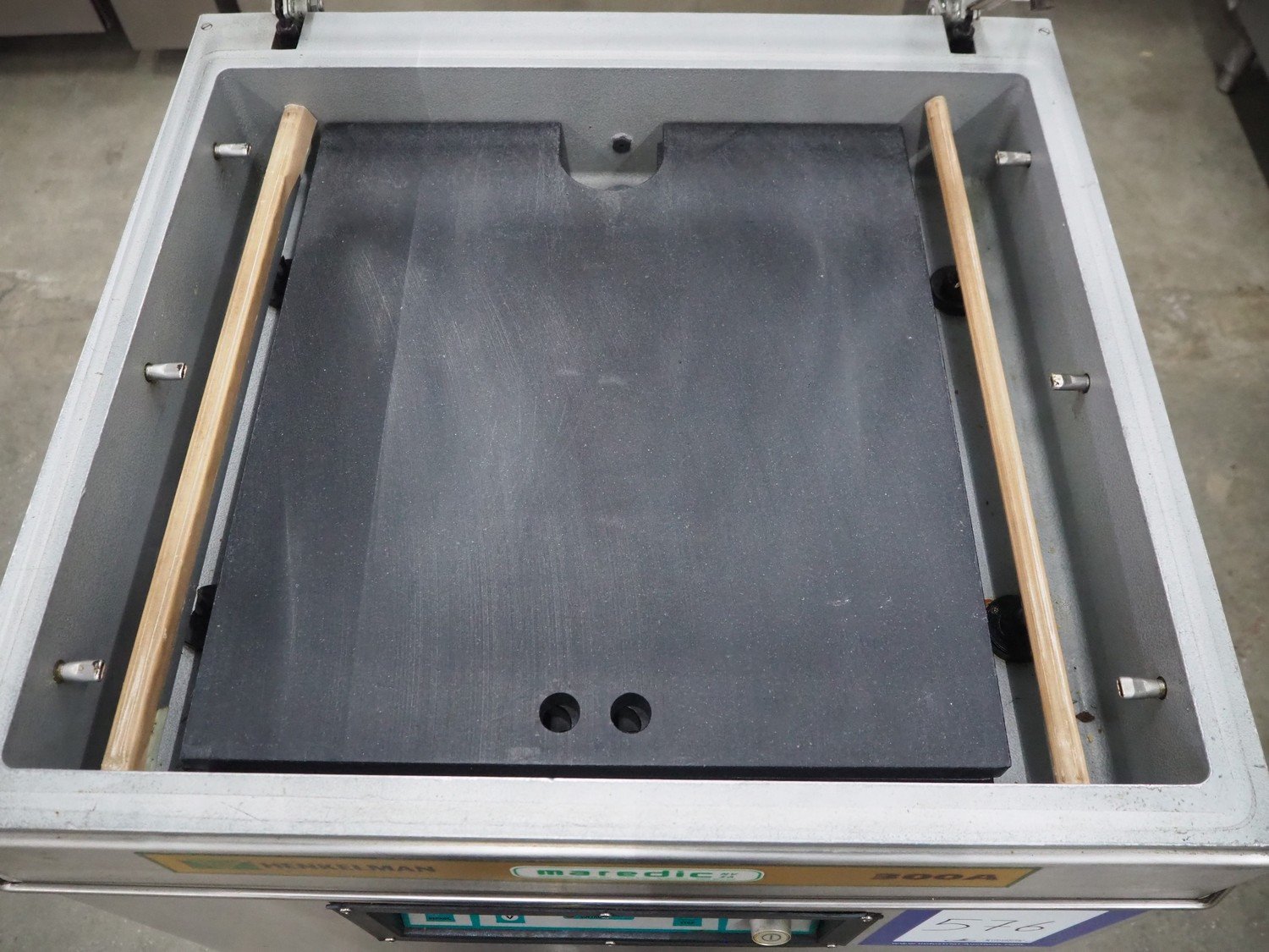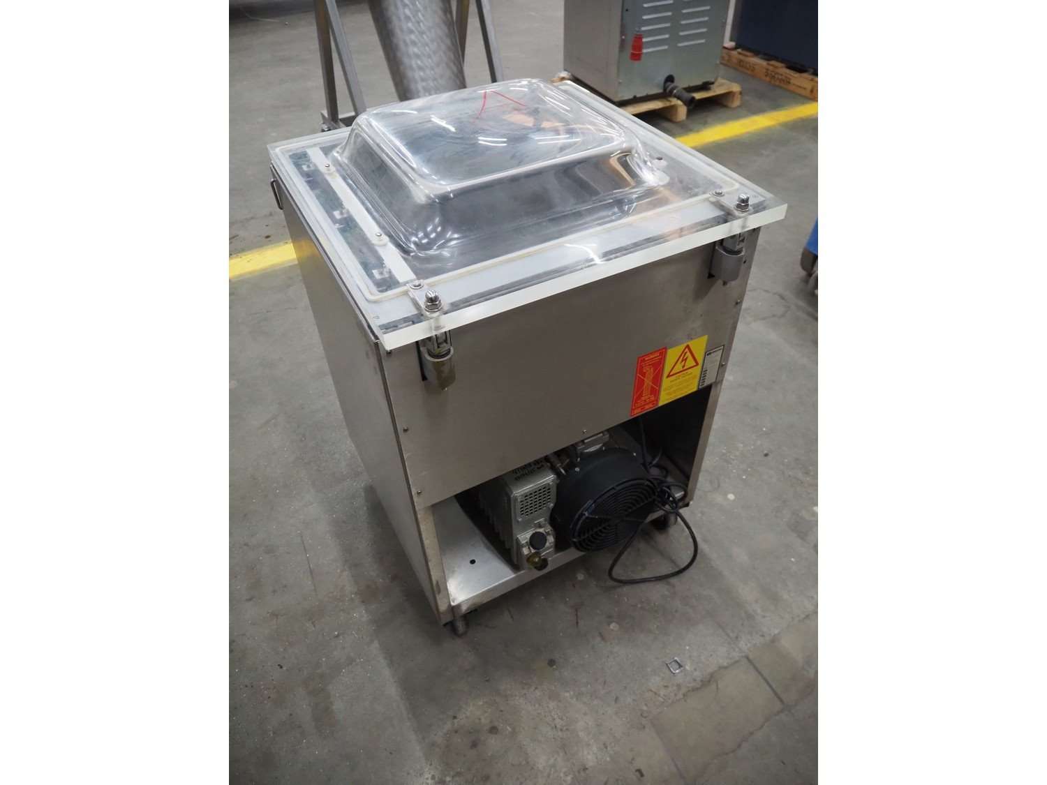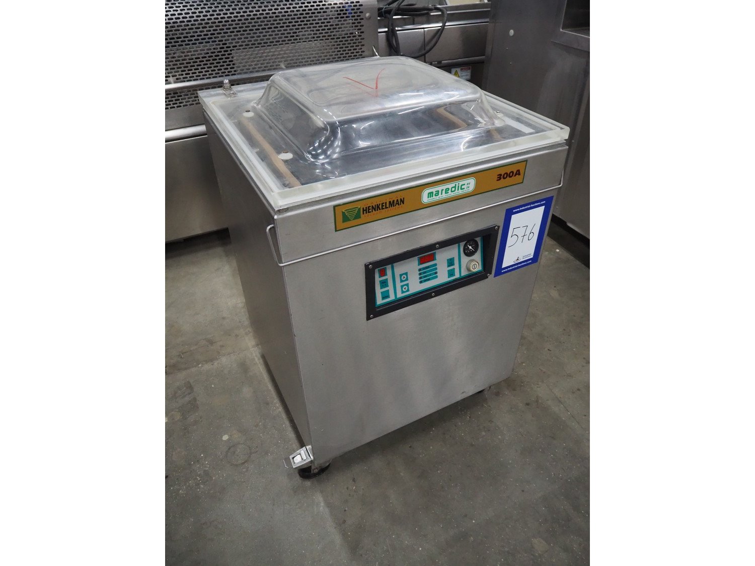 Henkelman mobile vacuum machine, type: 300 II A, number: 30809682, year of construction: 1998, 400 V, 3 Ph, 50 Hz, 6 A, 2 kW, seal length: (2x) 500 mm, dimensions chamber: 520 mm x 500 mm x 700 mm, Busch vacuum pump, type: RA 0063 E 5K1, capacity: 63 m³ per hour, total dimensions: 700 mm x 680 mm x 1070 mm.