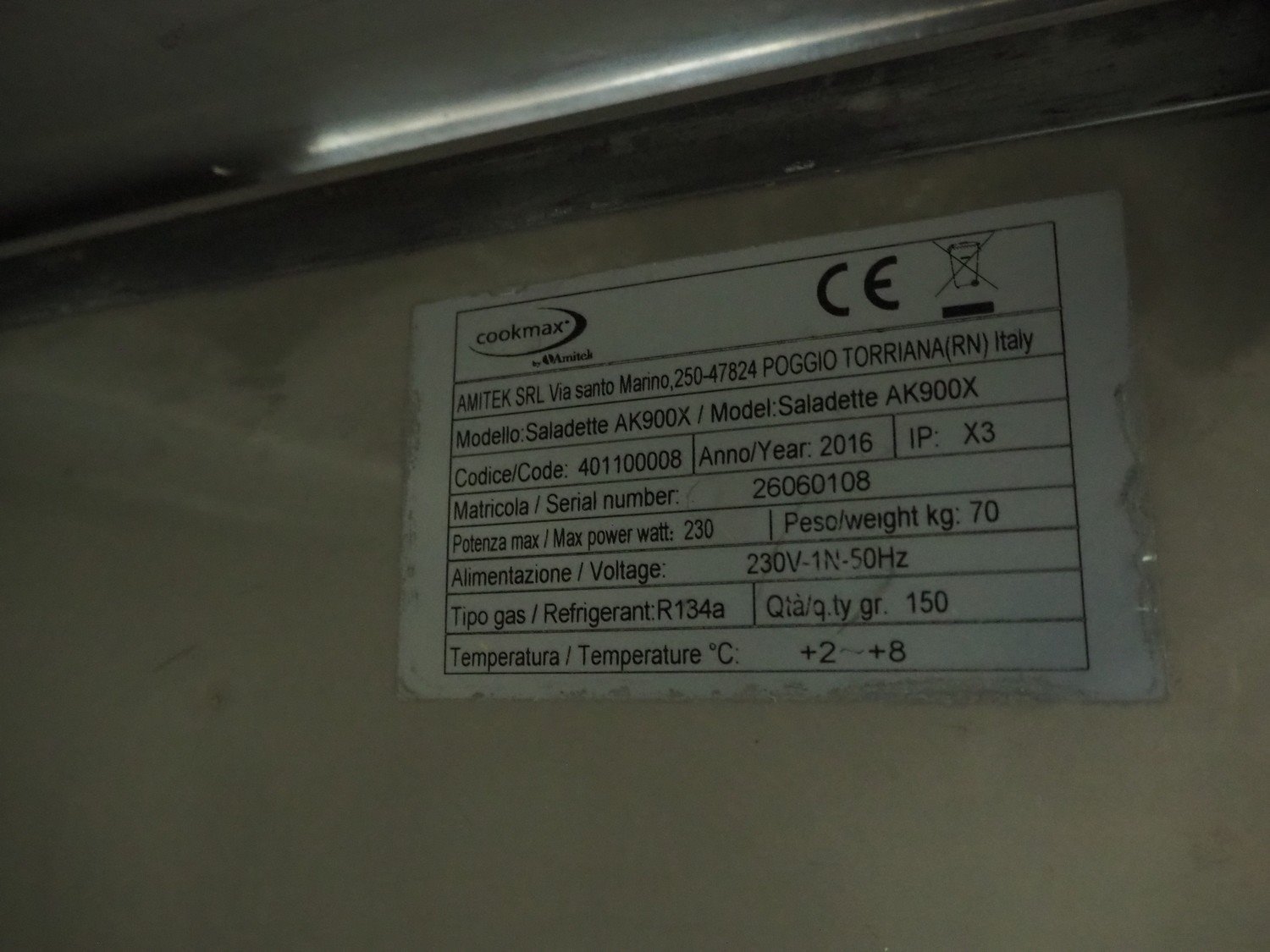Cookmax saladette, model: Saladette AK900X, serial number: 26060108, year of construction: 2016, 230 V, 1 Ph, 50 Hz, refrigerant: R134a, temperature: 2-8 ⁰C, weight: 70 kg, dimensions inside: (2x) 550 mm x 330 mm, total dimensions: 910 mm x 710 mm x 850 mm.