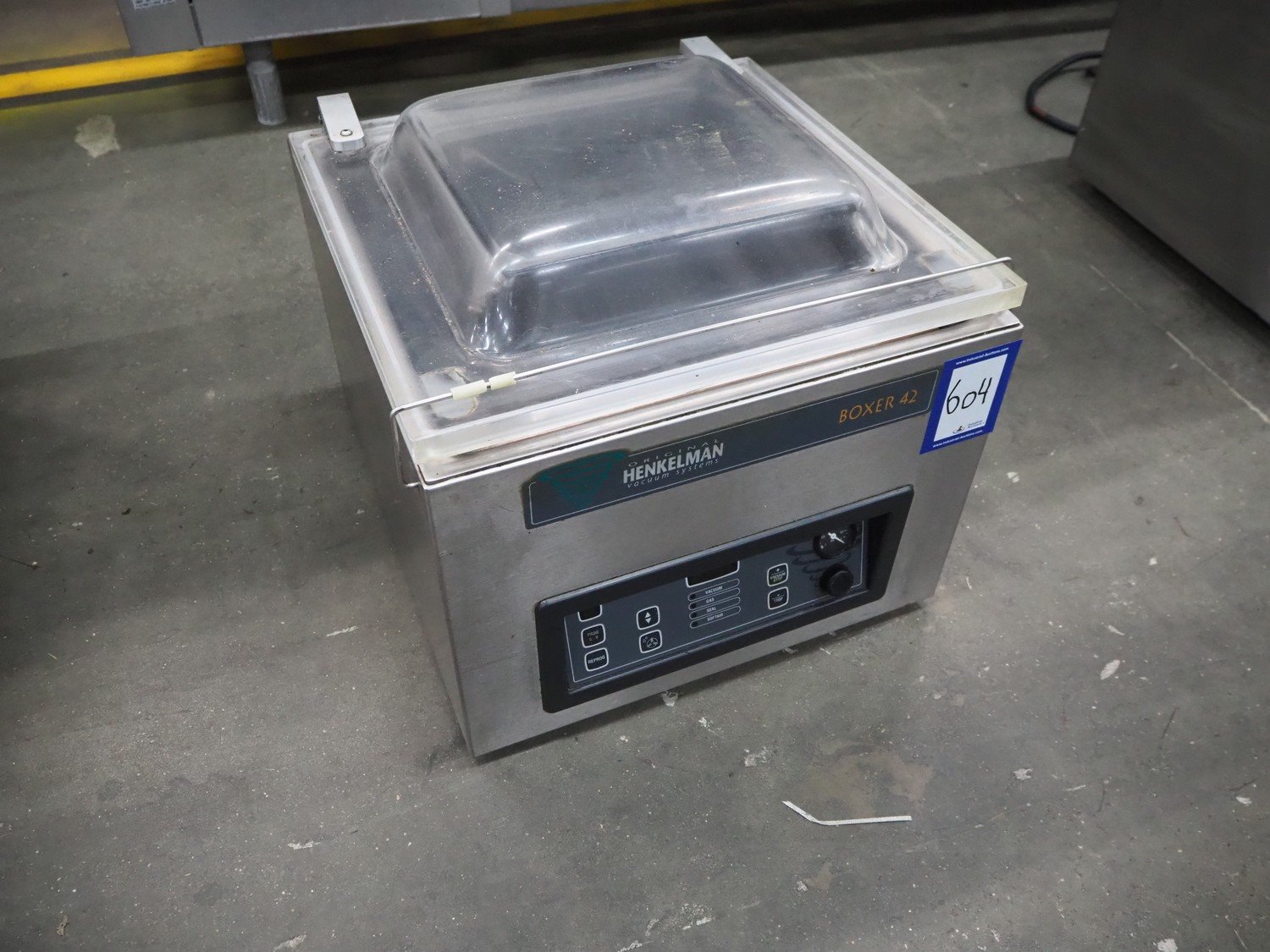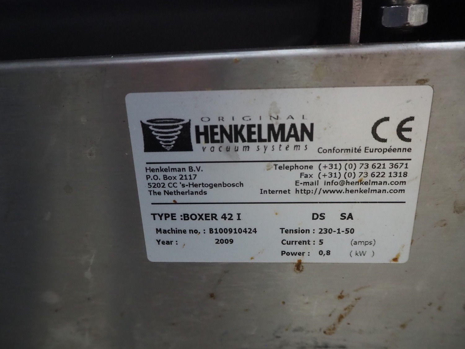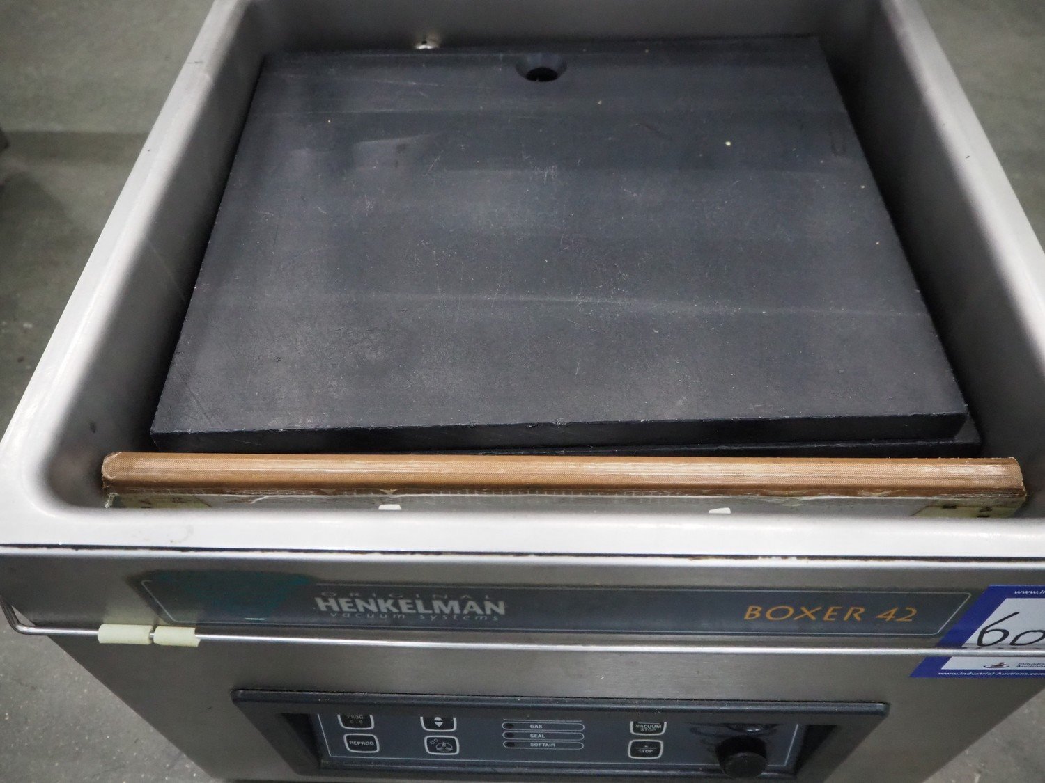 Henkelman vacuum machine, type: BOXER 42 I, machine number: B100910424, year of construction: 2009, 230 V, 1 Ph, 50 Hz, 5 A, 0.8 kW, seal length: 420 mm, dimensions chamber: 420 mm x 370 mm x 70 mm, total dimensions: 520 mm x 480 mm x 450 mm.