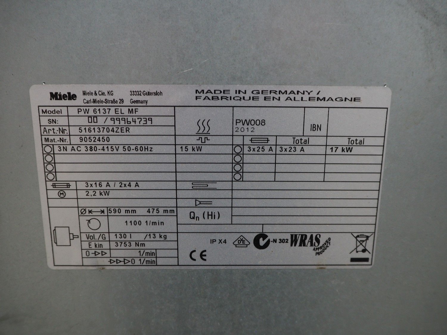 Miele dryer, type: PW 6137 EL MF, serial number: 00/99964739, 380/415 V, 3 Ph, 50/60 Hz, 3x25 A, 15 kW, dimensions: 920 mm x 820 mm x 1220 mm.