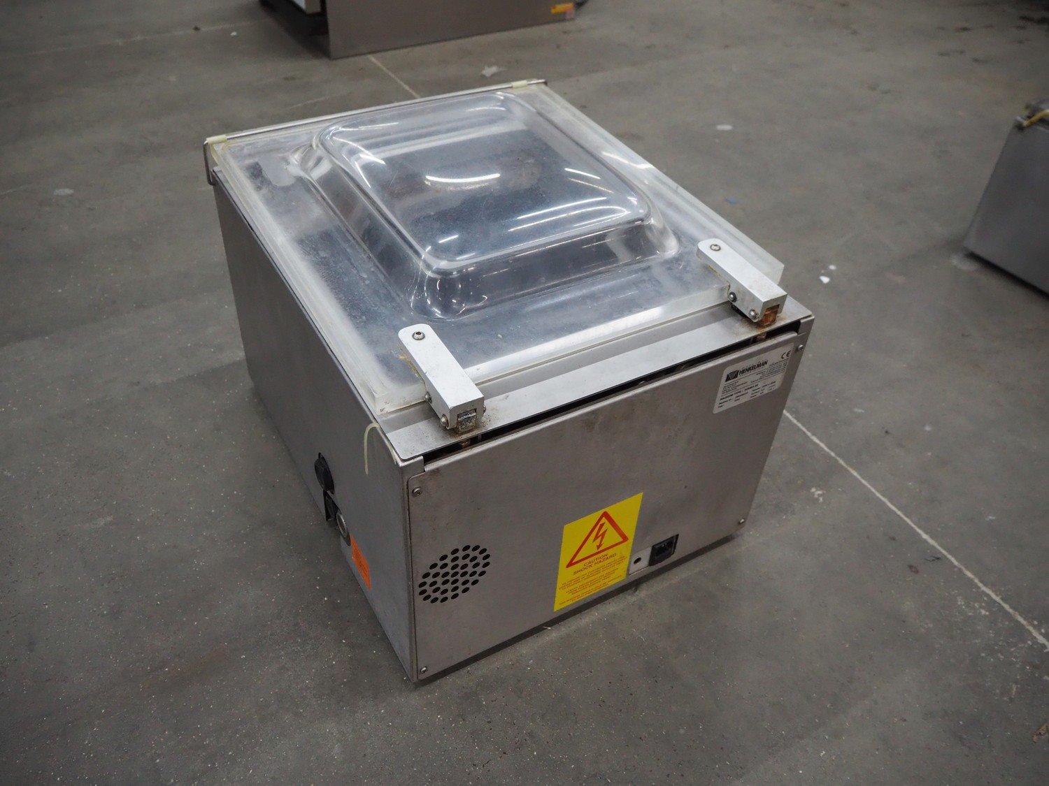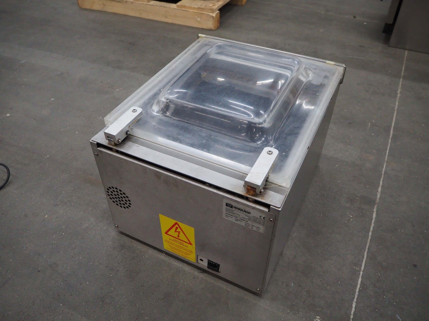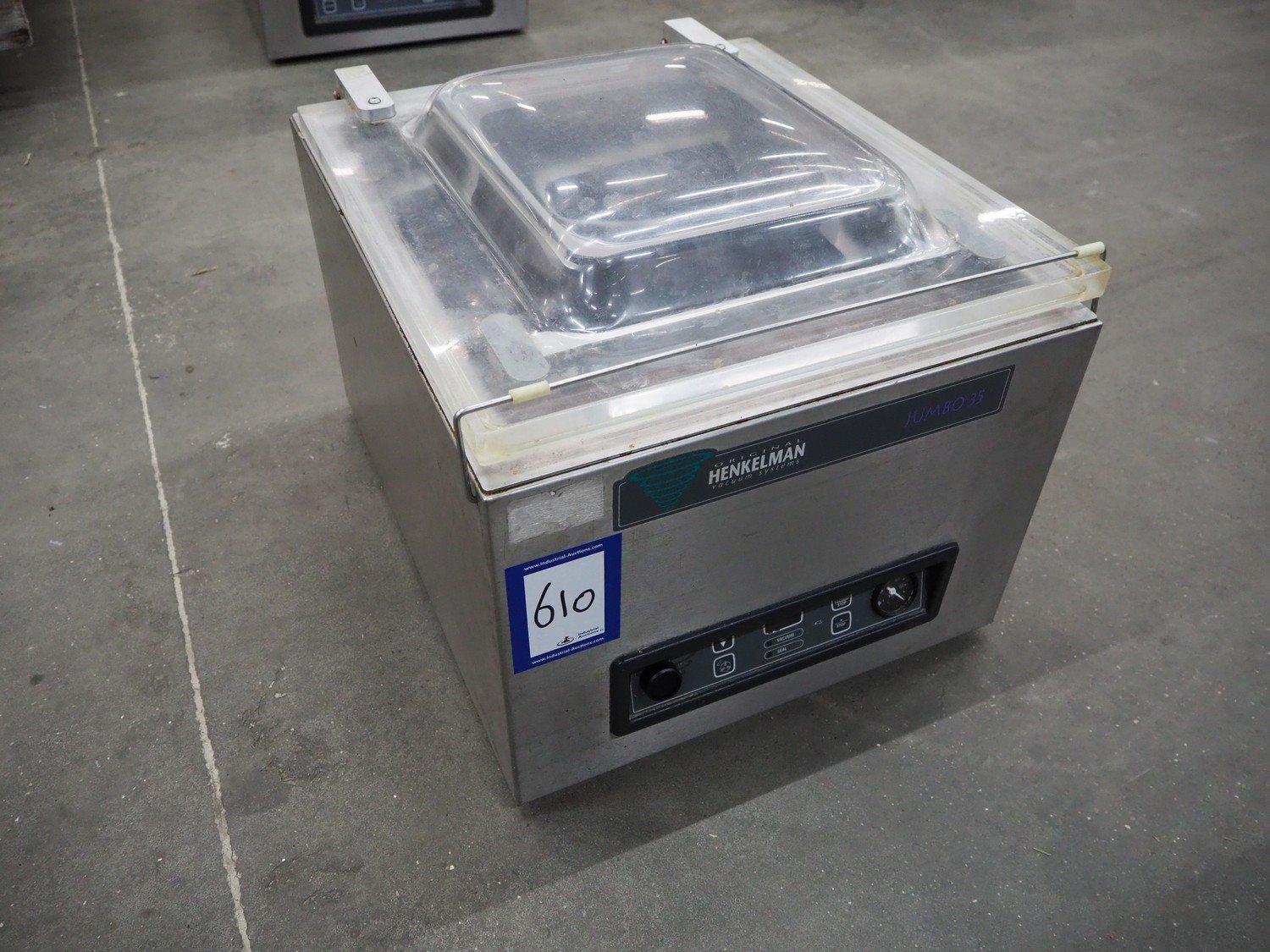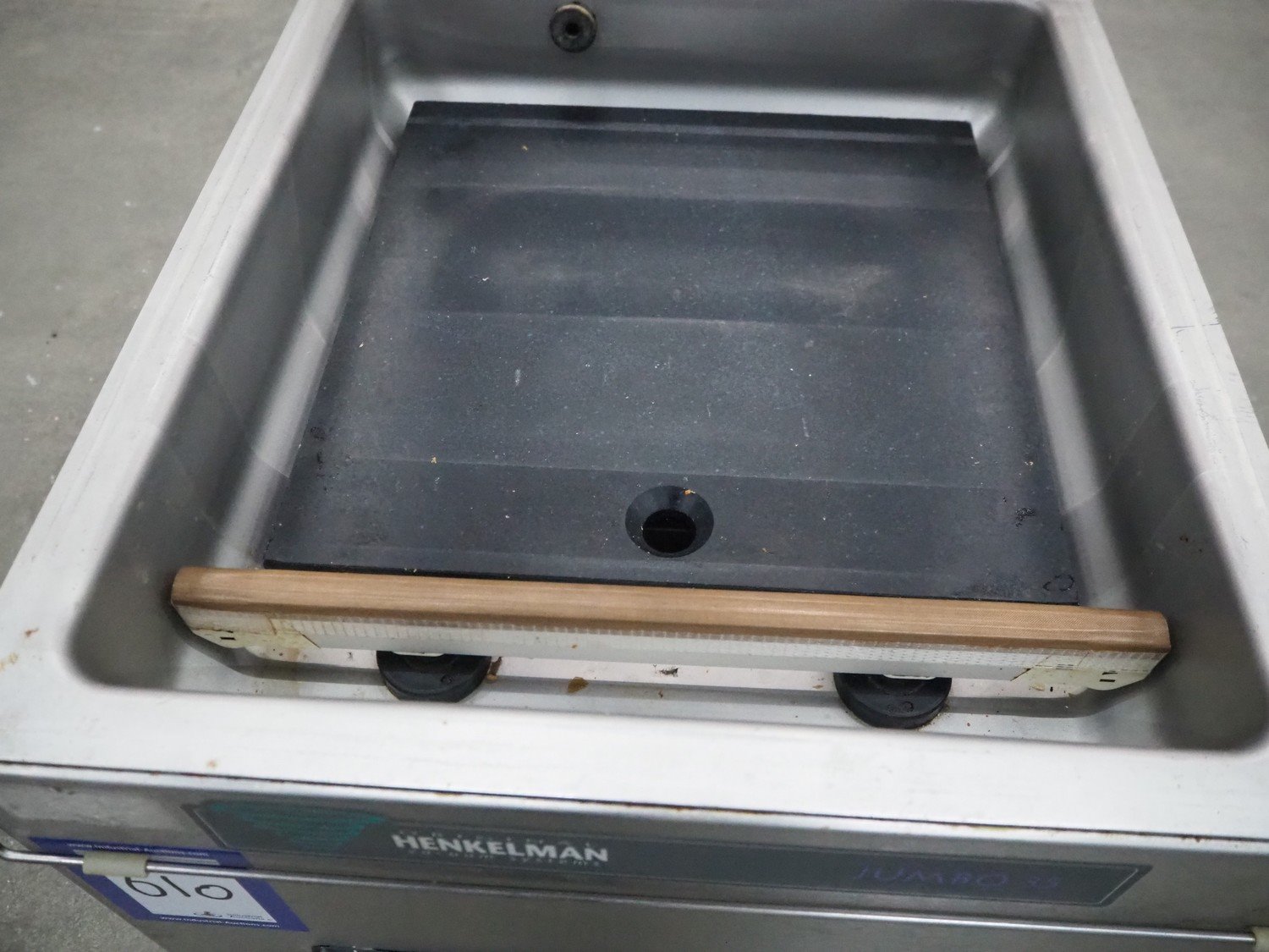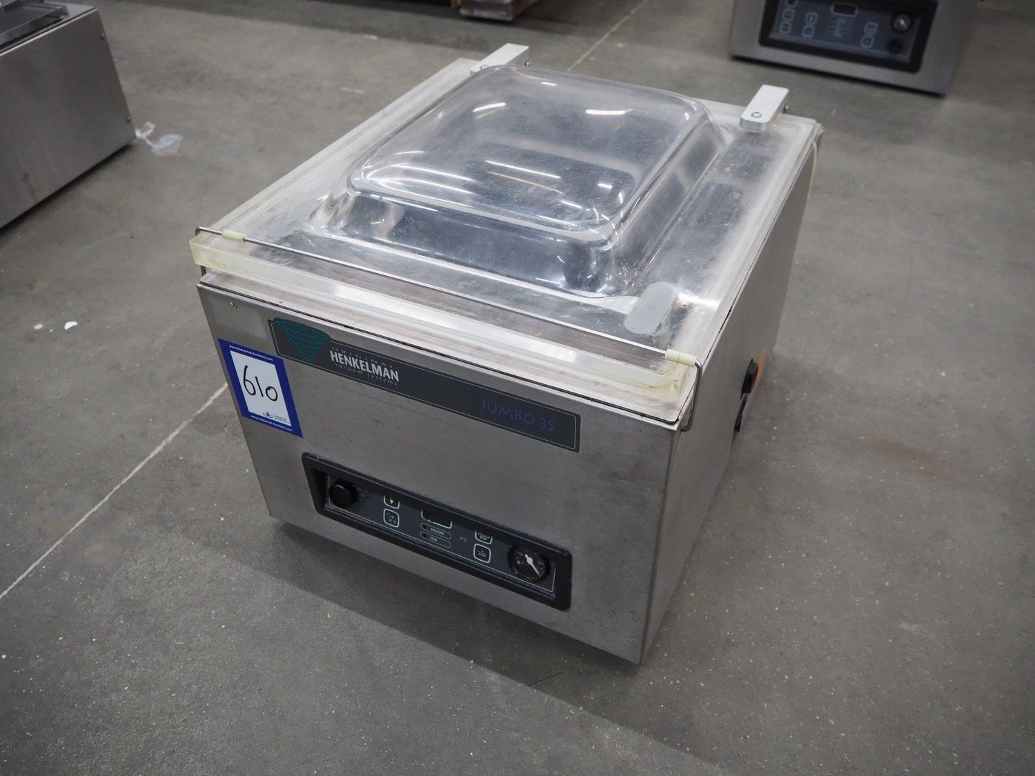 Henkelman vacuum machine, type: JUMBO 35, machine number: J200509131, year of construction: 2005, 230 V, 1 Ph, 50 Hz, 4.5 A, 0.6 kW, seal length: 360 mm, dimensions chamber: 360 mm x 365 mm x 45 mm, total dimensions: 550 mm x 450 mm x 430 mm.