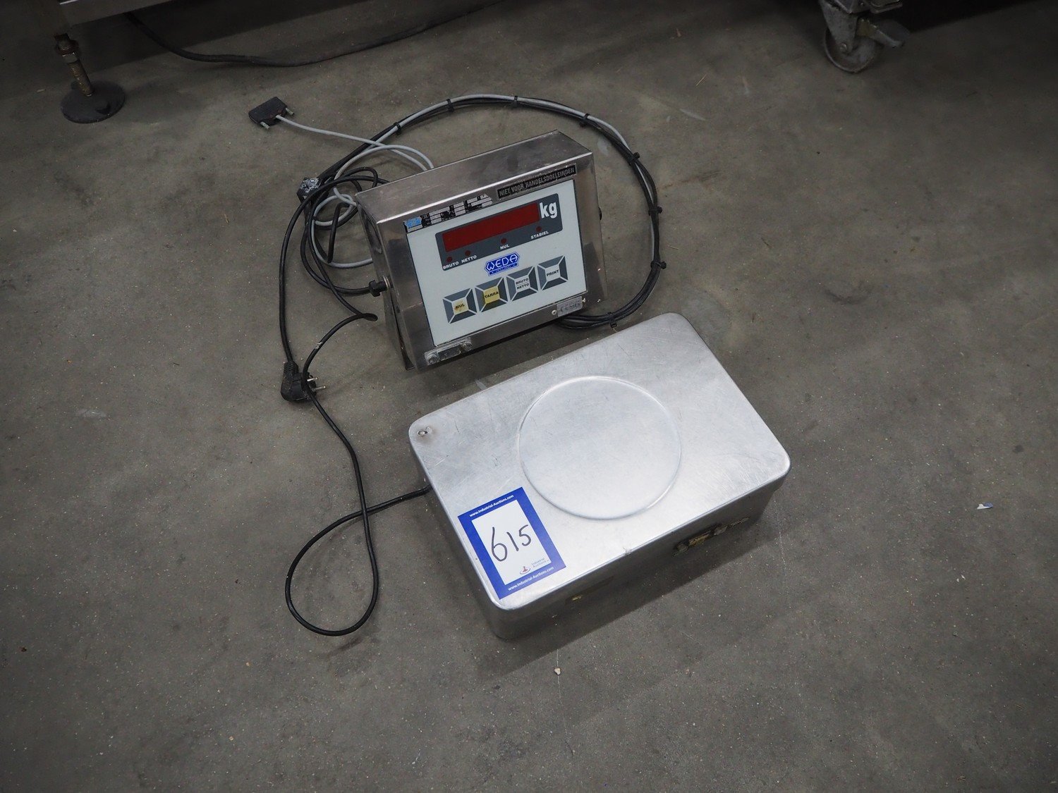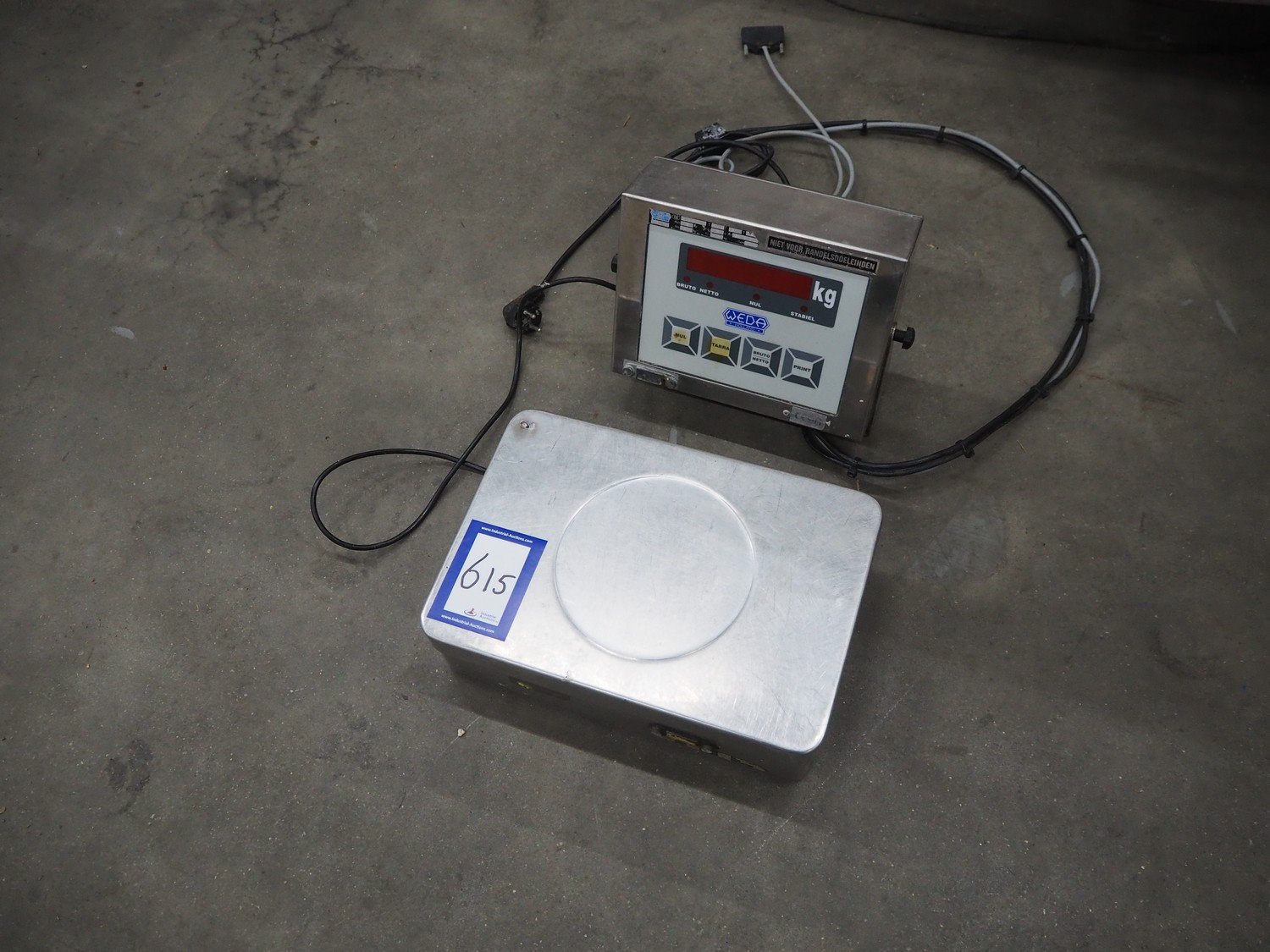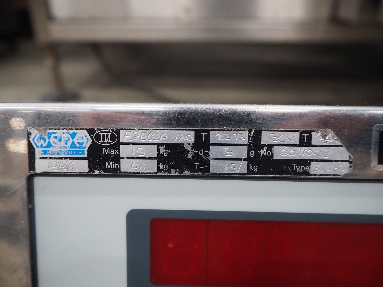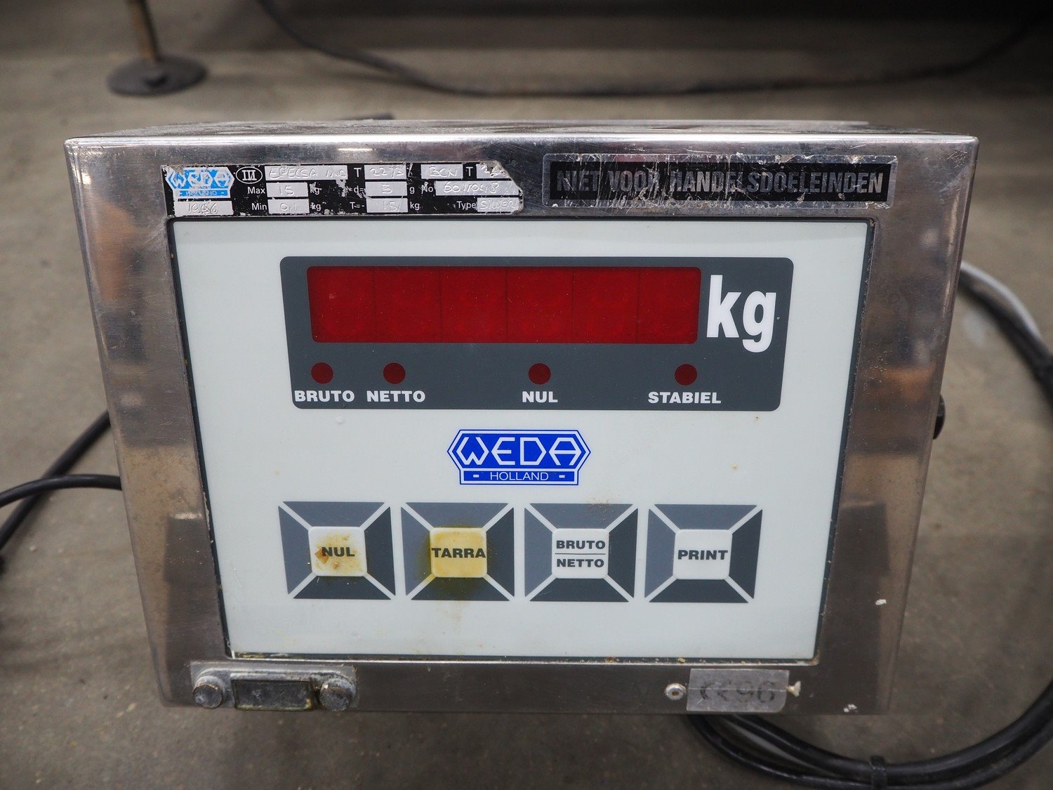 WEDA weighing scale with indicator, number: 6011048, maximum: 15 kg, minimum: 0.1 kg, e=d=5g, dimensions scale: 360 mm x 240 mm x 110 mm.