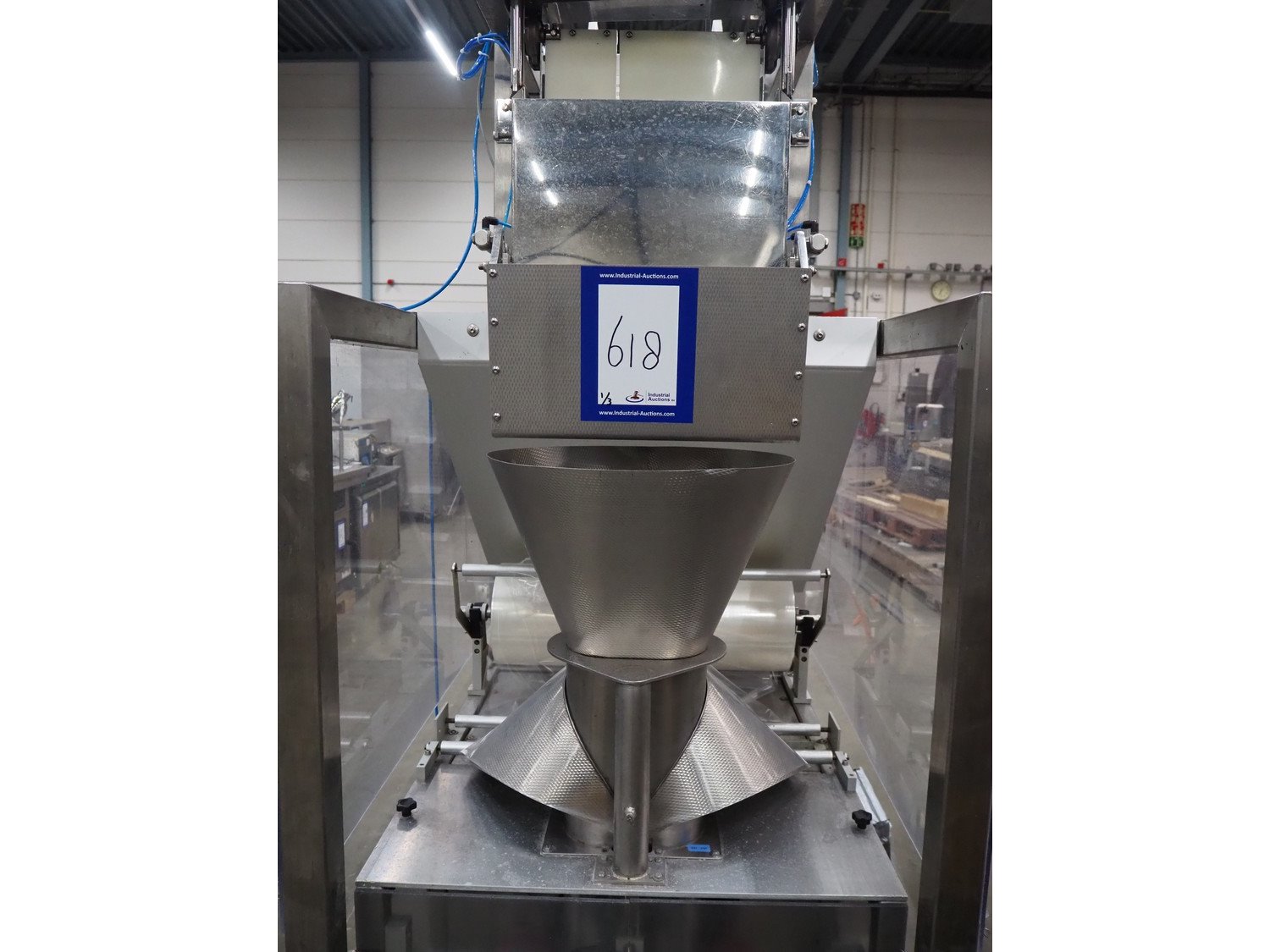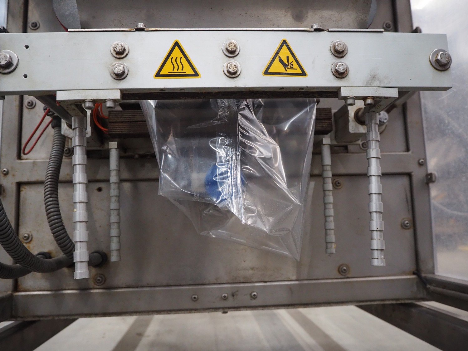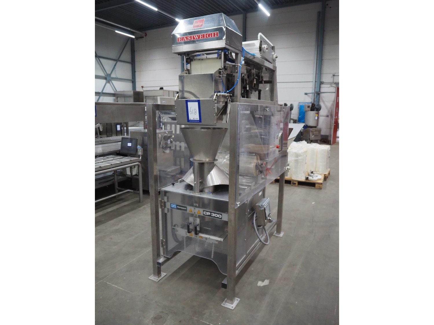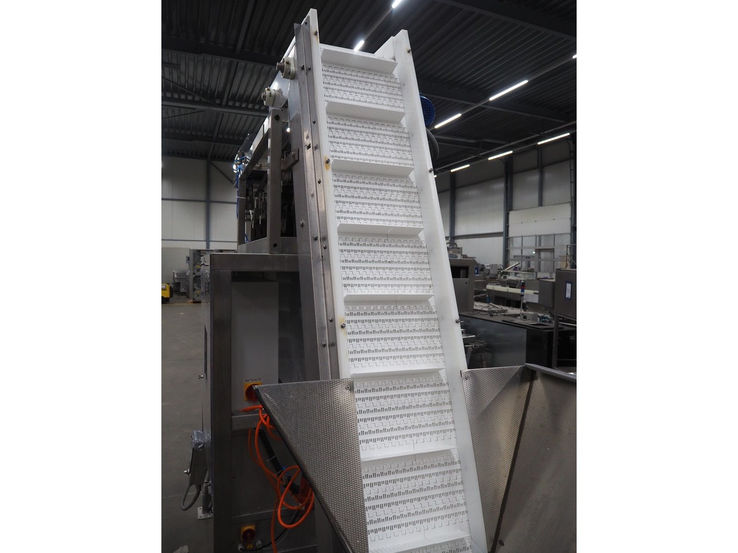 GKS Packaging vertical bag form, fill and seal machine with elevating belt, type: CP300HS-T, serial number: 04421, year of construction: 2012-01, plastic belt with dividers, belt width: 340 mm, distance between dividers: 195 mm, divider height: 50 mm, gutter width: 210 mm, film width: 640 mm, seal width: (2x) 350 mm, seal length: 240 mm, total dimensions: 3150 mm x 1000 mm x 2550 mm. Including 2 pallets with 20 film rolls .