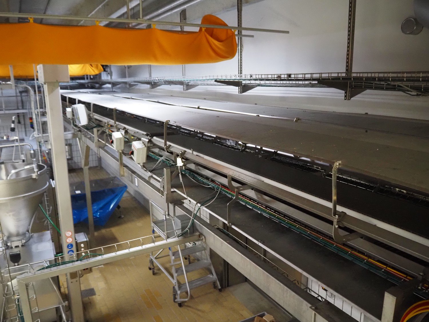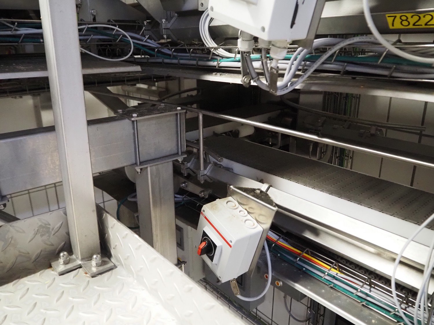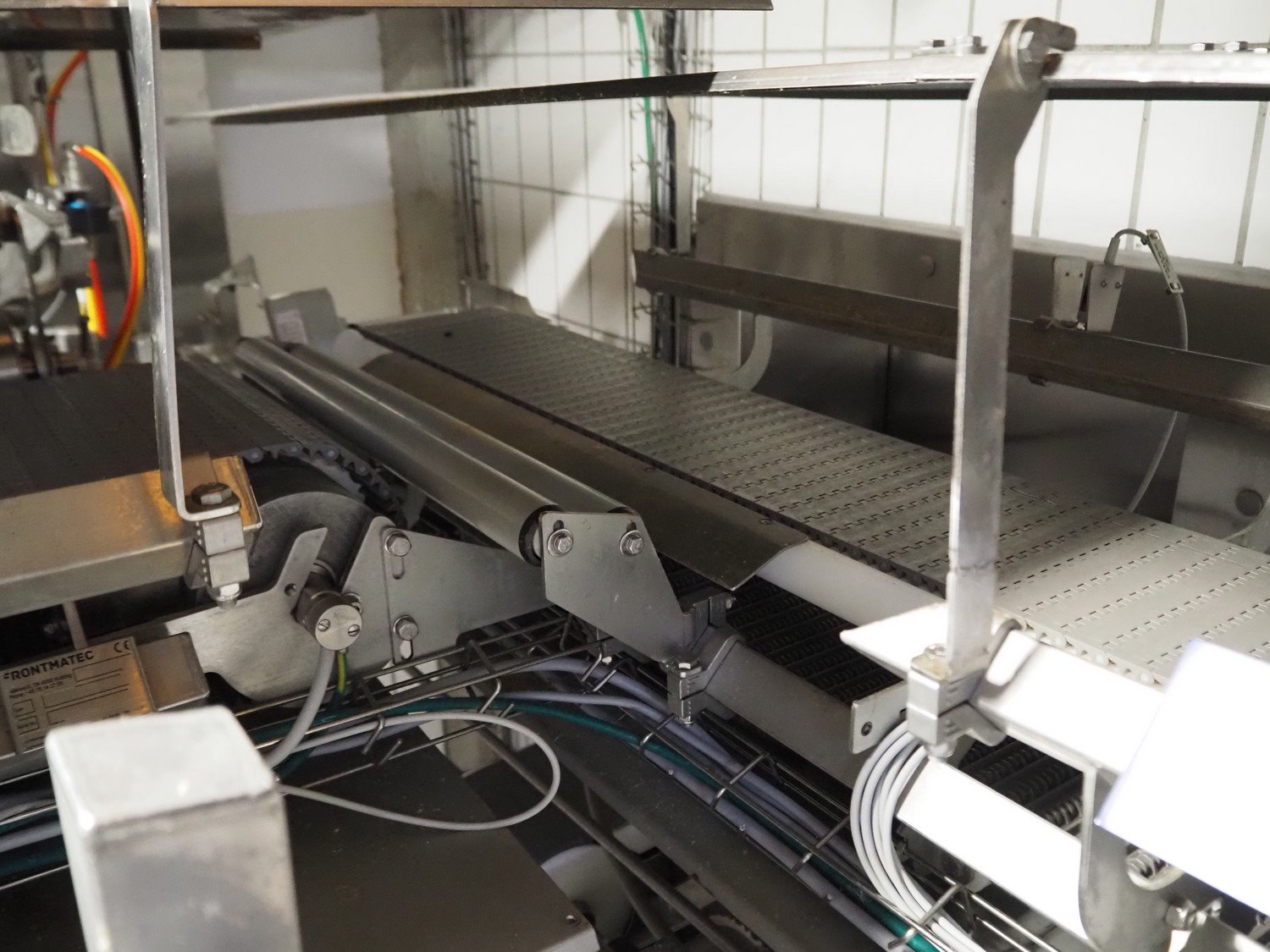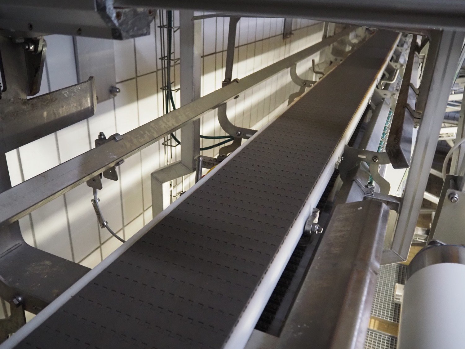 Frontmatec infeed buffer conveyor for crates, s/s frame, plastic belt, belt width: 290 mm / 180 mm, total length: approximately 40 meter. Including working platforms.