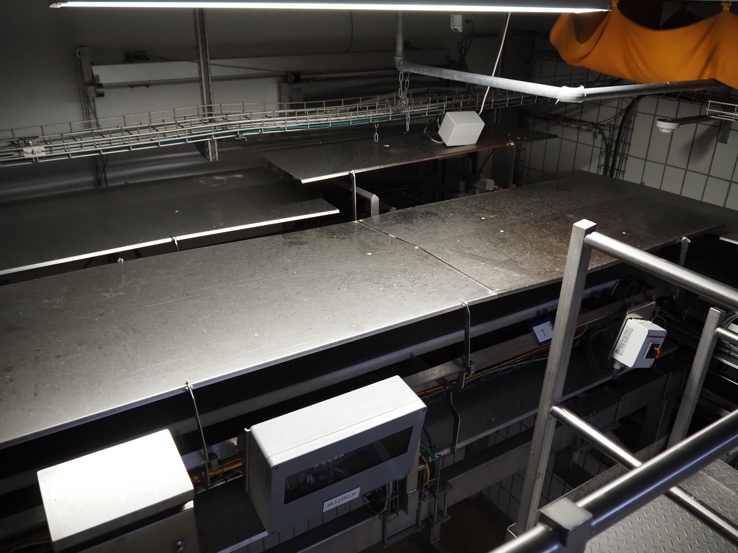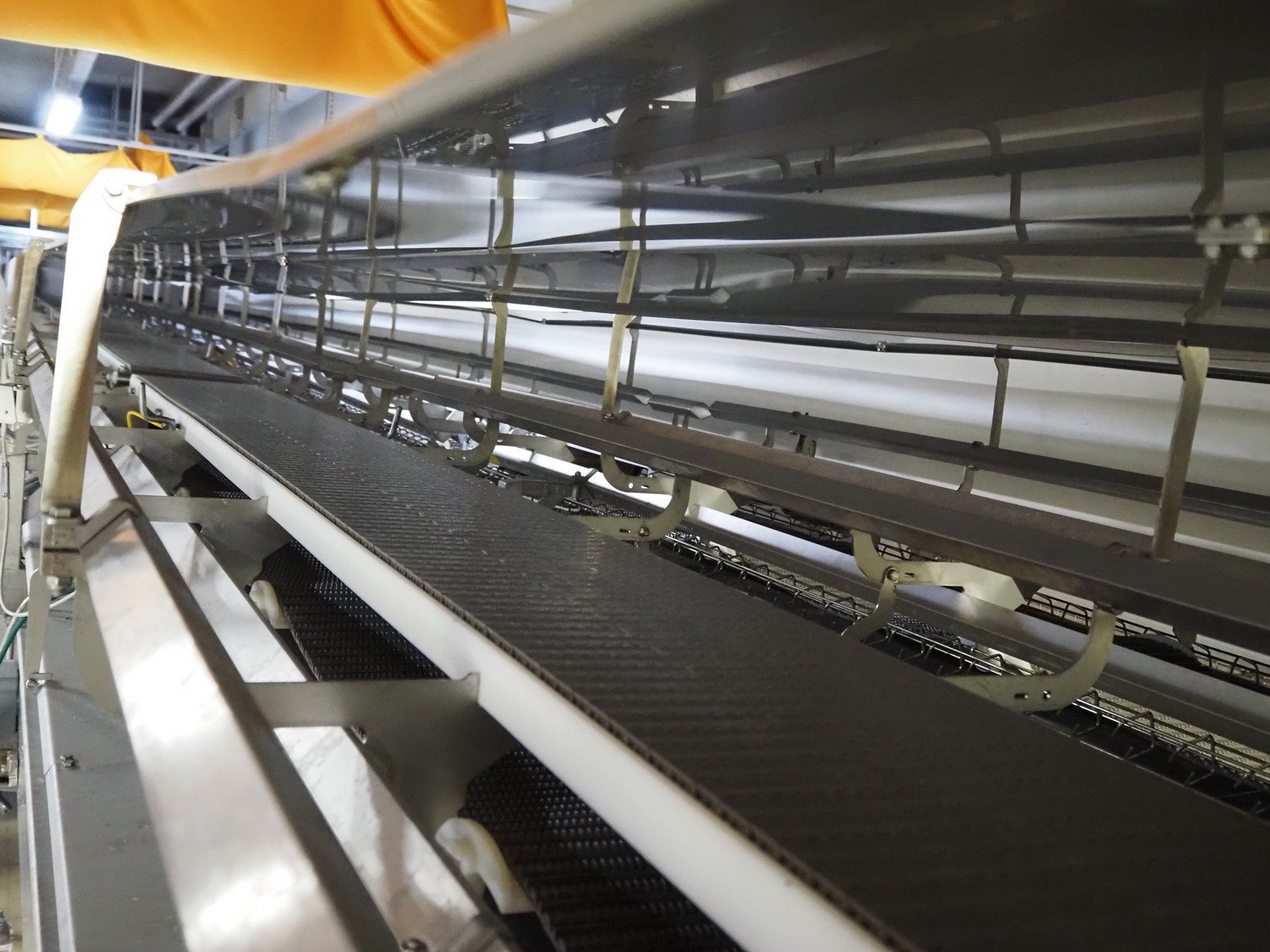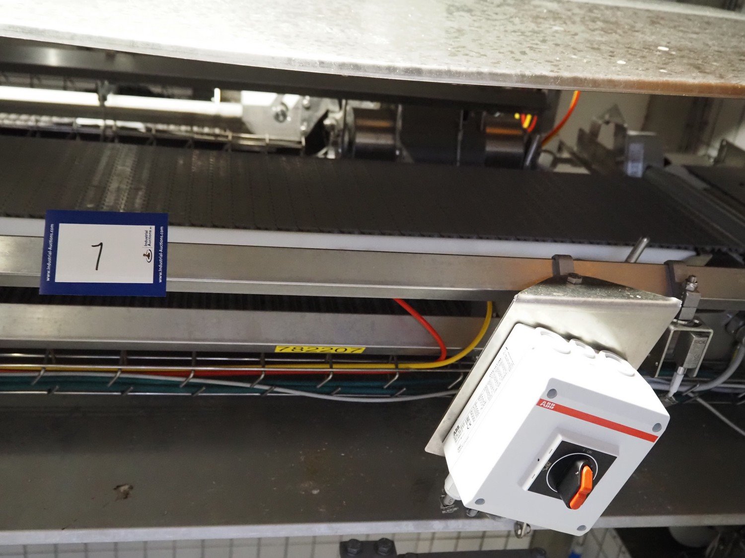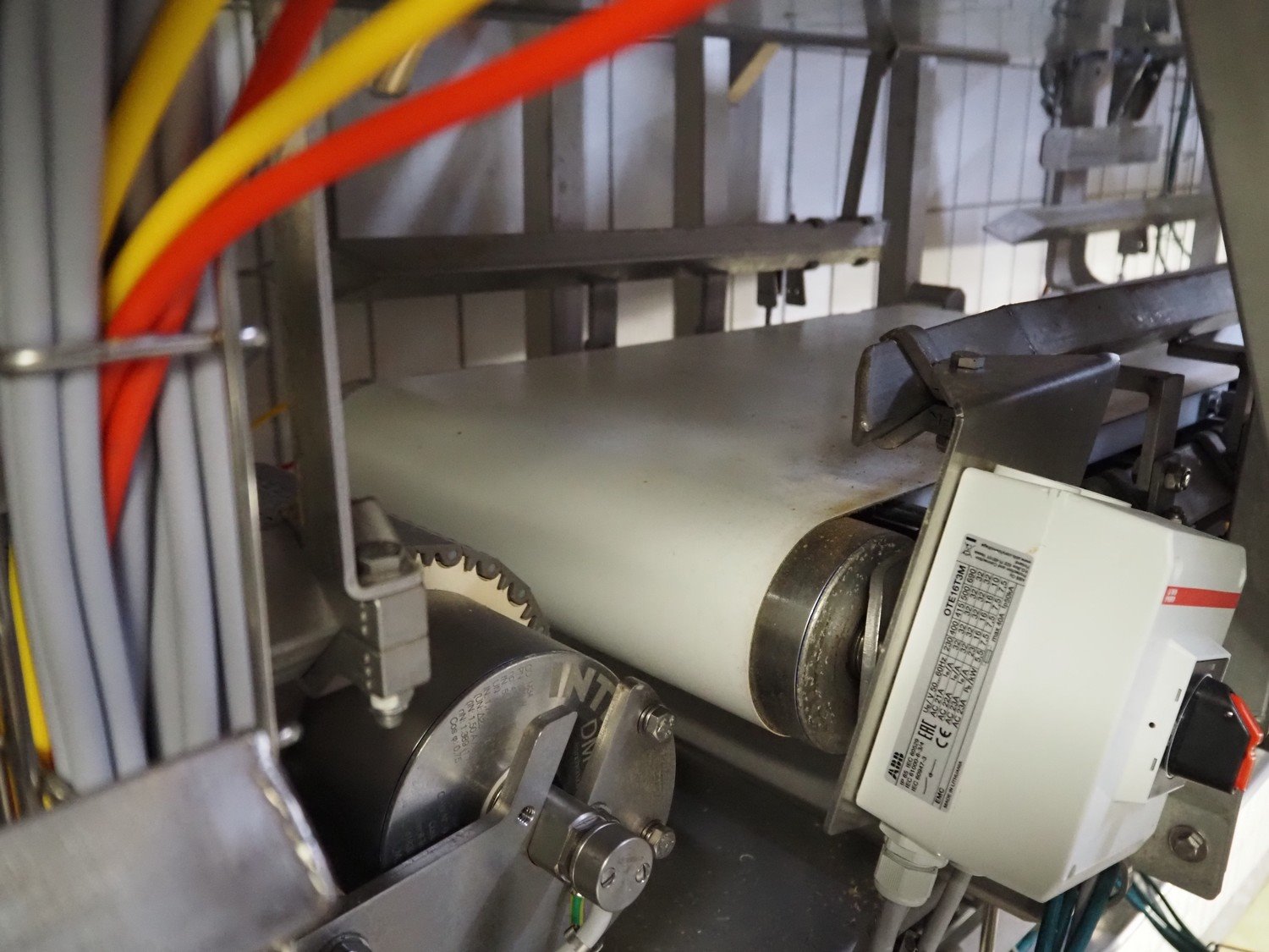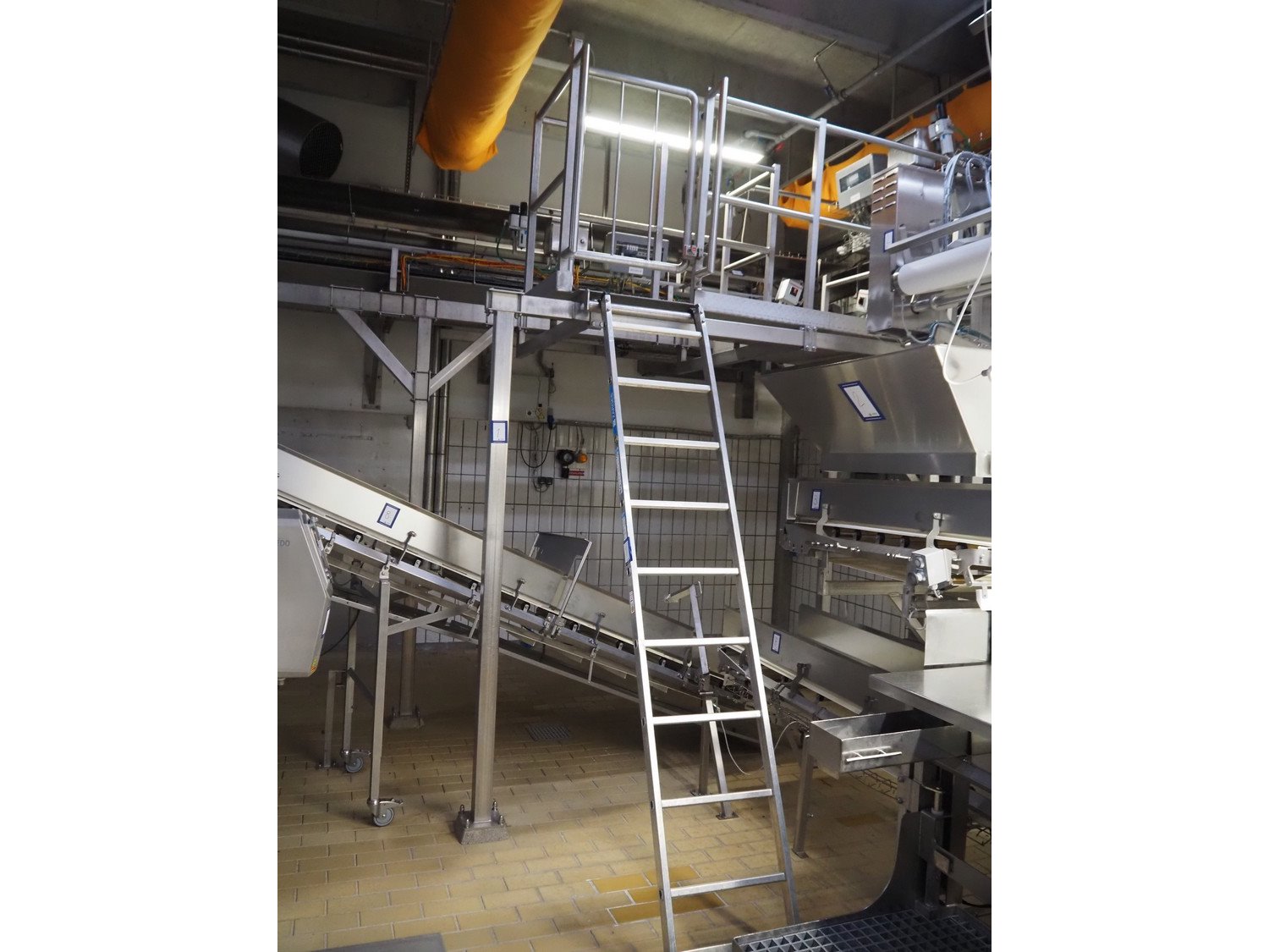 Frontmatec infeed buffer conveyor for crates, s/s frame, plastic belt, belt width: 290 mm / 180 mm, total length: approximately 40 meter. Including working platforms.