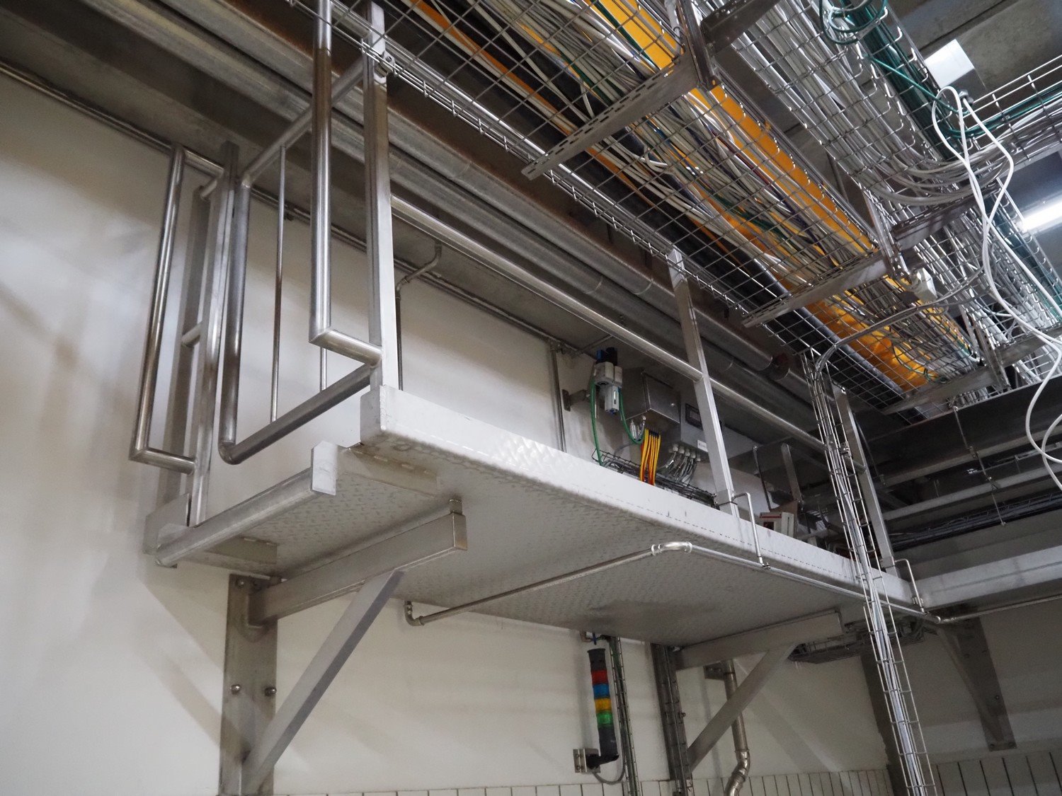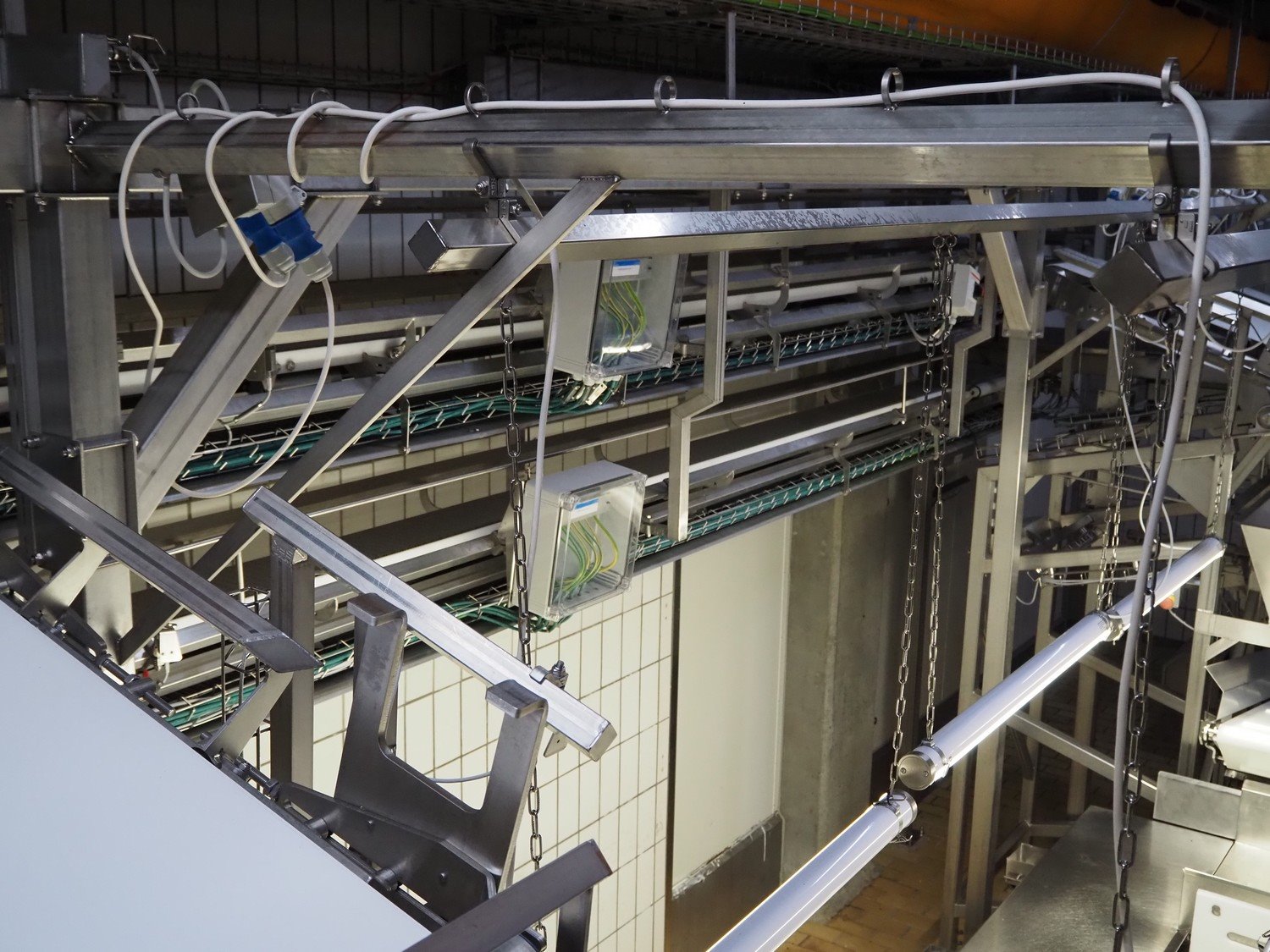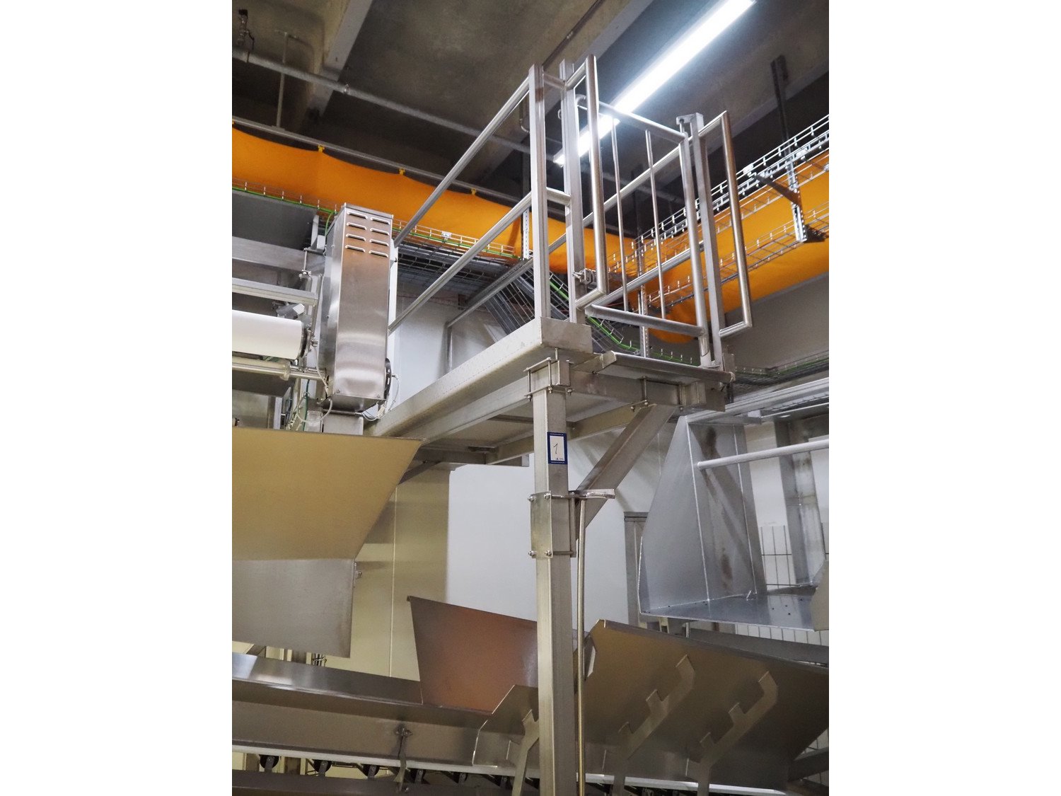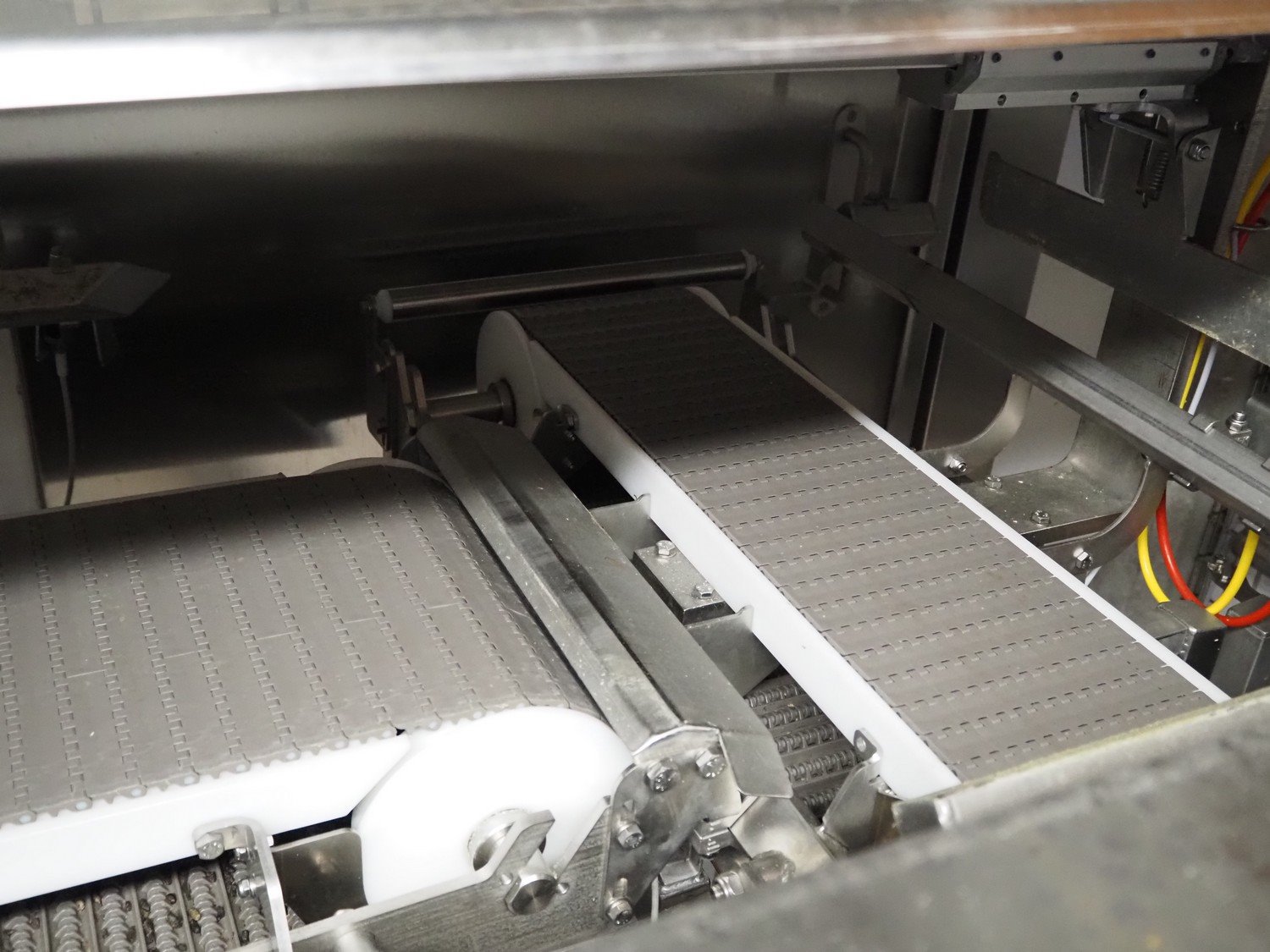 Frontmatec infeed buffer conveyor for crates, s/s frame, plastic belt, belt width: 290 mm / 180 mm, total length: approximately 40 meter. Including working platforms.