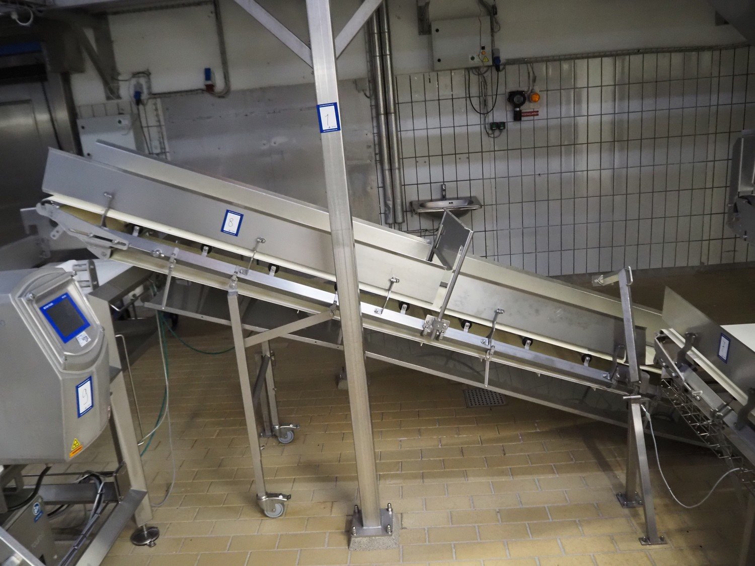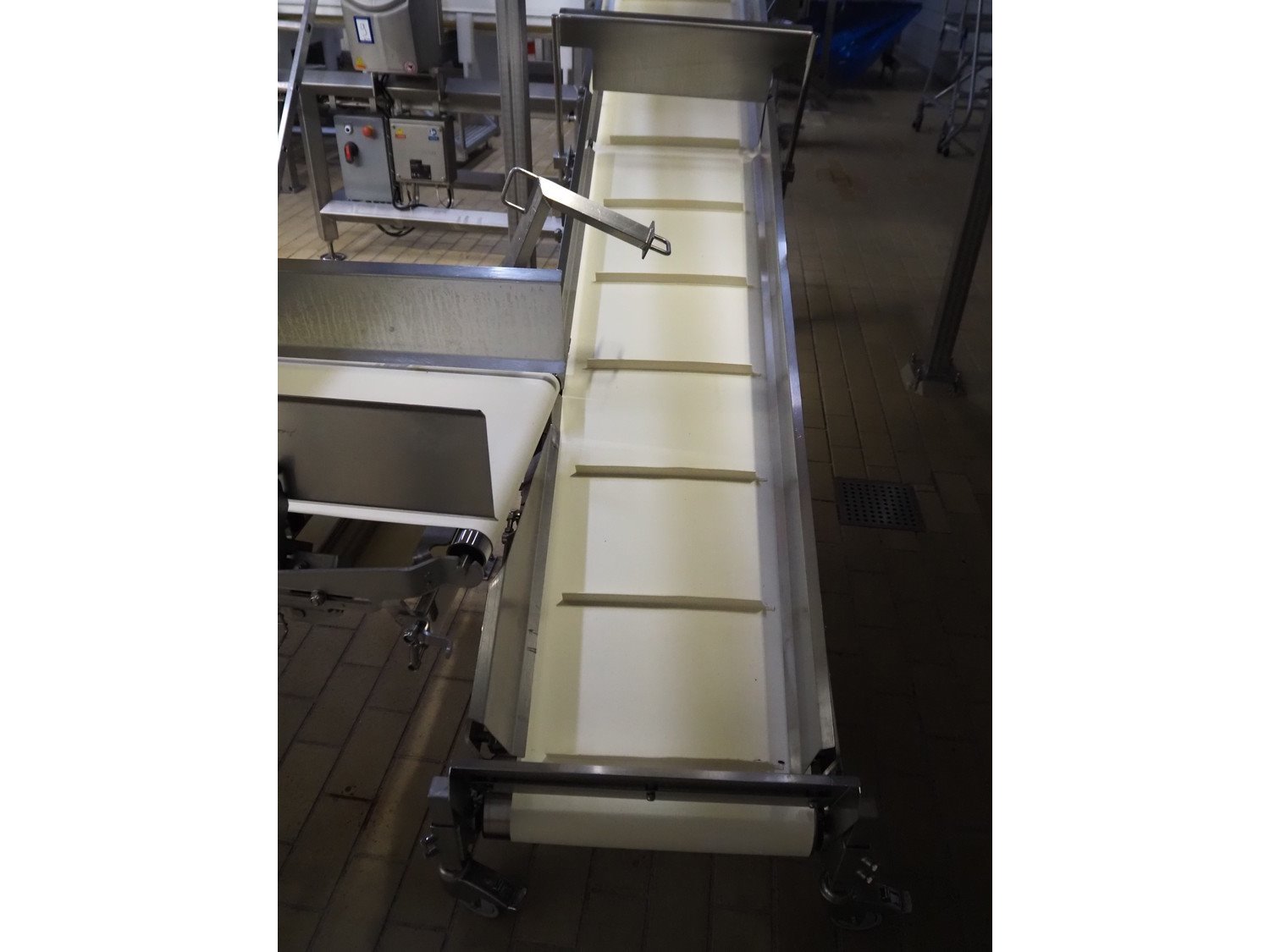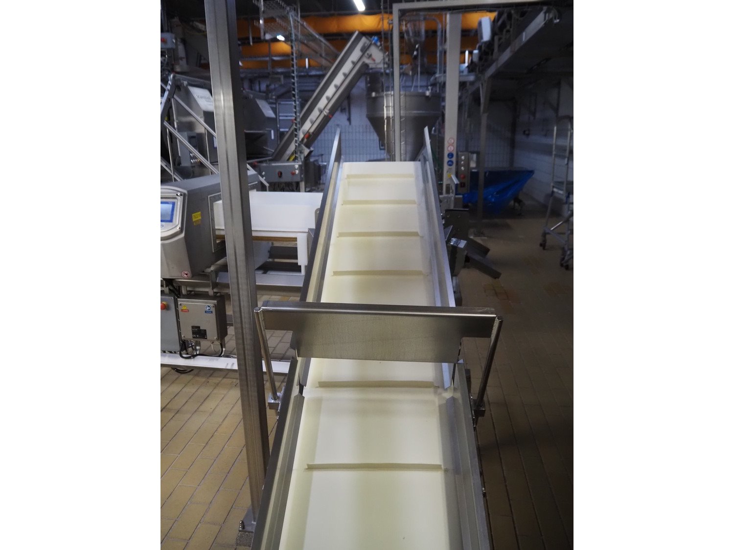 Frontmatec elevating belt, type: 1100224874, serial number: 16986-02-06-0025, year of construction: 05-05-2021, s/s frame, plastic belt with dividers, belt width: 450 mm, divider height: 30 mm, distance between dividers: 290 mm, elevating height: 1550 mm, total dimensions: 3400 mm x 600 mm x 1750 mm.
