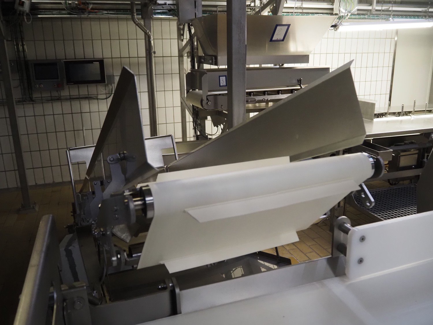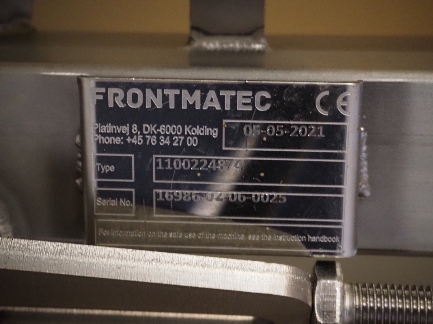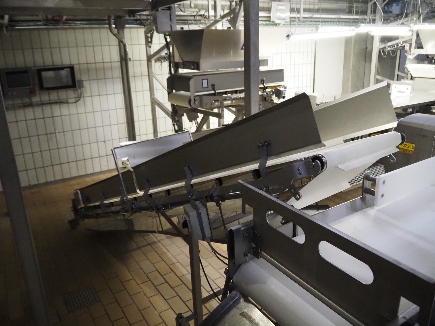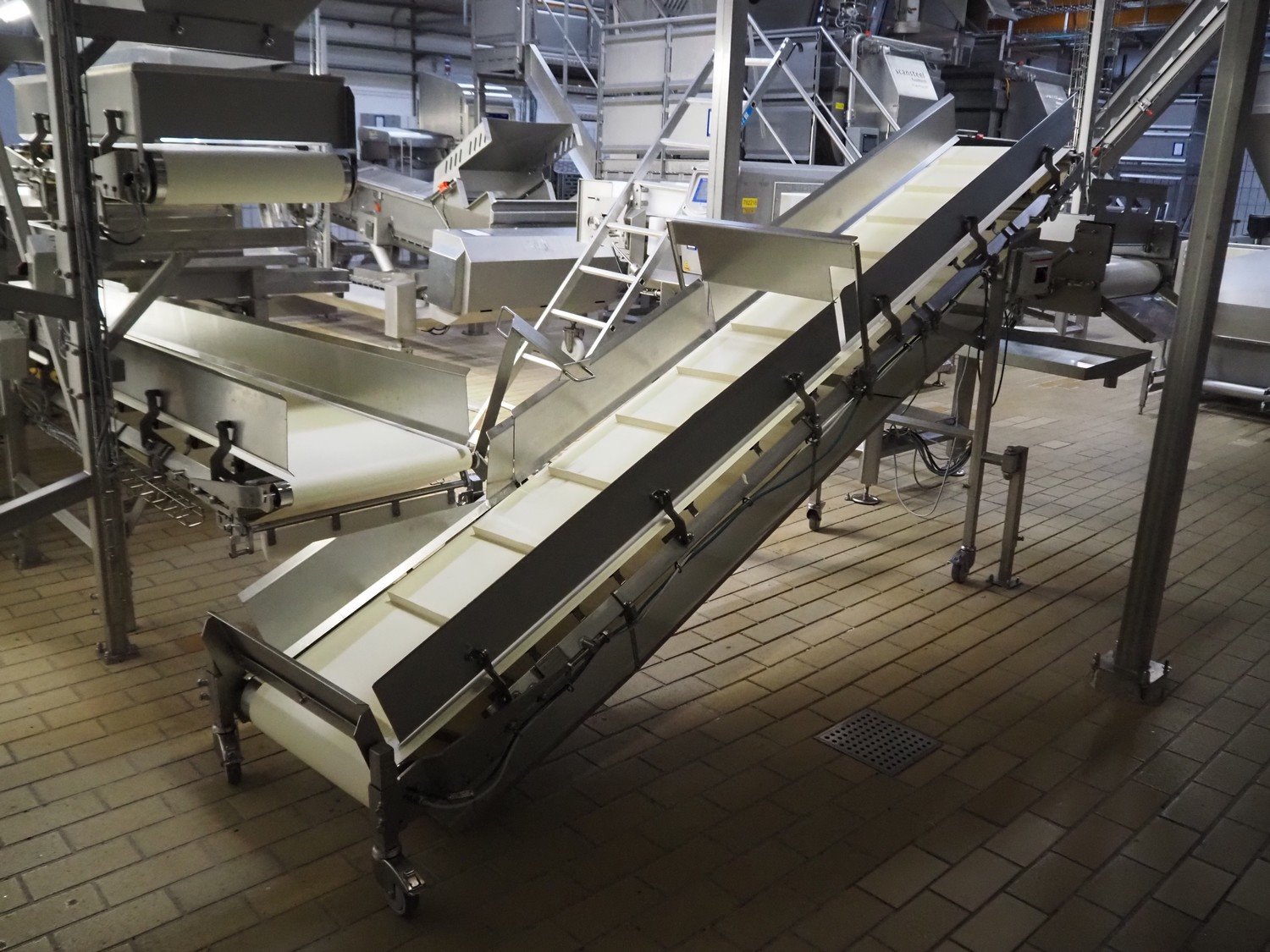 Frontmatec elevating belt, type: 1100224874, serial number: 16986-02-06-0025, year of construction: 05-05-2021, s/s frame, plastic belt with dividers, belt width: 450 mm, divider height: 30 mm, distance between dividers: 290 mm, elevating height: 1550 mm, total dimensions: 3400 mm x 600 mm x 1750 mm.