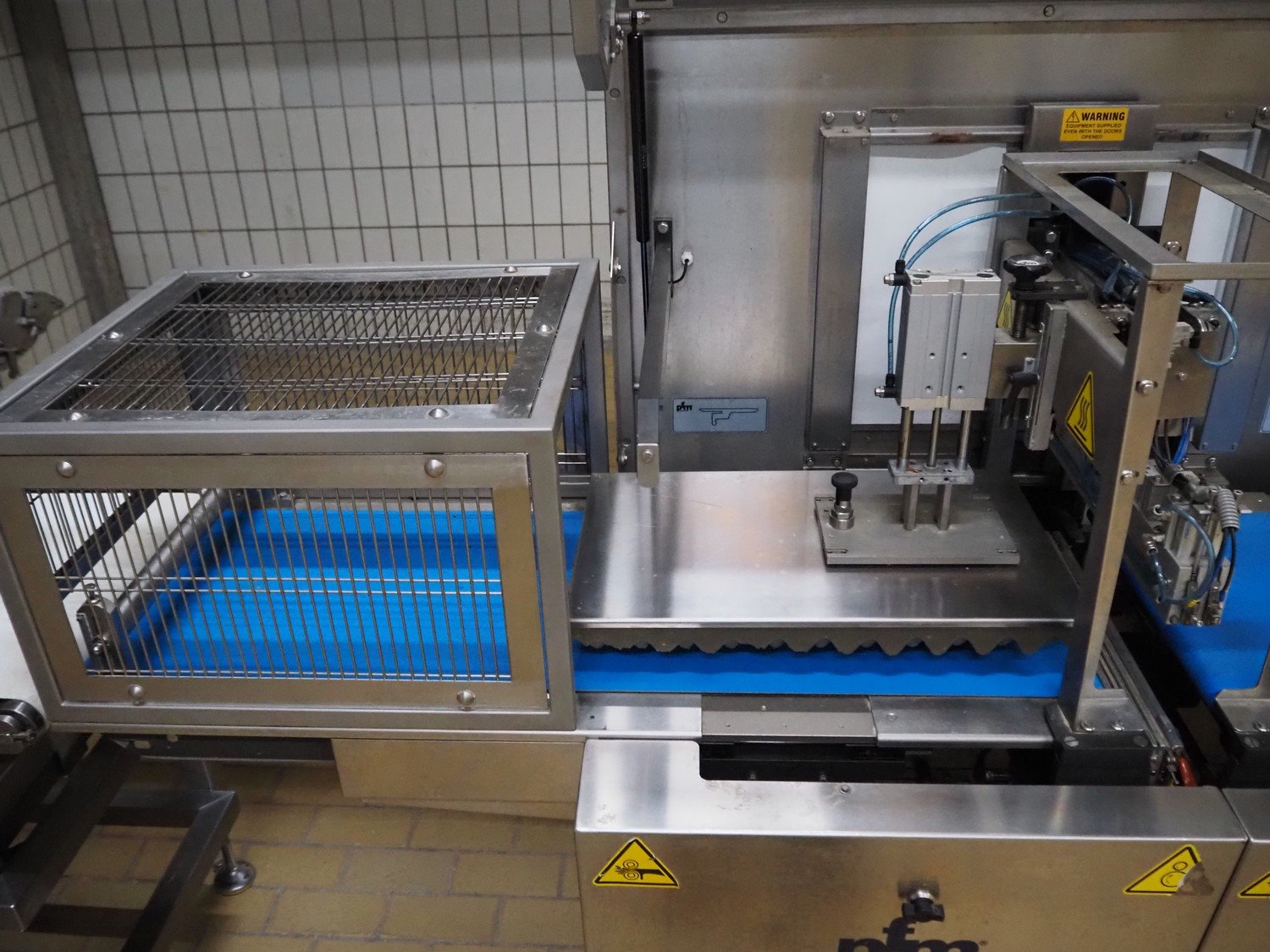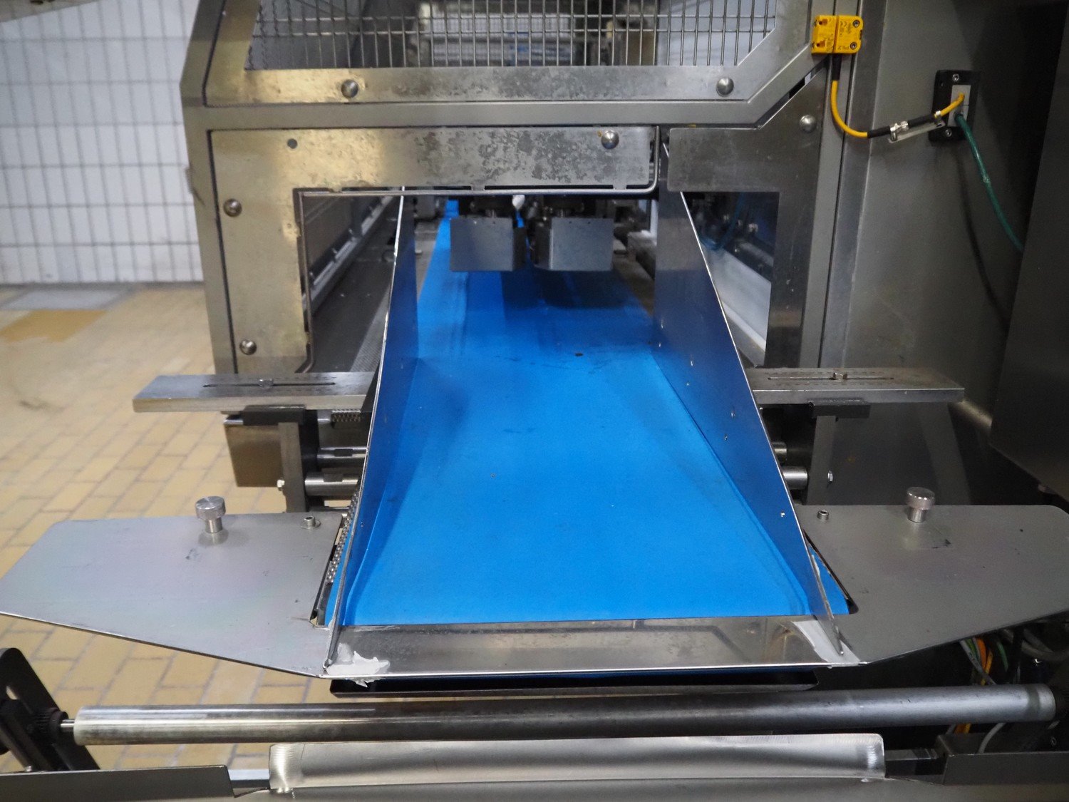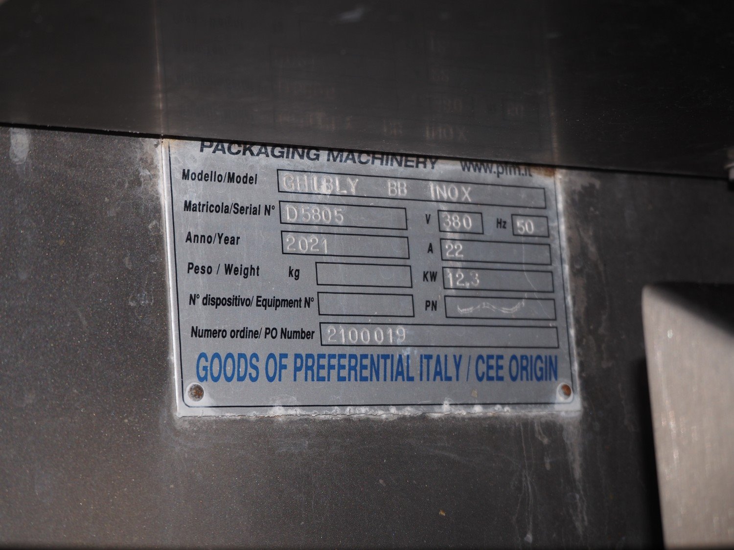 PFM flowpacker, model: GHIBLY BB INOX, serial number: D5805, year of construction: 2021, 380 V, 50 Hz, 22 A, 12.3 kW, dimensions: 1500 mm x 1400 mm x 900 mm, plastic belt, belt width: 380 mm, seal length: 450 mm, total dimensions: 3200 mm x 1600 mm x 1900 mm, two film unwinding devices, dimensions: 1500 mm x 1400 mm x 900 mm and 2100 mm x 1450 mm x 1000 mm.