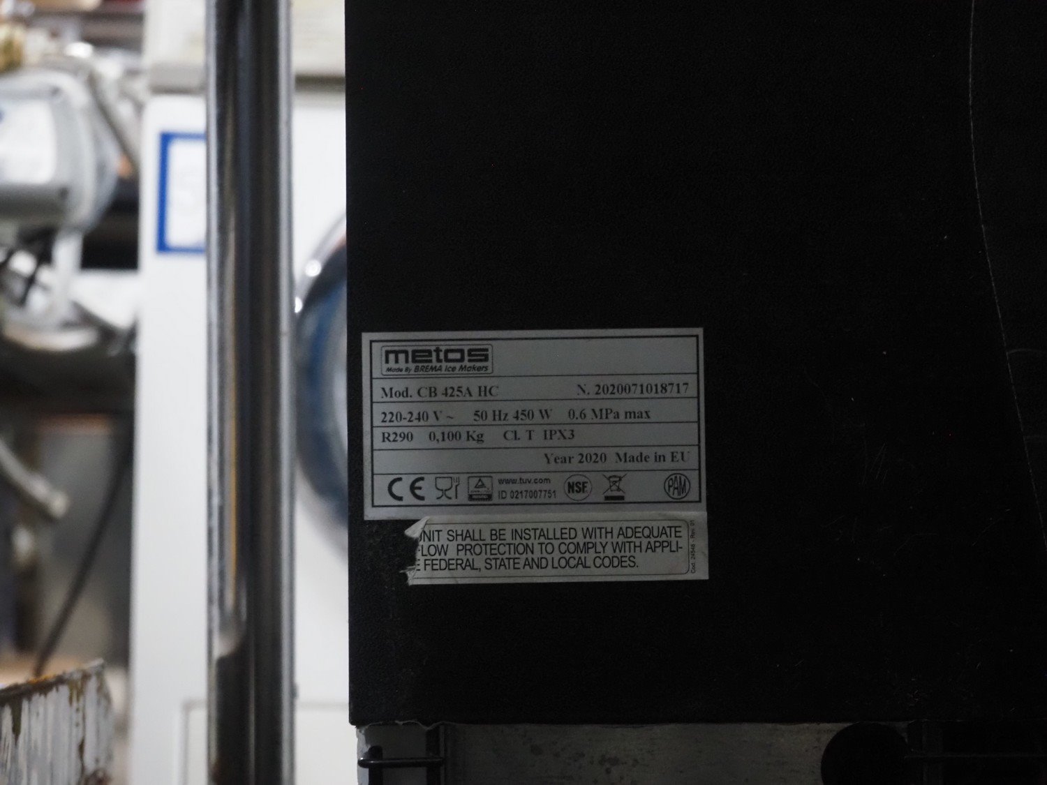 Metos ice machine, model: CB 425A HC, serial number: 2020071018717, year of construction: 2020, 220-240 V, 50 Hz, 450 W, refrigerant: R290/0.100 kg, inside dimensions: 460 mm x 450 mm x 460 mm, total dimensions: 500 mm x 580 mm x 860 mm.