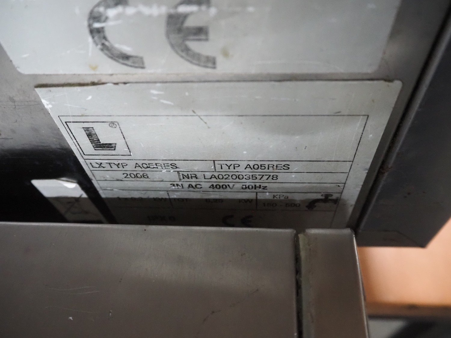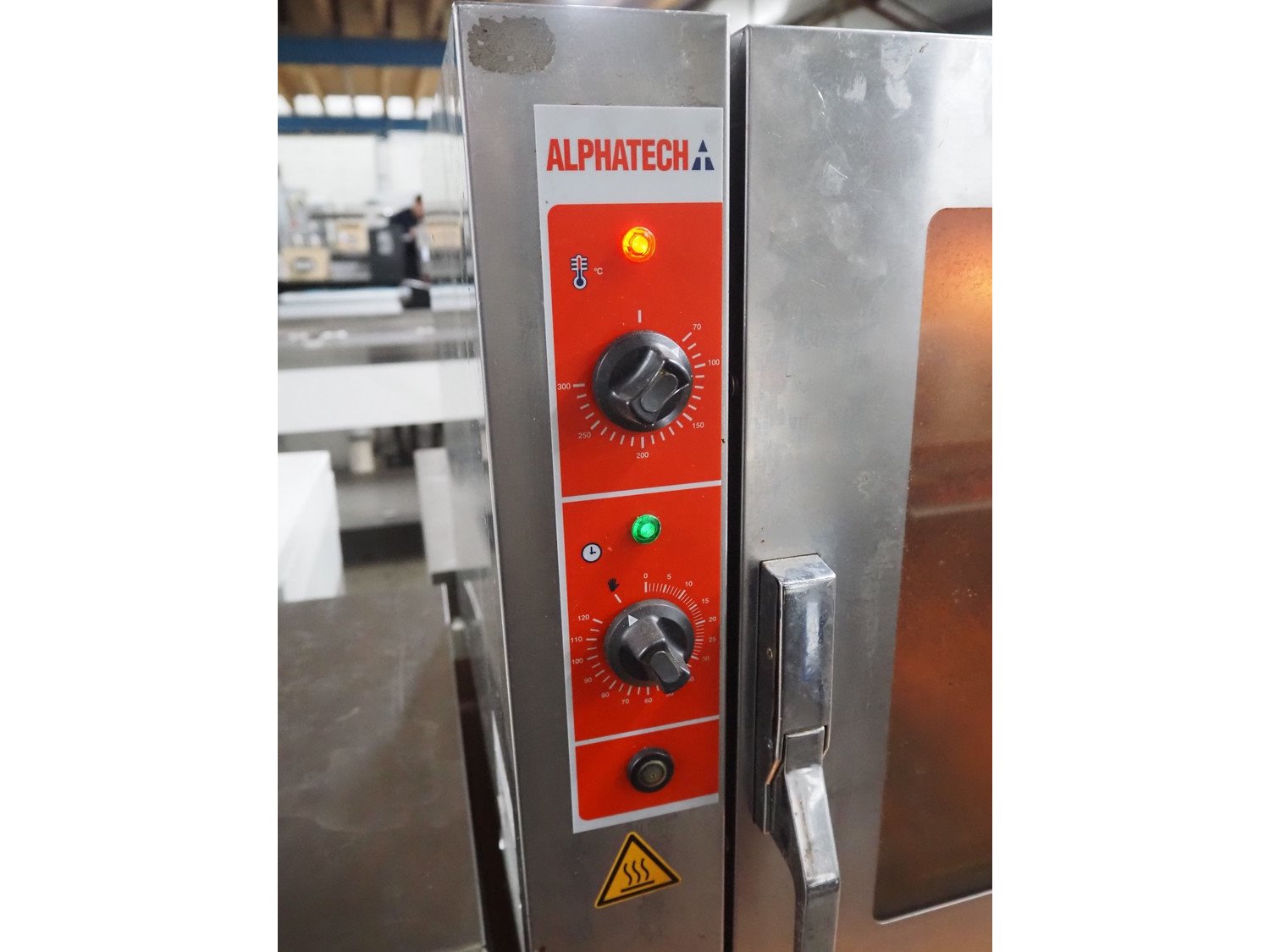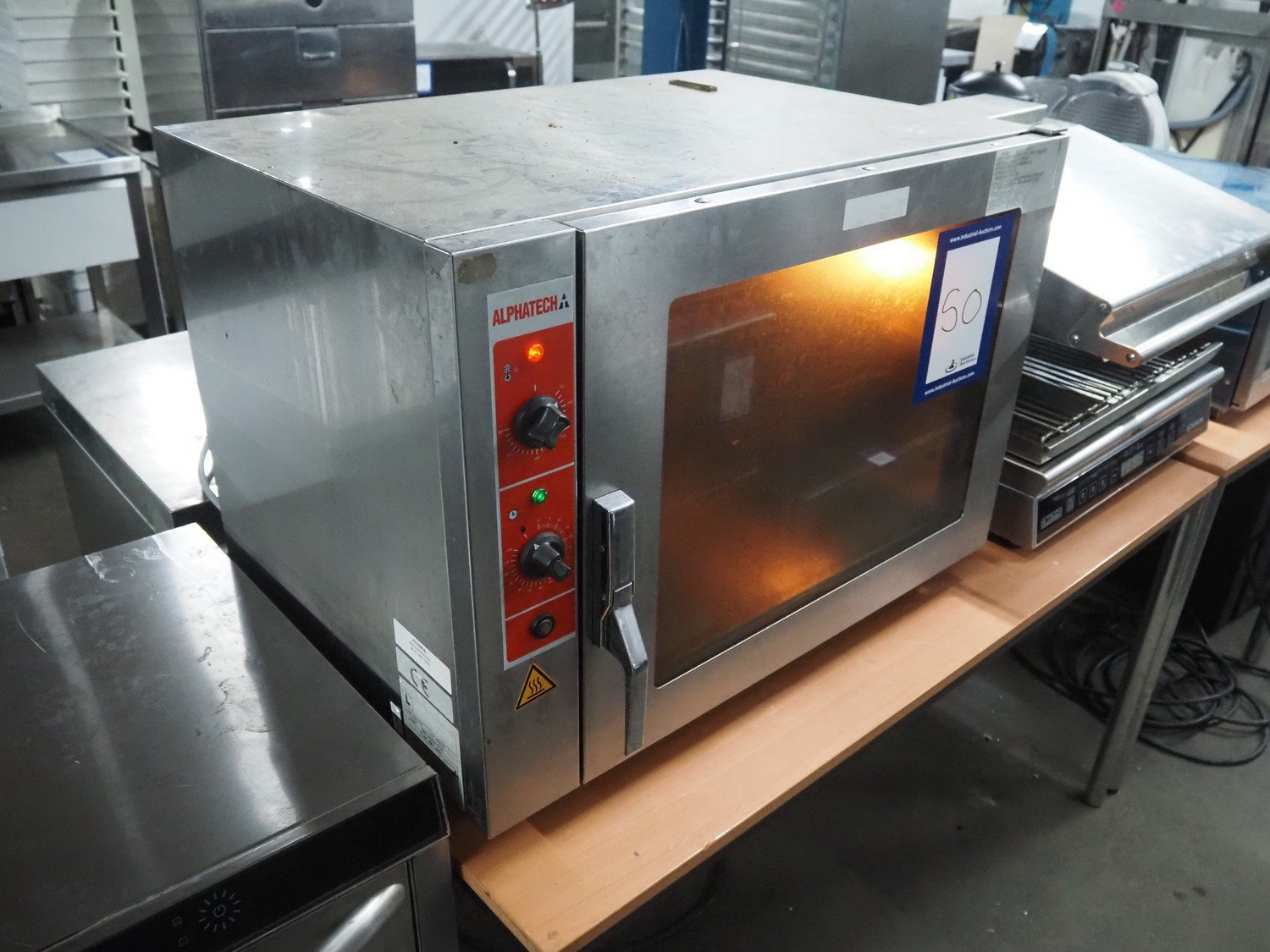 Alphatech combi steamer, type: A05RES, number: LA020035778, year of construction: 2006, 400 V, 3 Ph, 50 Hz, 6.25 kW, 6 floors, floor dimensions: (6x) 500 m x 360 mm, total dimensions: 800 mm x 600 mm x 600 mm.