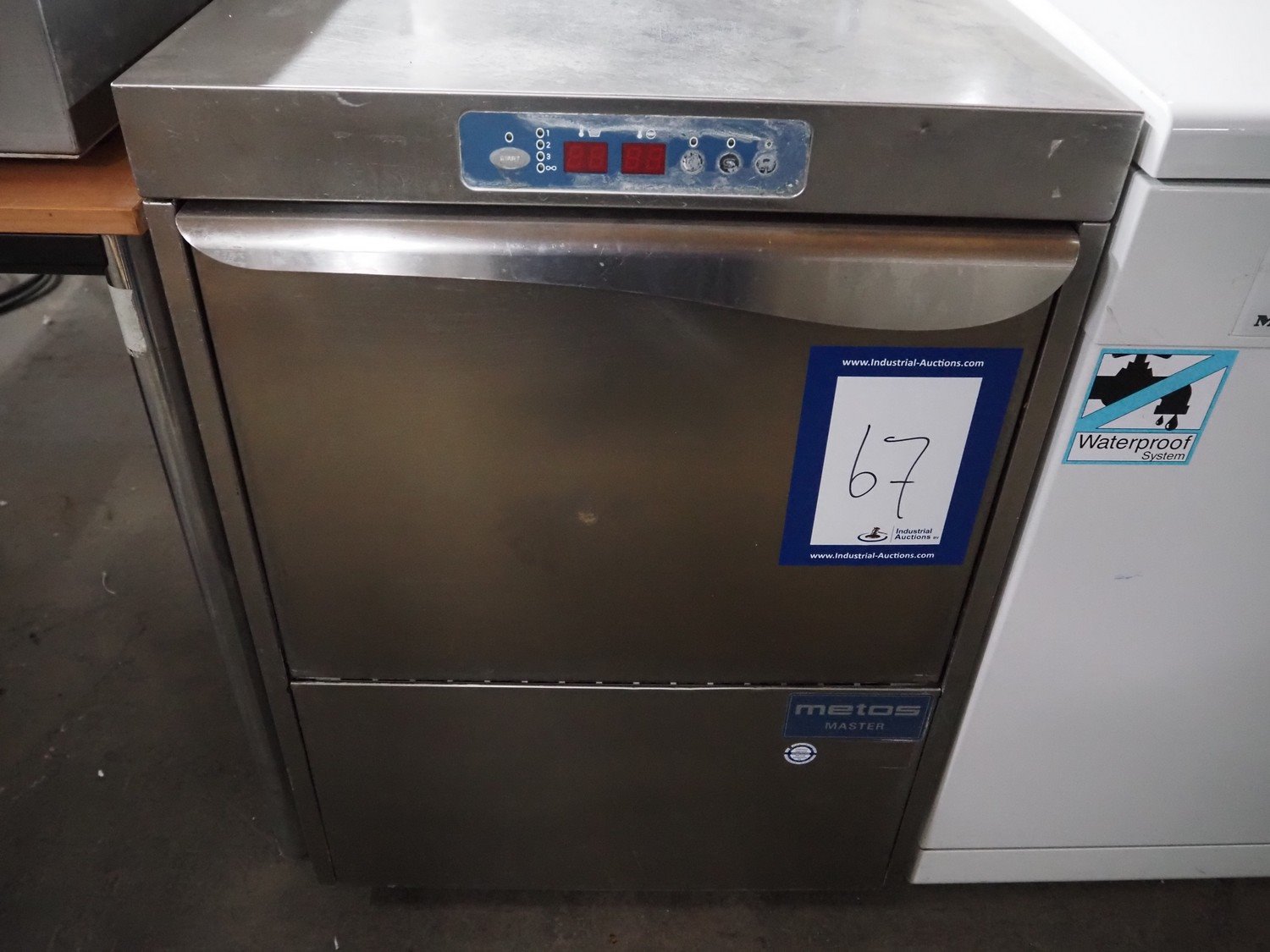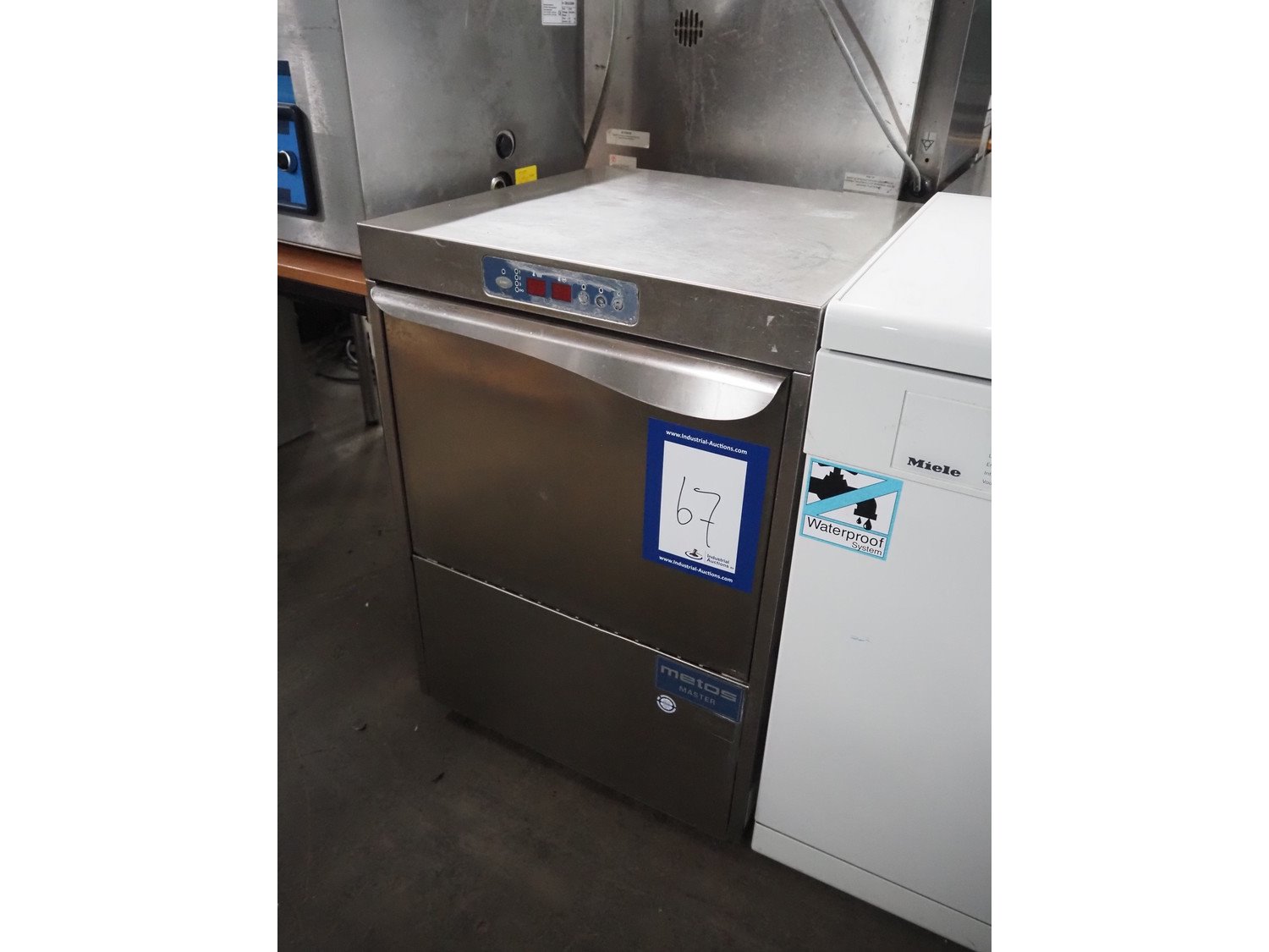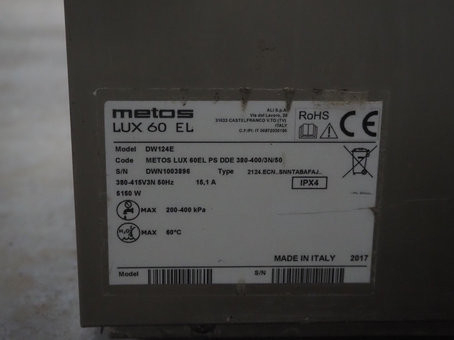 Metos dishwasher, type: DW124E, serial number: DWN1003896, 380-415 V, 3 Ph, 50 Hz, 15.1 A, 5150 W, dimensions: 640 mm x 600 mm x 860 mm.