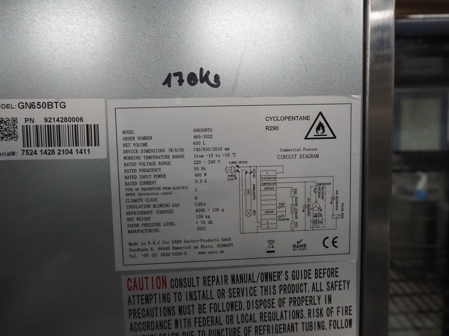 Refrigerator, model: GN650BTG, year of construction: 2021, 220-240 V, 50 Hz, 3.3 A, 495 W, refrigerant: R290/130 g, volume: 650 liter, weight: 139 kg, 3 floors, floor dimensions: (3x) 640 mm x 530 mm, total dimensions: 820 mm x 750 mm x 1880 mm.