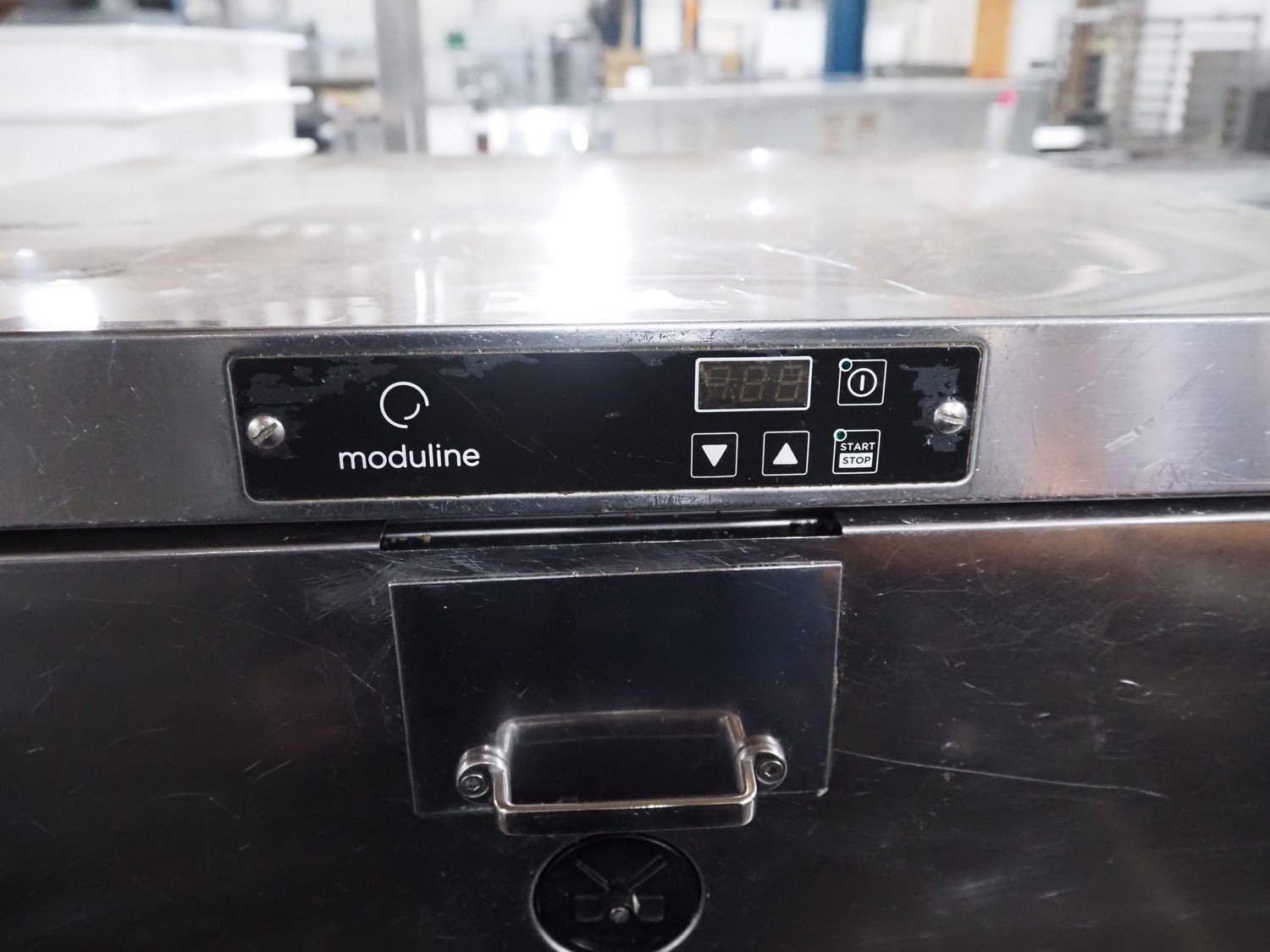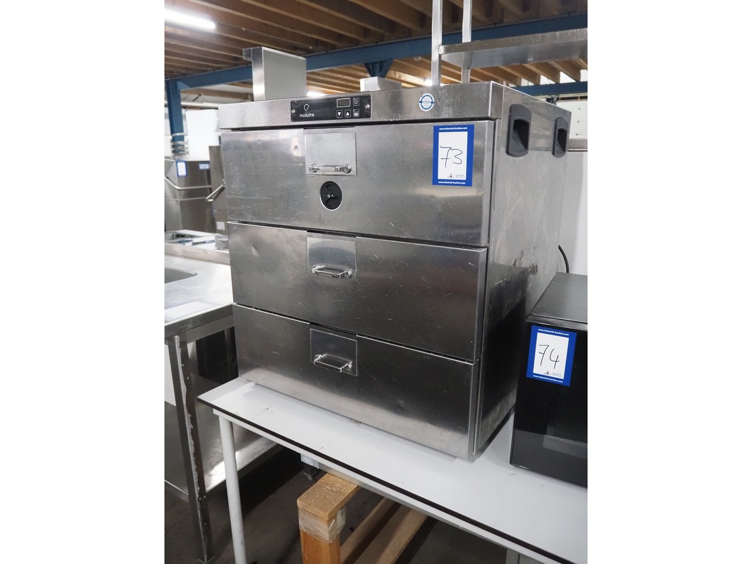 Moduline srl heating cabinet, type: HSW013E, number: 1700073002C, year of construction: 2017, 230 V, 50 Hz, 8 A, 1 kW, 3 drawers, drawer dimensions: (3x) 500 mm x 290 mm x 100 mm, total dimensions: 660 mm x 600 mm x 720 mm.