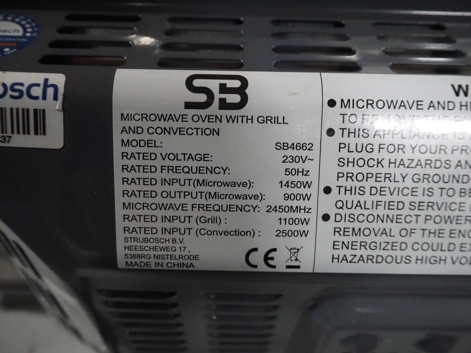 SB microwave, model: SB4662, 230 V, 50 Hz, 1450 W, inside dimensions: 330 mm x 330 mm x 230 mm, total dimensions: 520 mm x 520 mm x 320 mm.