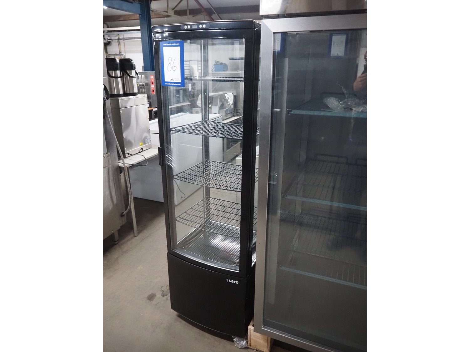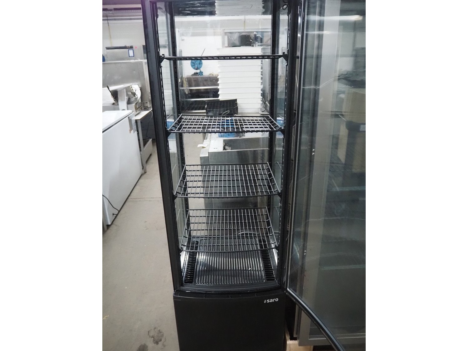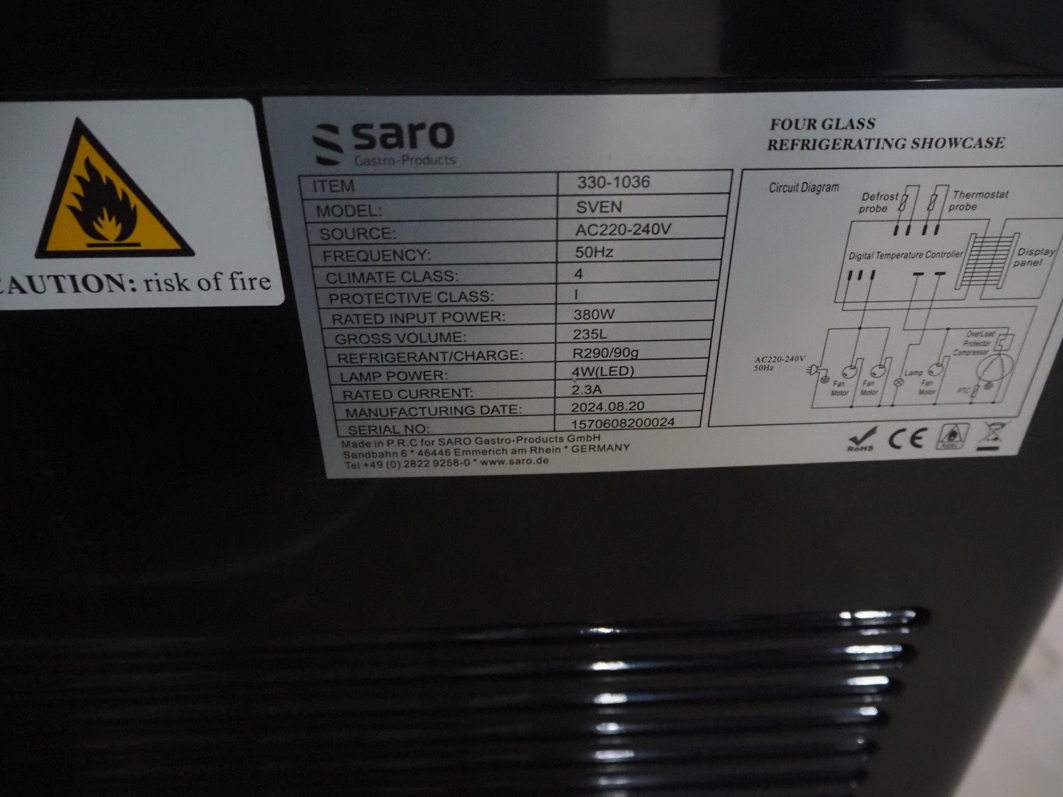 Saro Gastro-Products GmbH refrigerated showcase, model: SVEN, serial number: 1570608200024, year of construction: 20.08.2024, 220-240 V, 50 Hz, 2.3 A, 380 W, volume: 235 liter, refrigerant: R290/90 g, 4 floors, floor dimensions: (4x) 420 mm x 380 mm, total dimensions: 460 mm x 520 mm x 1700 mm.