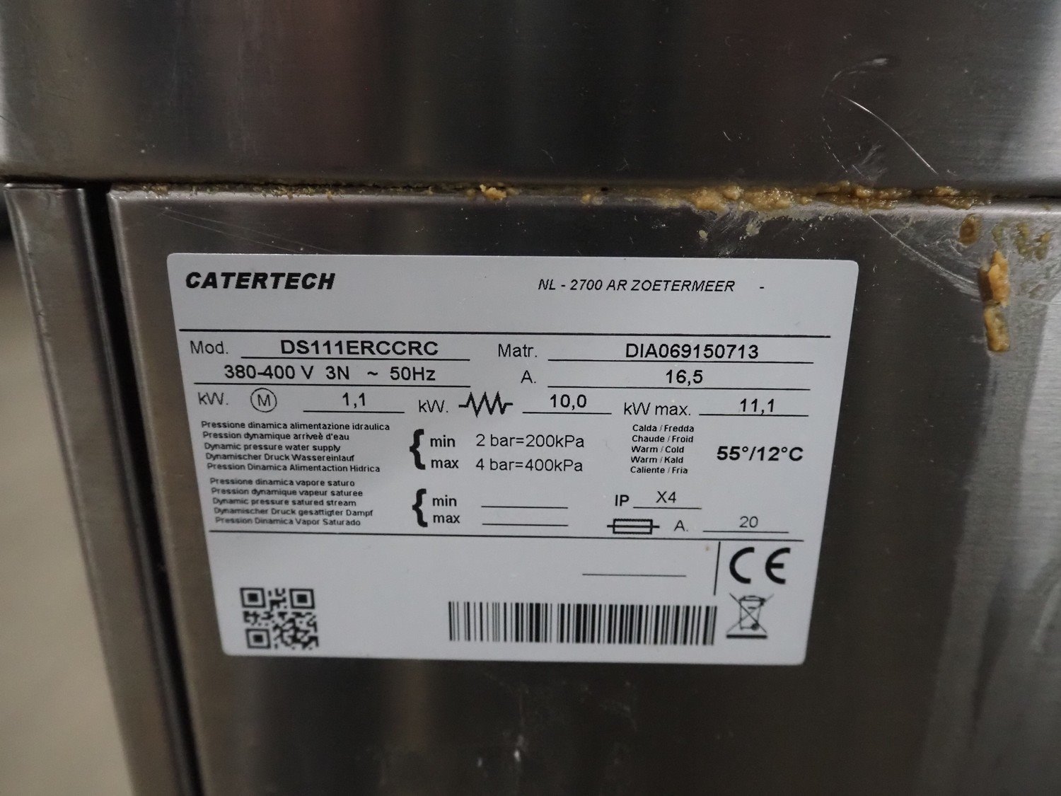 Catertech dishwasher, model: DS111ERCCRC, serial number: DIA69150713, 380-400 V, 3 Ph, 50 Hz, 16.5 A, 11.1 kW, dimensions: 820 mm x 730 mm x 2280 mm.