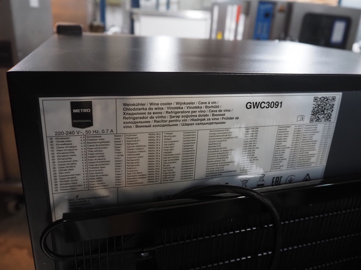 Metro wine cooler, model: GWC3091, 220-240 V, 50 Hz, 0.7 A, 5 floors, floor dimensions: (5x) 460 mm x 430 mm, total dimensions: 540 mm x 530 mm x 1210 mm.