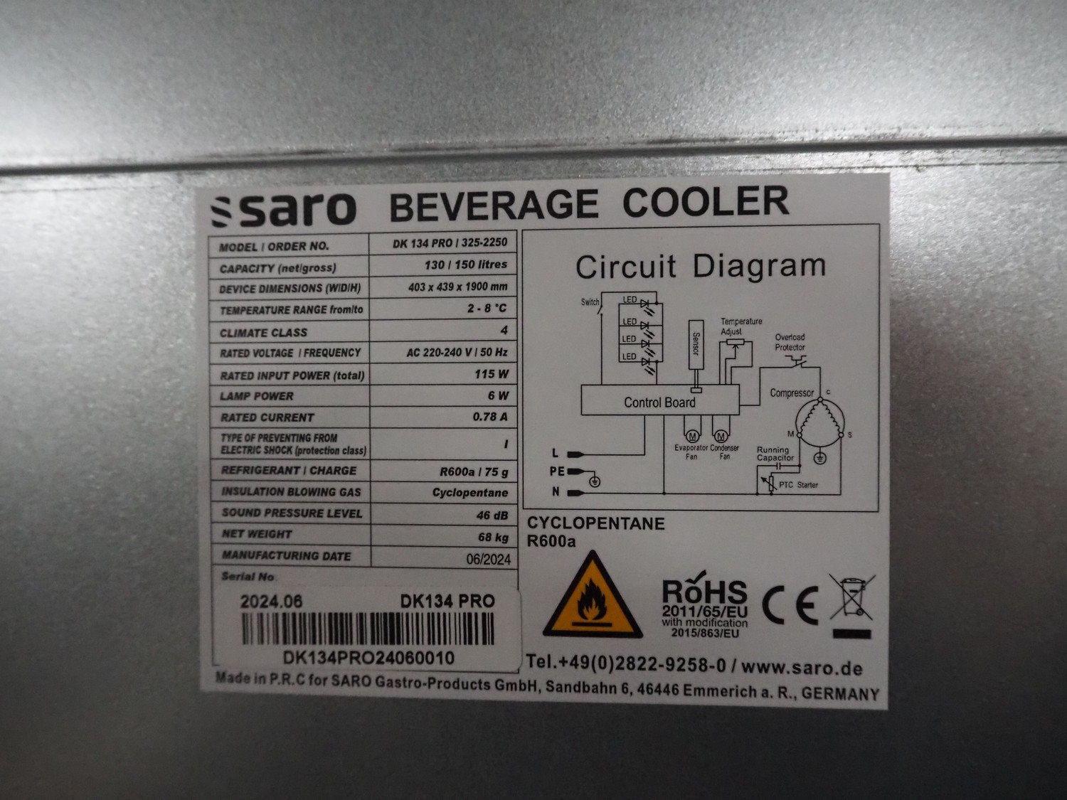 Saro Gastro-Products GmbH refrigerator, model: DK 134 PRO ROUND 325-2255, year of construction: 06/2024, 220-240 V, 50 Hz, 0.78 A, 115 W, refrigerant: R600A/0.75 kg, weight: 70 kg, 6 floors, floor dimensions: (6x) 280 mm x 300 mm, total dimensions: 440 mm x 400 mm x 1790 mm.