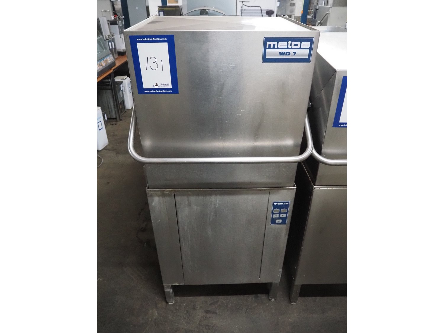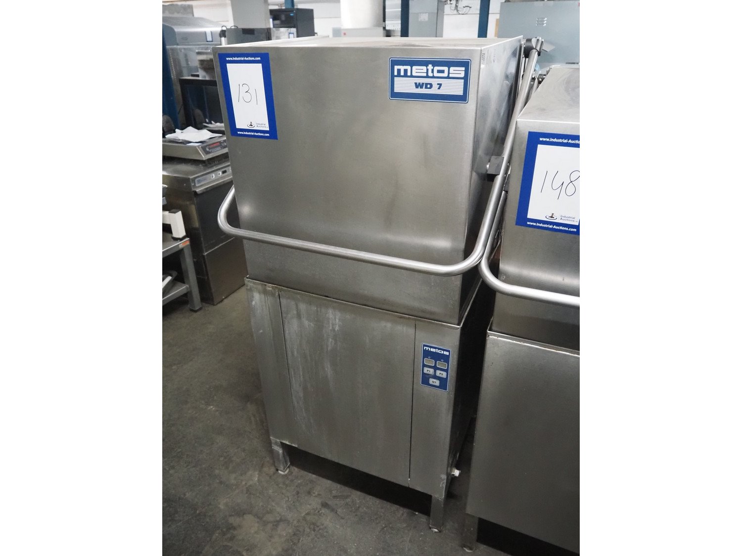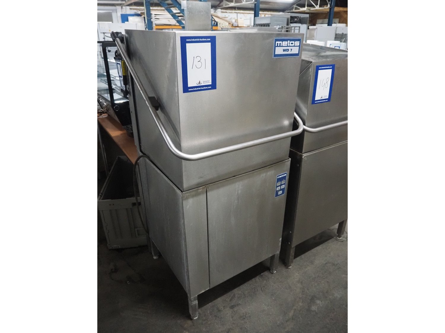 Metos dishwasher, type: WD-7E, number: 064607, year of construction: 2006, 400 V, 3 Ph, 50 Hz, 16 A, 10.1 kW, dimensions: 740 mm x 700 mm x 1500 mm. Including 2 plastic baskets.