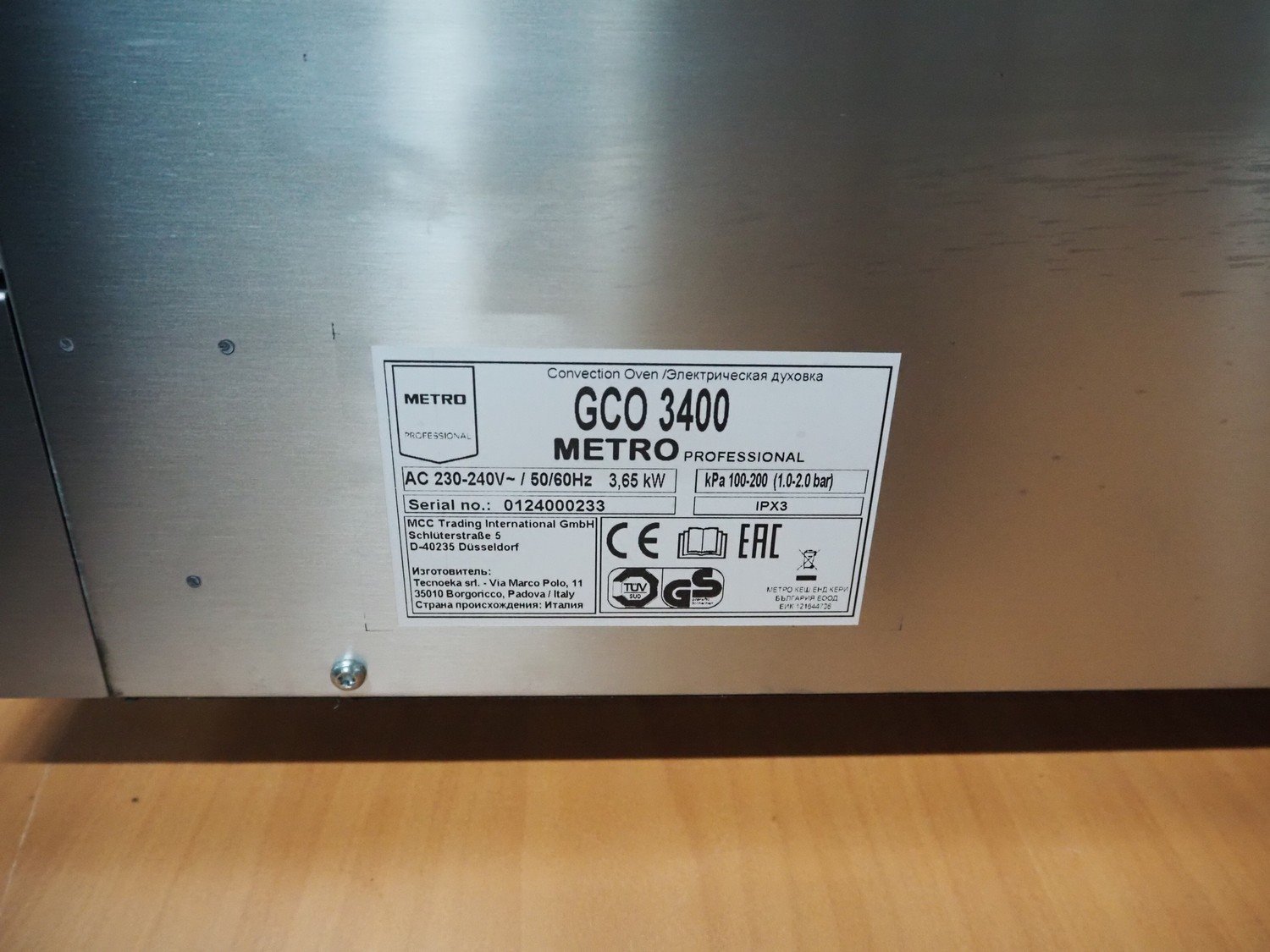 Metro hot air oven, model: GCO 3400, serial number: 0124000233, 230-240 V, 50/60 Hz, 3.65 kW, 4 floors, floor dimensions: (4x) 600 mm x 400 mm, total dimensions: 790 mm x 710 mm x 640 mm.