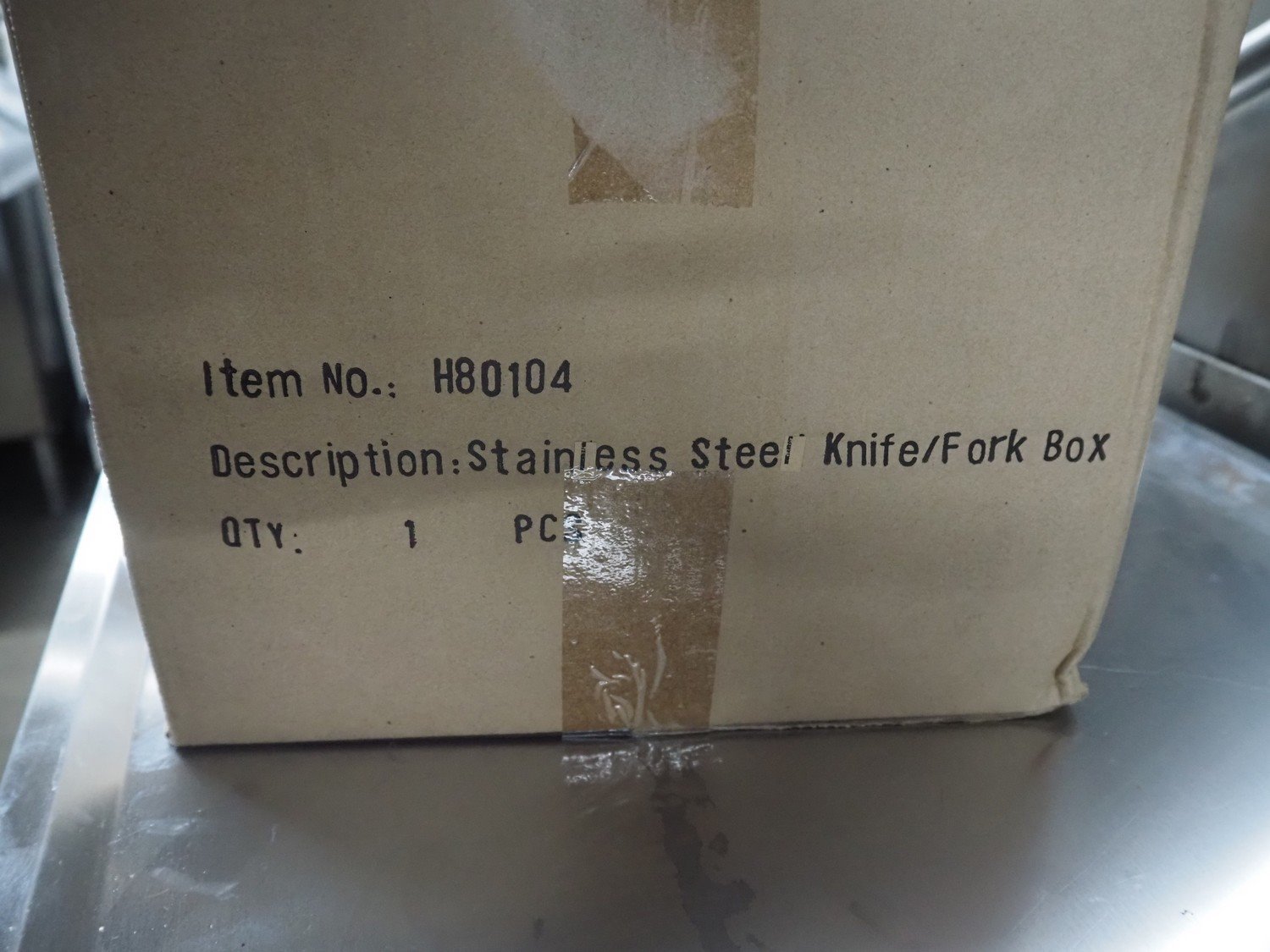 S/s knife/fork box, 4 holes, dimensions holes: (4x) Ø 100 mm x 100 mm, total dimensions: 330 mm x 280 mm x 200 mm.