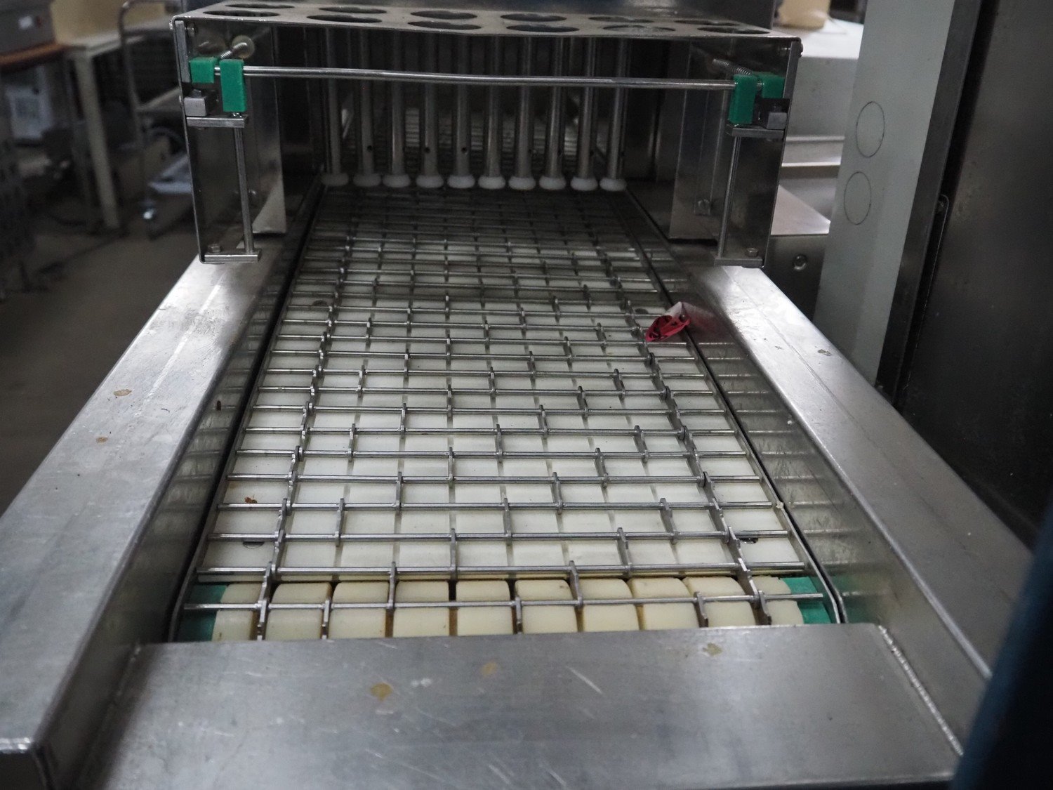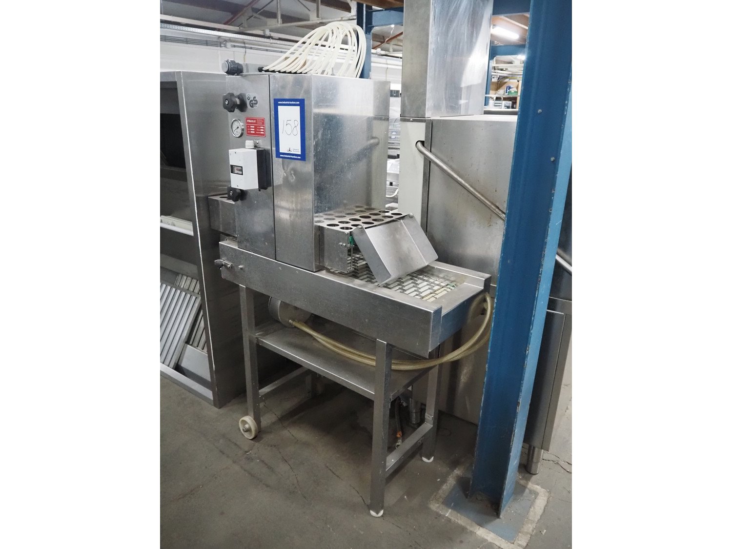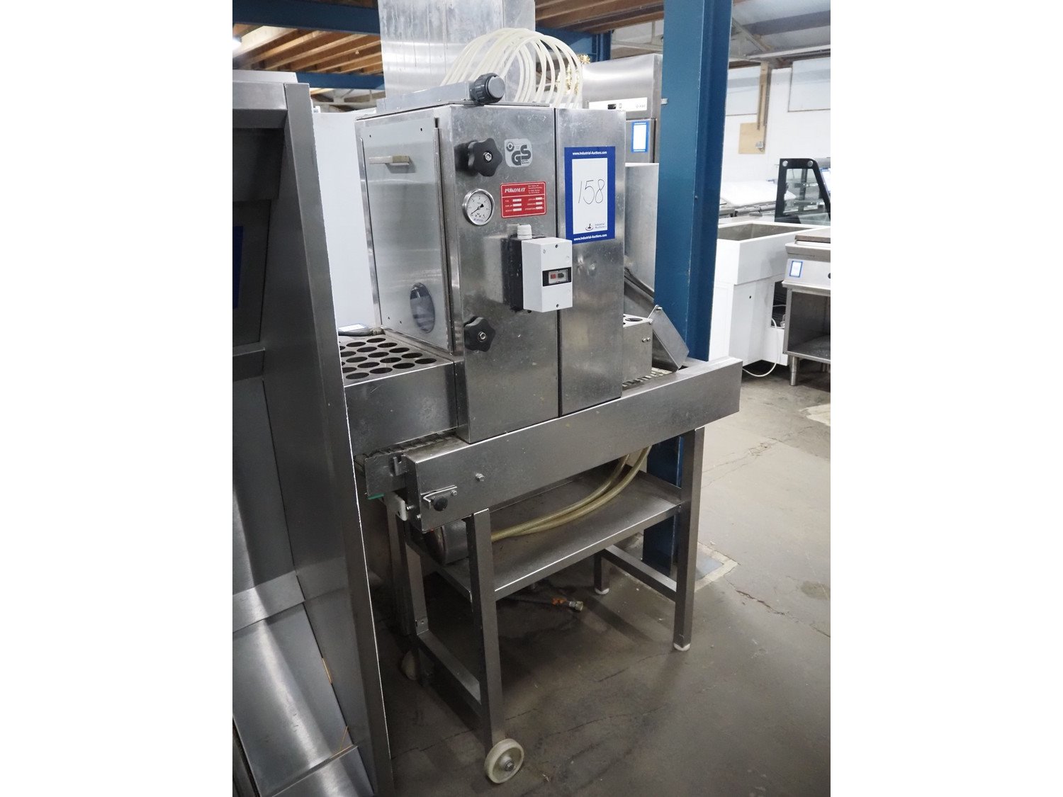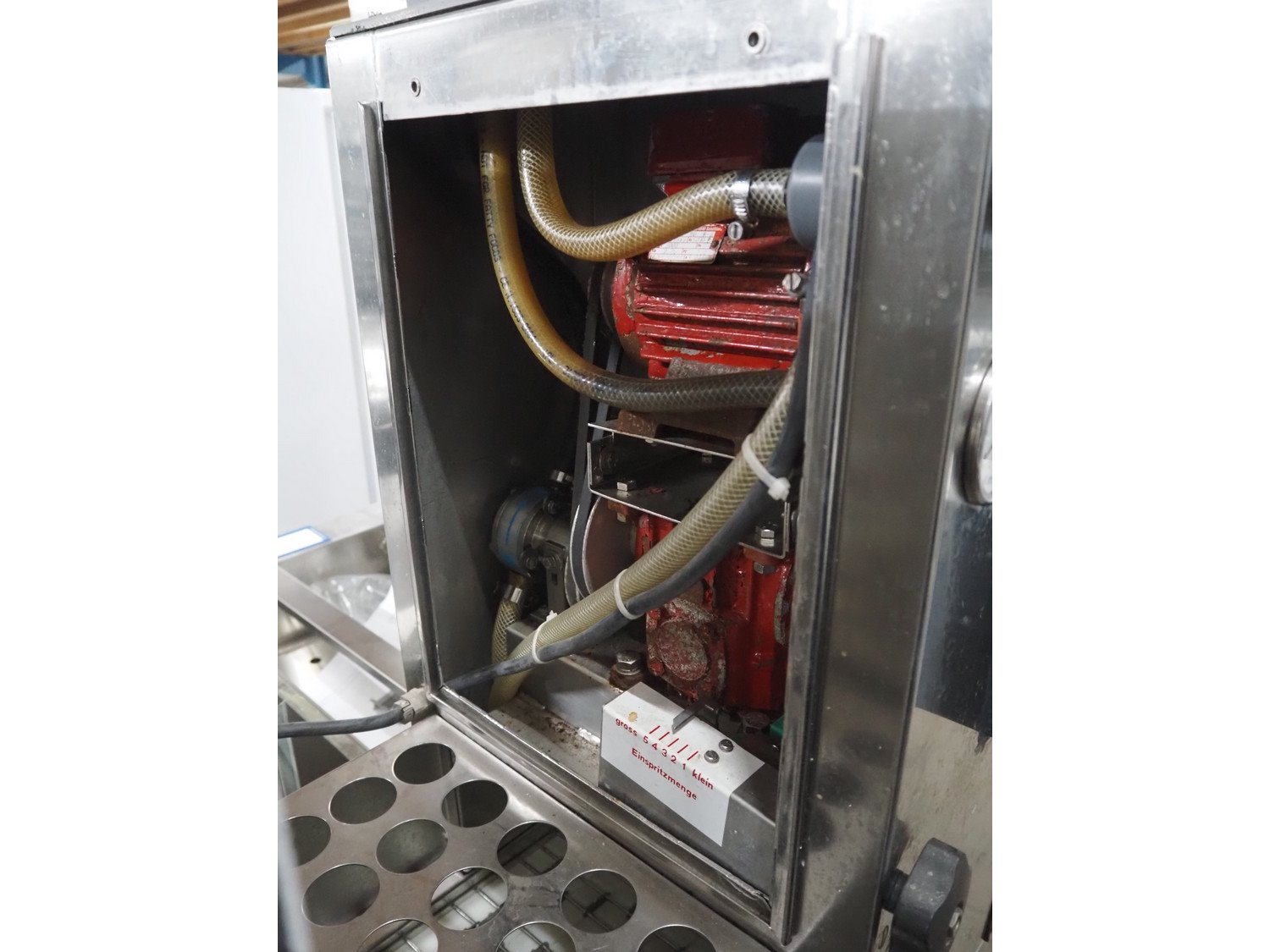 Pökomat mobile injector, type: R10/300, fabrication number: 582.1, 380 V, 1.8 A, 0.75 kW, weight: 126 kg, 10 needles, s/s belt, belt width: 300 mm, clearance: 300 mm x 140 mm, total dimensions: 1170 mm x 430 mm x 1750 mm.