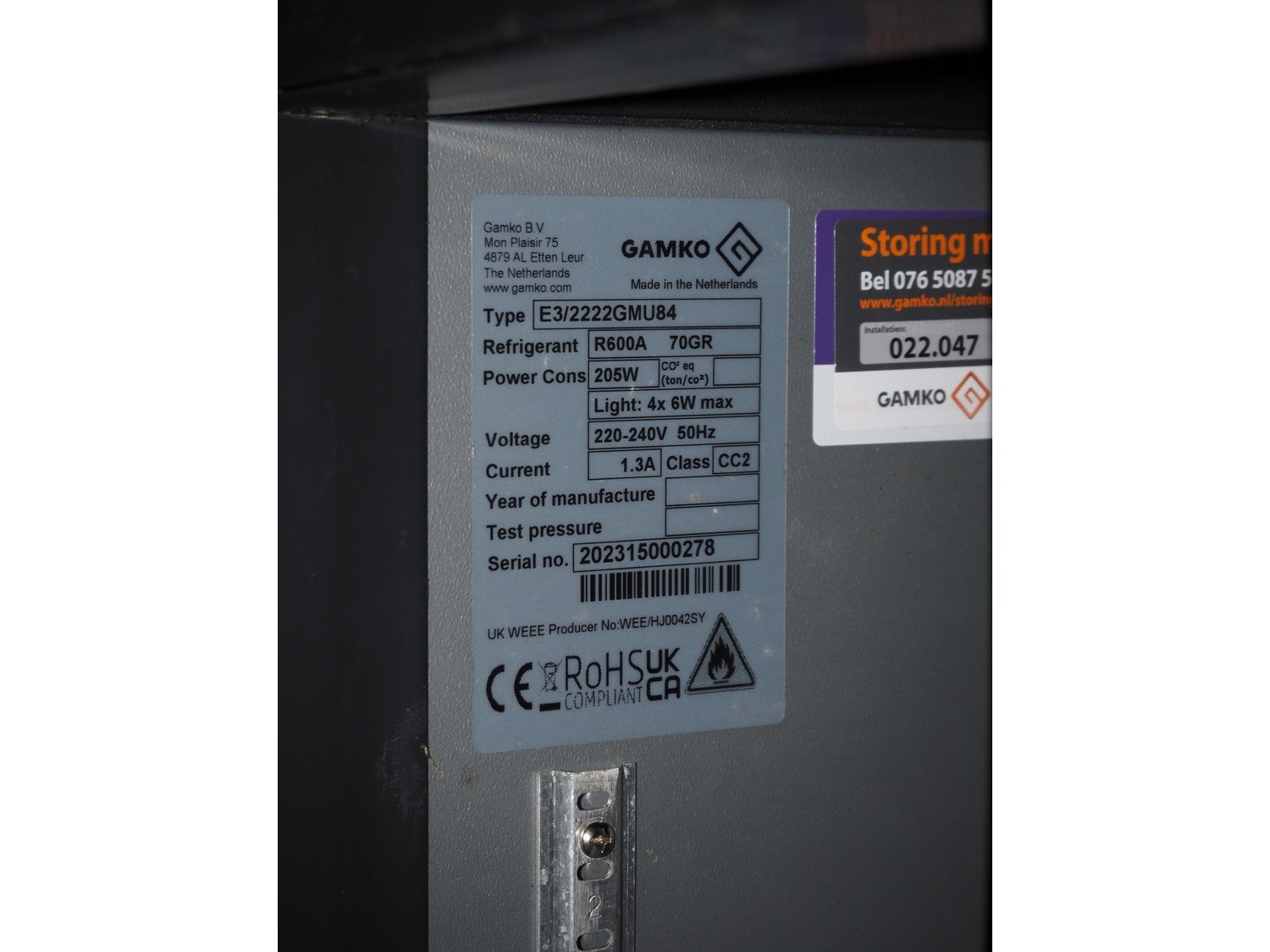 Gamko bottle cooler, type: E3/2222GMU84, serial number: 202315000278, 220-240 V, 50 Hz, 205 W, 1.3 A, refrigerant: R600A/0.070 kg, dimensions: 2540 mm x 510 mm x 870 mm.
