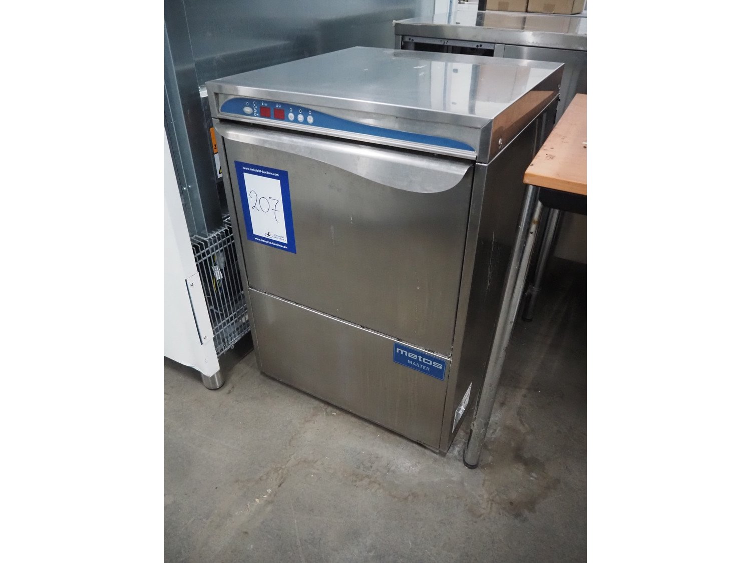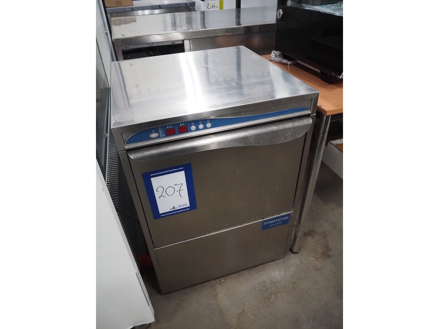 Metos dishwasher, model: METOS LUX 60 EL D PS DDE, serial number: DWD1020535, year of construction: 2010, 220-240 V, 50 Hz, 15.5 A, inside dimensions: 500 mm x 500 mm, total dimensions: 600 mm x 650 mm x 840 mm.