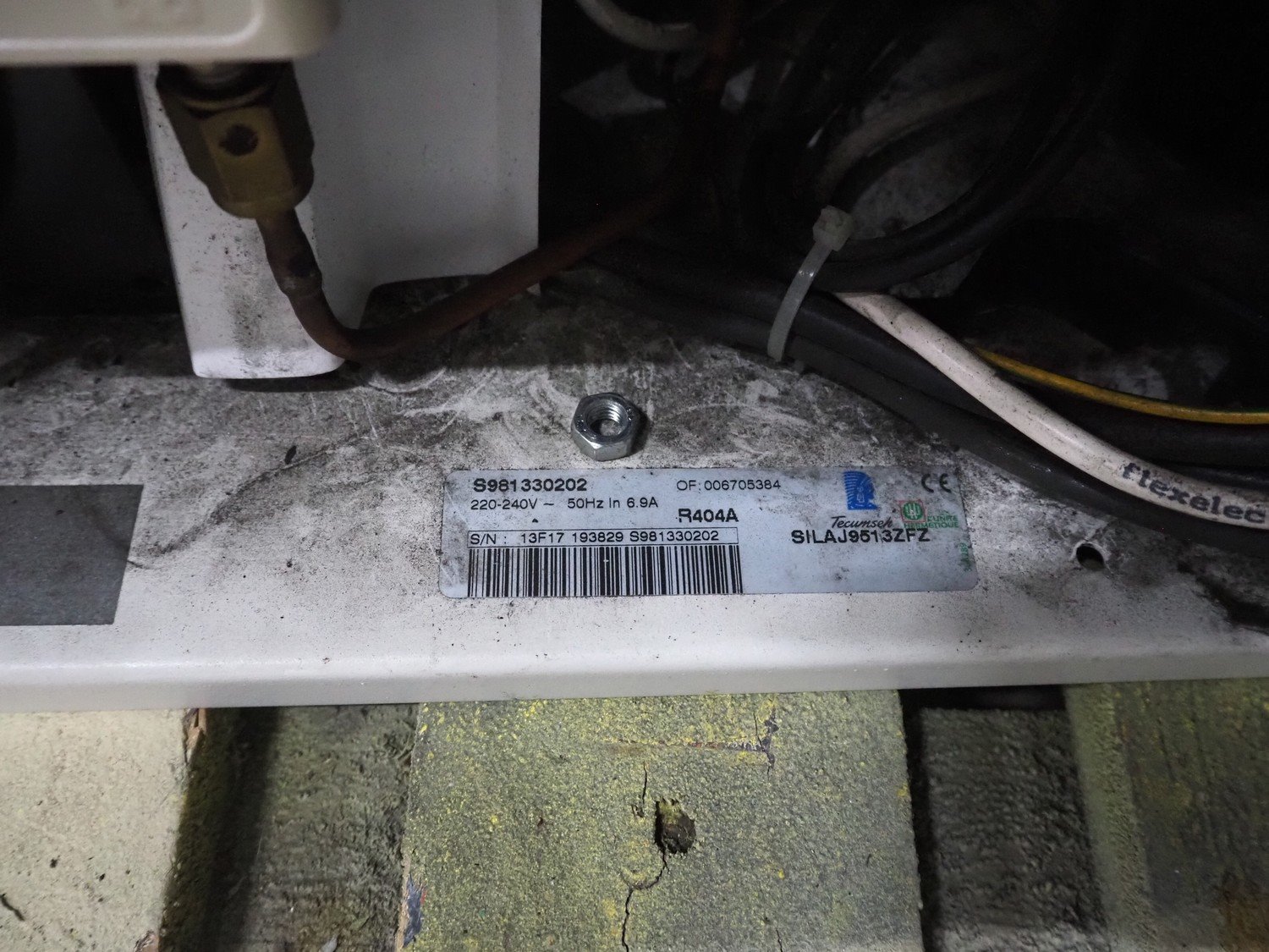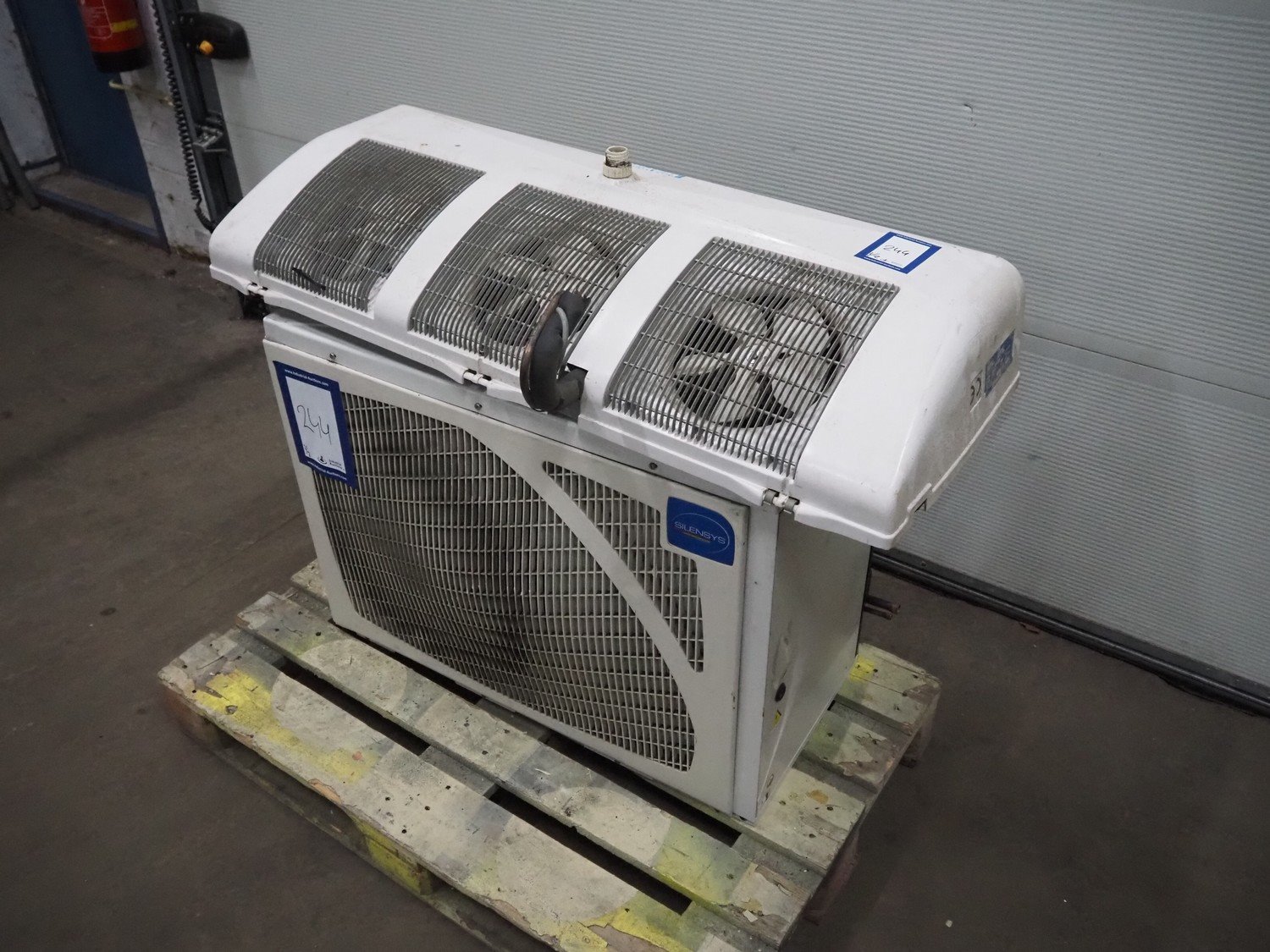 Silensys condensor with Tecumseh cooling compressor and Friga-Bohn evaporator, type cooling compressor: S981330202, 220-240 V, 50 Hz, 6.9 A, refrigerant: R404A, dimensions: 890 mm x 550 mm x 670 mm, model evaporator: MR 210, serial number: LR0022, 230 V, 1 Ph, 50-60 Hz, 3 fans, dimensions: 1150 mm x 430 mm x 180 mm.