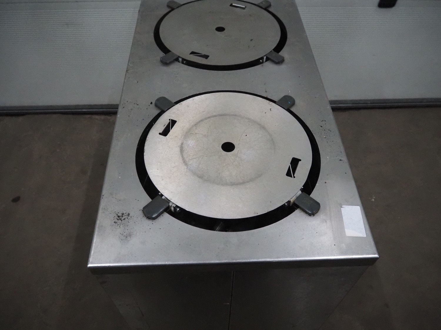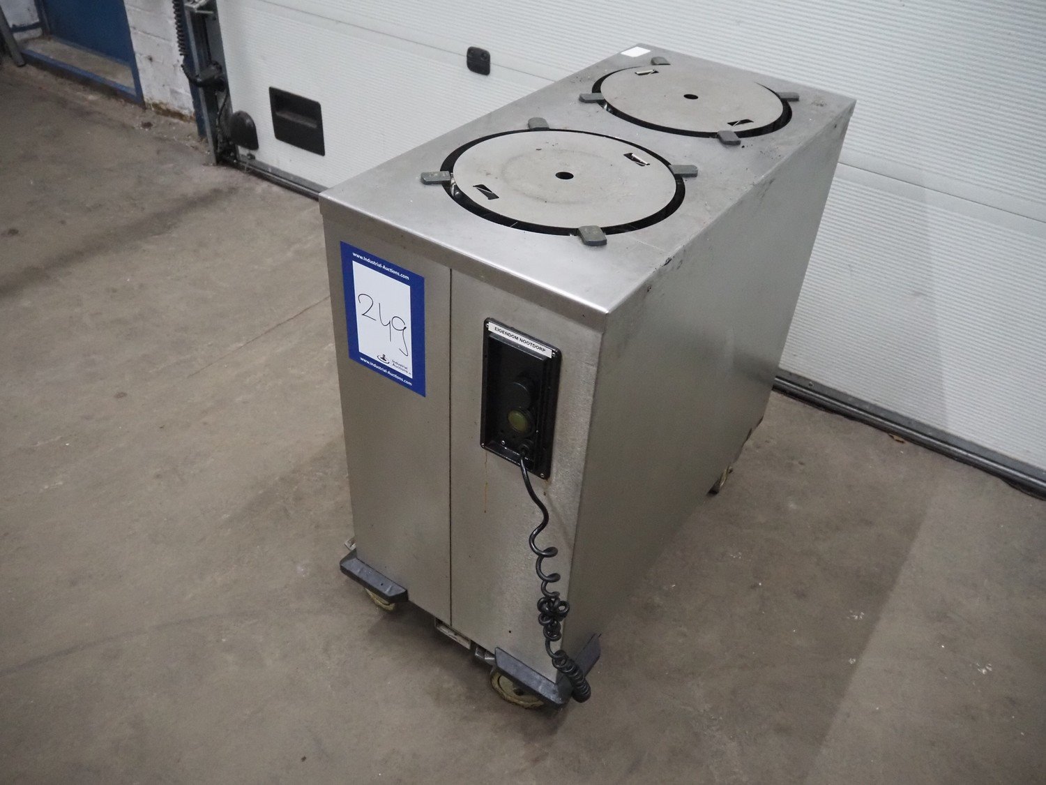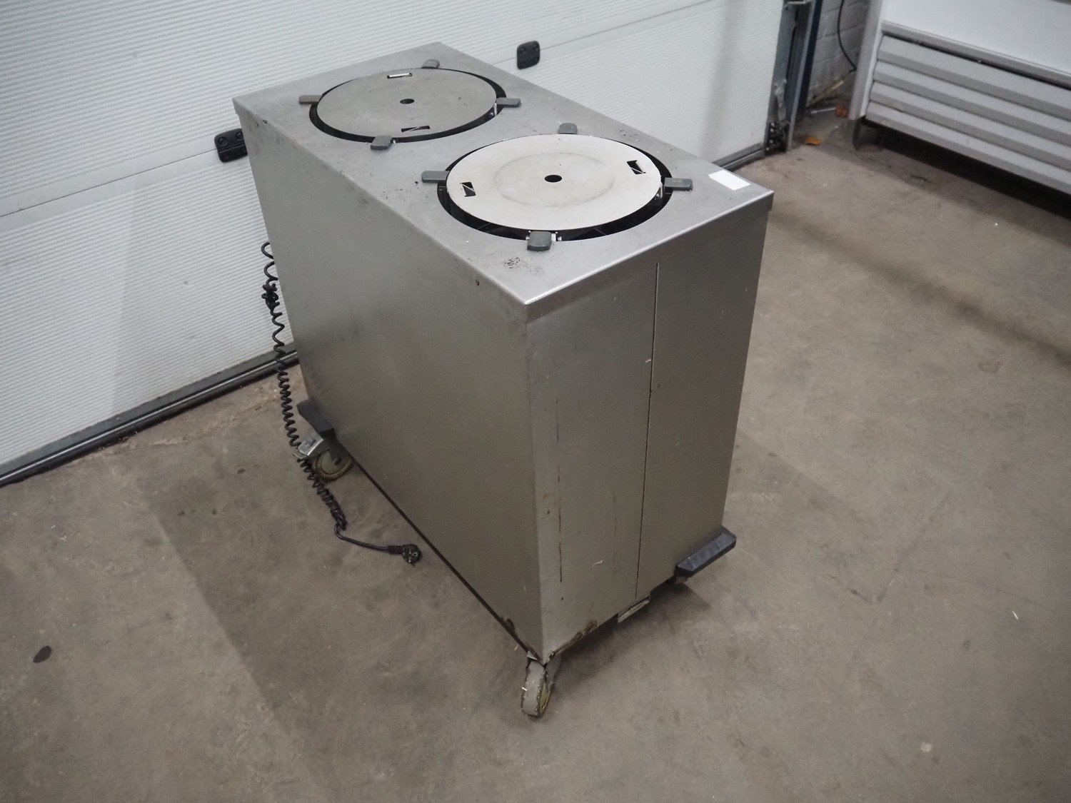 Mobile plate warmer, 2 storages, diameter storage: (2x) 330 mm, total dimensions: 920 mm x 480 mm x 900 mm.