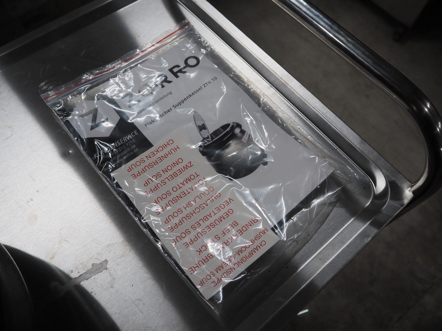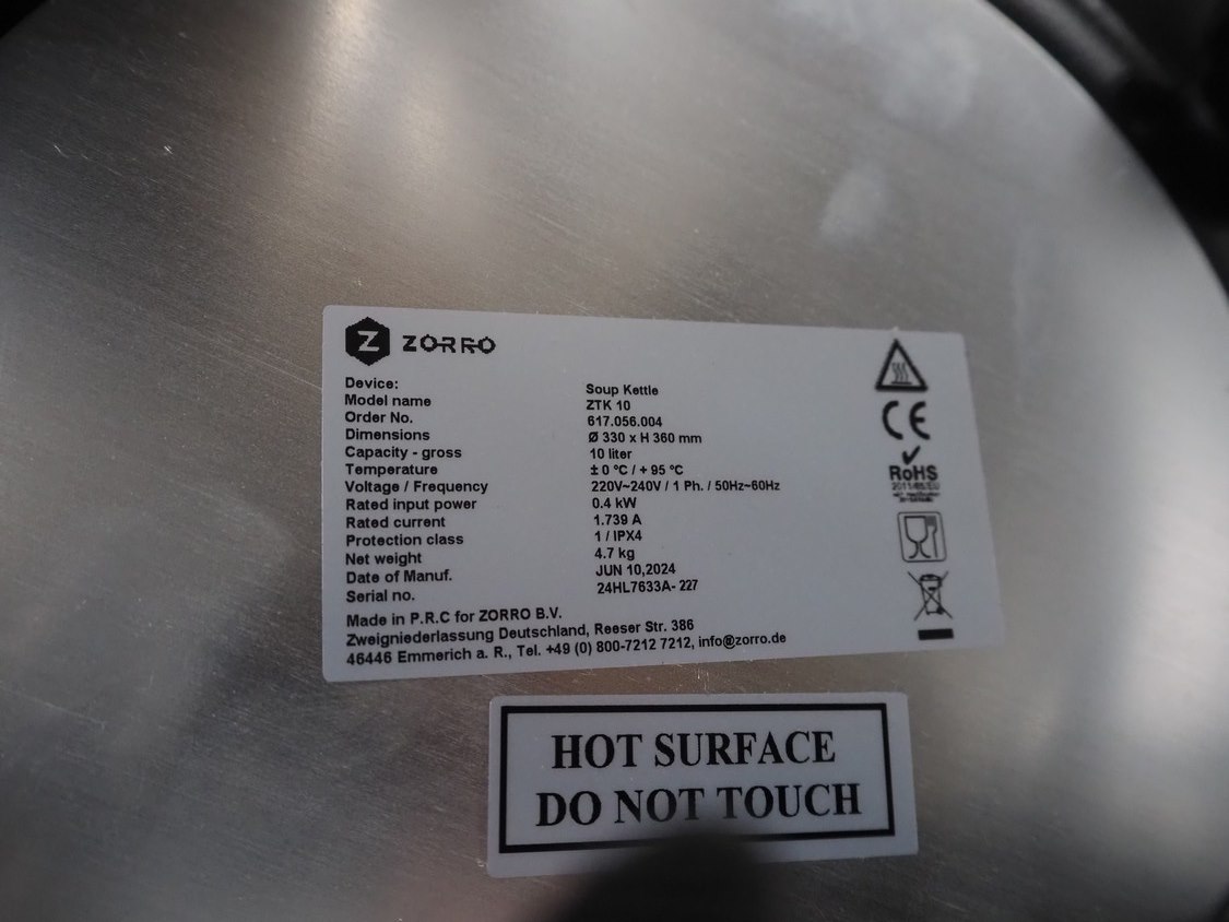 Zorro B.V. soup kettle, model: ZTK 10, serial number: 24HL7633A-227, year of construction: June 10.2024, 220-240 V, 1 Ph, 50/60 Hz, 1.739 A, 0.4 kW, capacity: 10 liter, dimensions: 300 mm x 300 mm x 350 mm.