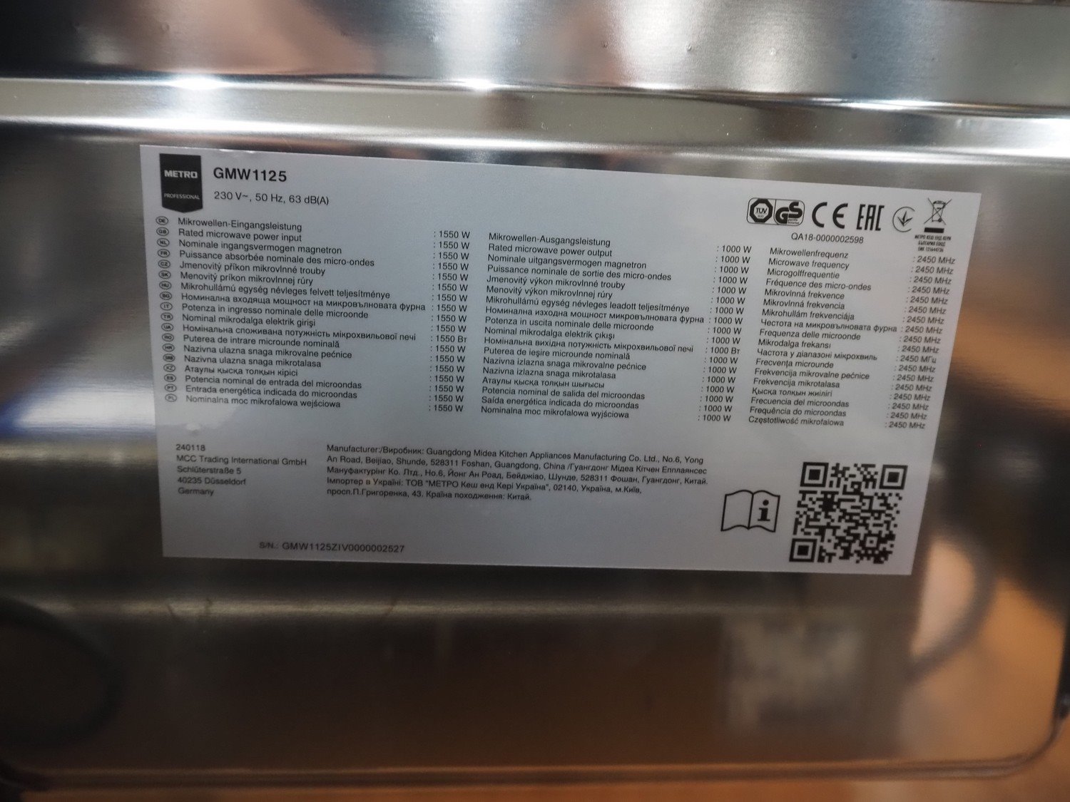 Metro microwave, model: GMW1125, serial number: GMW1125ZIV0000002527, 230 V, 50 Hz, 1550 W, inside dimensions: 325 mm x 330 mm x 205 mm, total dimensions: 510 mm x 410 mm x 310 mm.