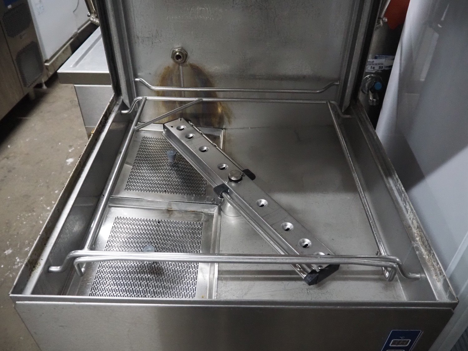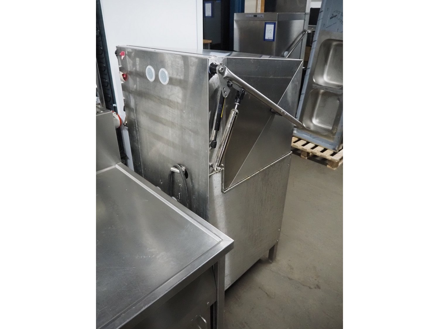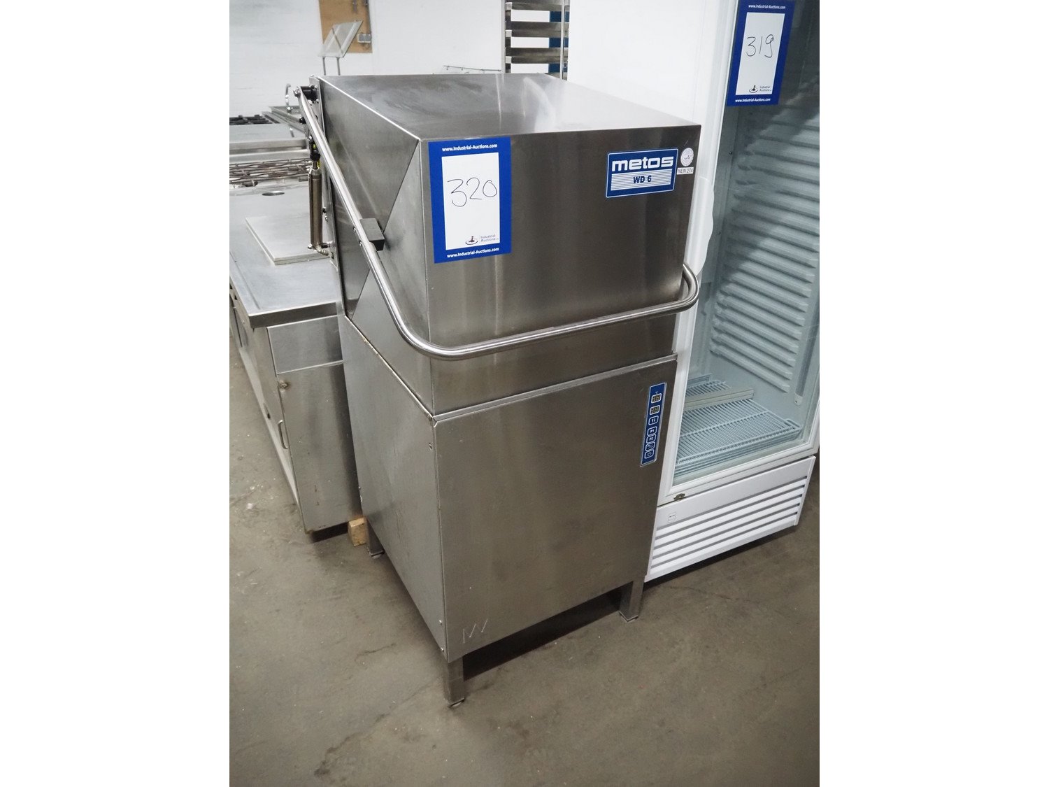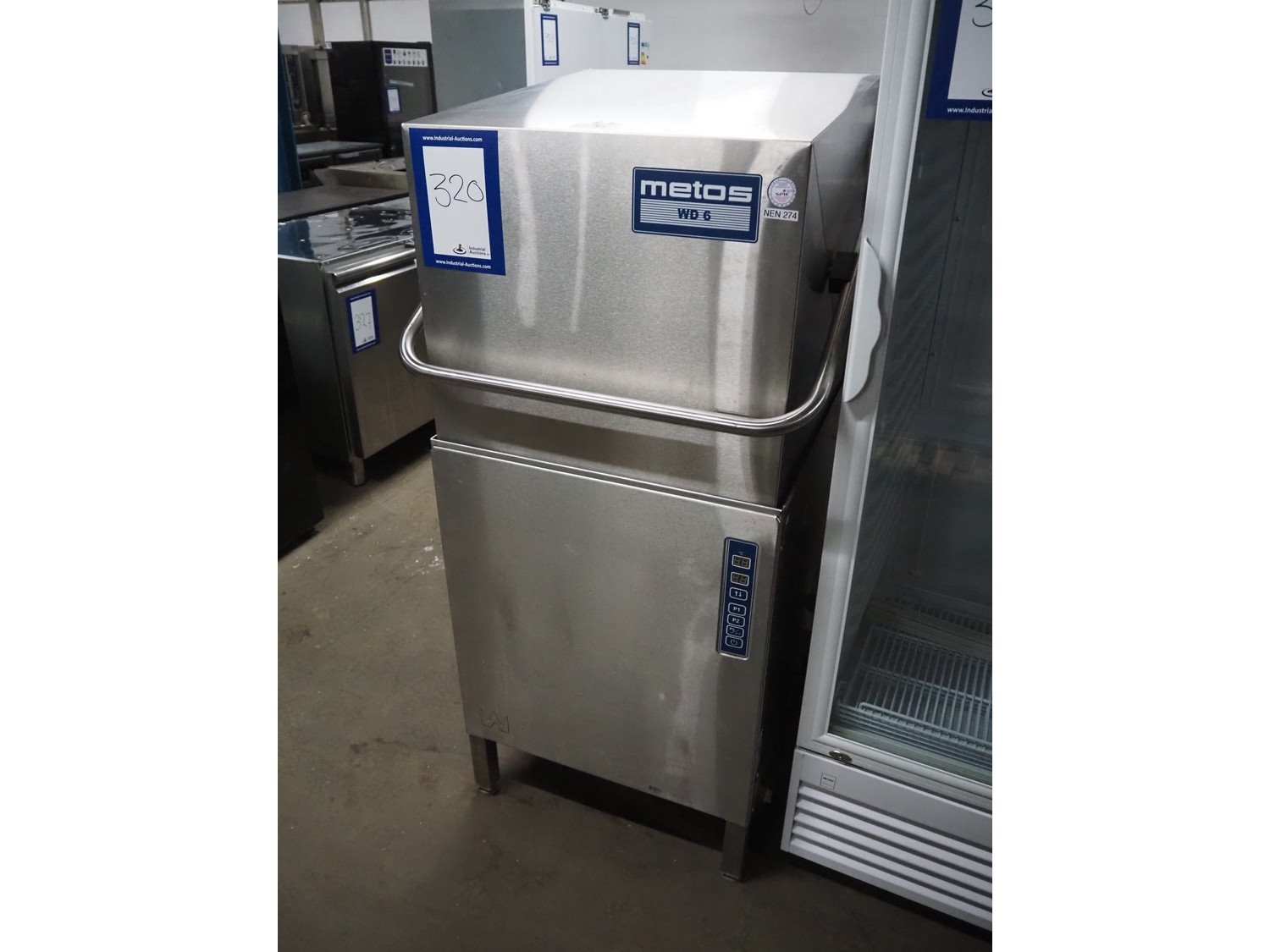 Metos dishwasher, type: WD-6, number: 1022357, year of construction: 2010, 400 V, 3 Ph, 50 Hz, 25 A, 13.8 kW, inside dimensions: 500 mm x 500 mm, total dimensions: 600 mm x 660 mm x 1420 mm.